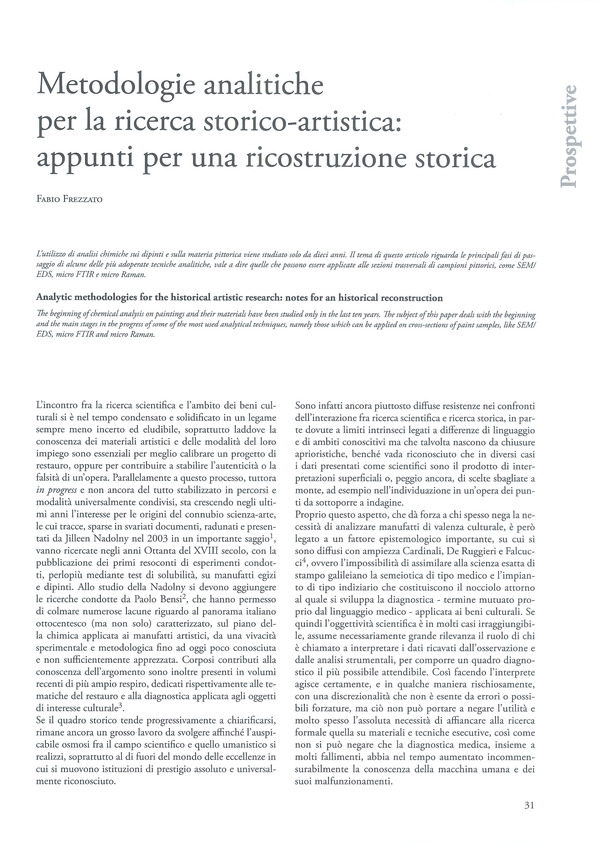 L’utilizzo di analisi chimiche sui dipinti e sulla materia pittorica viene studiato solo da dieci anni. Il tema di questo articolo riguarda le principali fasi di passaggio di alcune delle più adoperate tecniche analitiche, vale a dire quelle che possono essere applicate alle sezioni trasversali di campioni pittorici, come SEM/EDS, micro FTIR e micro Raman.