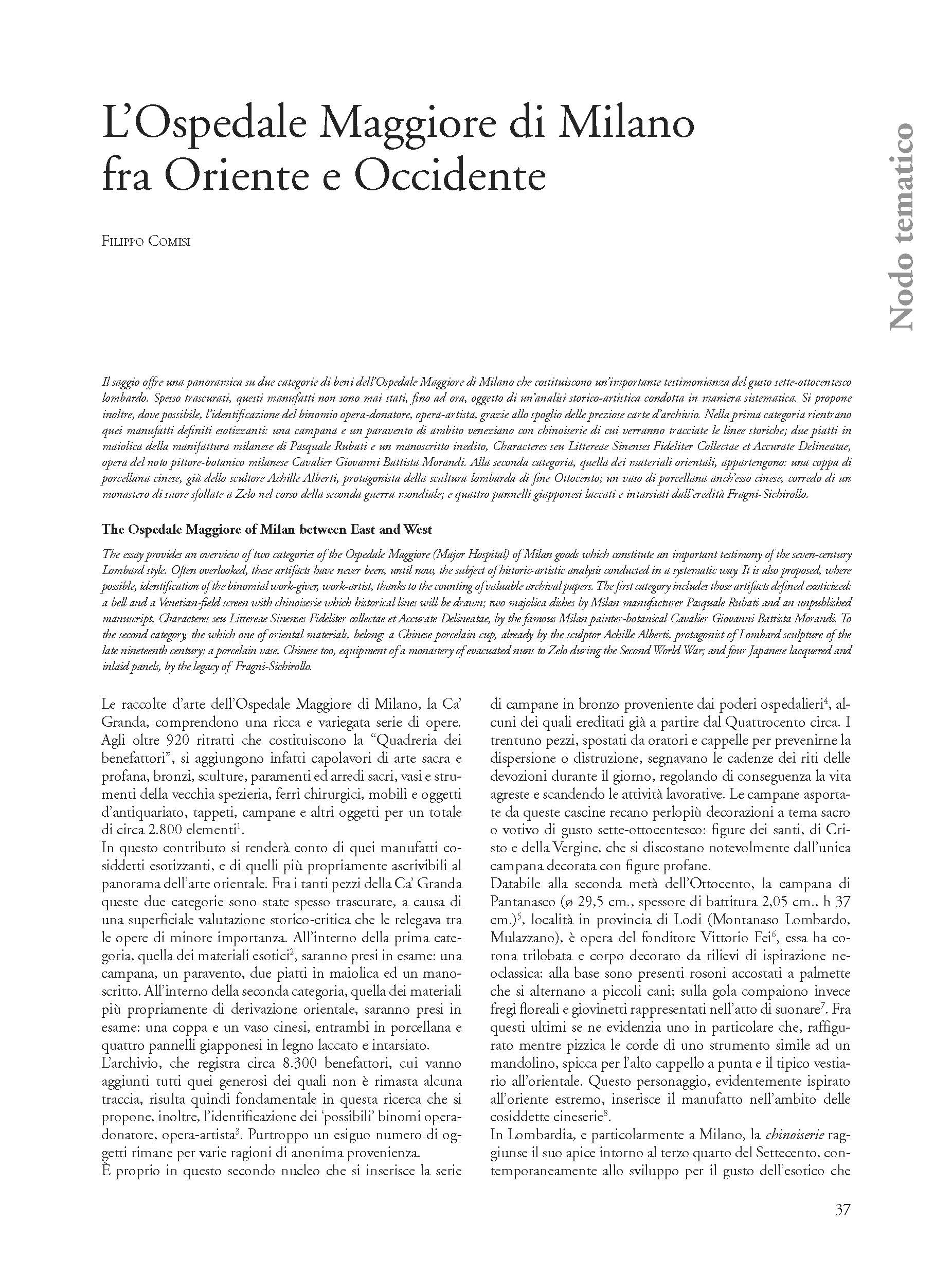 Il saggio offre una panoramica su due categorie di beni dell’Ospedale Maggiore di Milano che costituiscono un’importante testimonianza del gusto sette-ottocentesco lombardo. Spesso trascurati, questi manufatti non sono mai stati, fino ad ora, oggetto di un’analisi storico-artistica condotta in maniera sistematica. Si propone inoltre, dove possibile, l’identificazione del binomio opera-donatore, opera-artista, grazie allo spoglio delle preziose carte d’archivio. Nella prima categoria rientrano quei manufatti definiti esotizzanti: una campana e un paravento di ambito veneziano con chinoiserie di cui verranno tracciate le linee storiche; due piatti in maiolica della manifattura milanese di Pasquale Rubati e un manoscritto inedito, Characteres seu Littereae Sinenses Fideliter Collectae et Accurate Delineatae, opera del noto pittore-botanico milanese Cavalier Giovanni Battista Morandi. Alla seconda categoria, quella dei materiali orientali, appartengono: una coppa di porcellana cinese, già dello scultore Achille Alberti, protagonista della scultura lombarda di fine Ottocento; un vaso di porcellana anch’esso cinese, corredo di un monastero di suore sfollate a Zelo nel corso della seconda guerra mondiale; e quattro pannelli giapponesi laccati e intarsiati dall’eredità Fragni-Sichirollo.