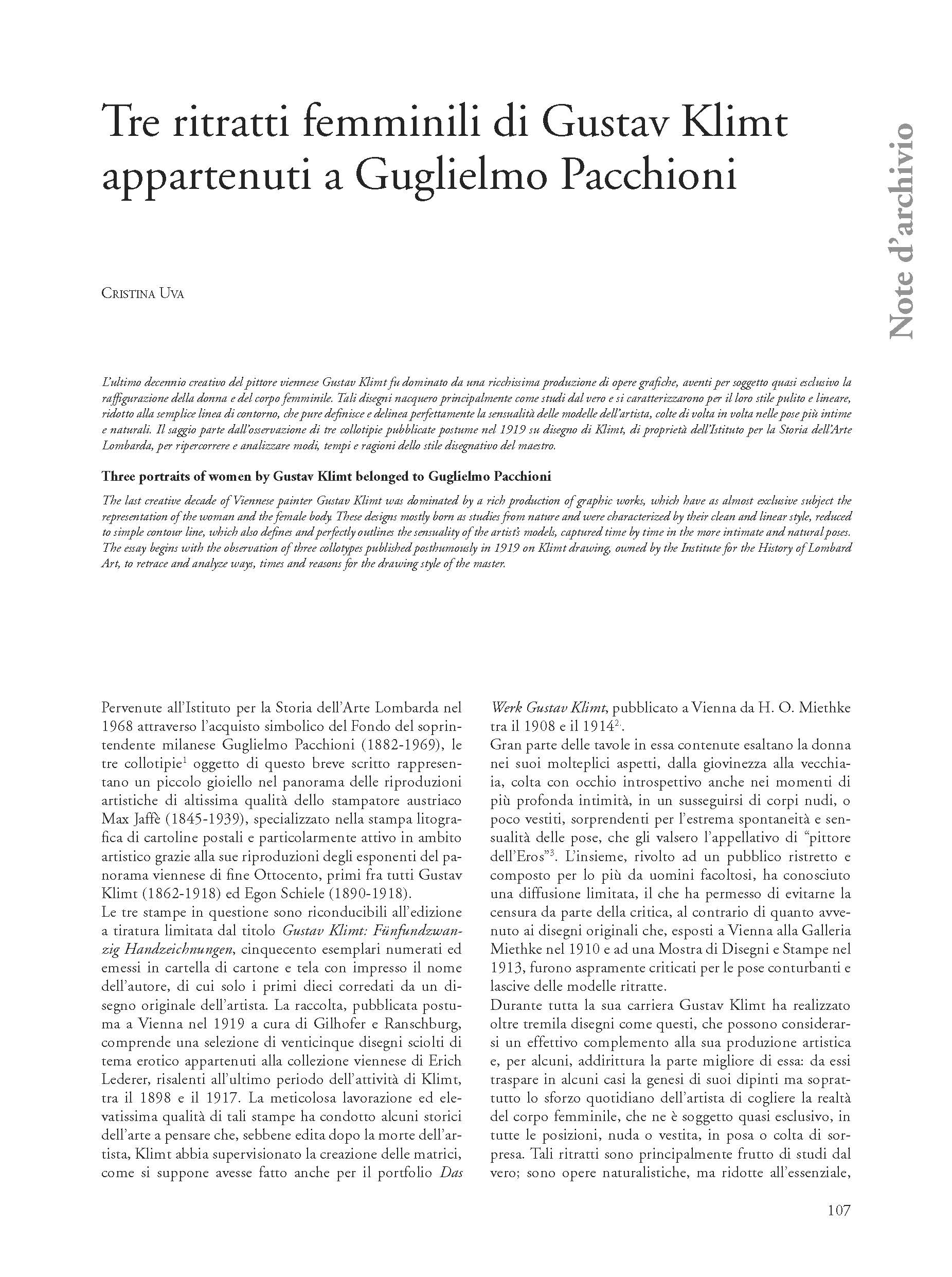 L’ultimo decennio creativo del pittore viennese Gustav Klimt fu dominato da una ricchissima produzione di opere grafiche, aventi per soggetto quasi esclusivo la raffigurazione della donna e del corpo femminile. Tali disegni nacquero principalmente come studi dal vero e si caratterizzarono per il loro stile pulito e lineare, ridotto alla semplice linea di contorno, che pure definisce e delinea perfettamente la sensualità delle modelle dell’artista, colte di volta in volta nelle pose più intime e naturali. Il saggio parte dall’osservazione di tre collotipie pubblicate postume nel 1919 su disegno di Klimt, di proprietà dell’Istituto per la Storia dell’Arte Lombarda, per ripercorrere e analizzare modi, tempi e ragioni dello stile disegnativo del maestro.