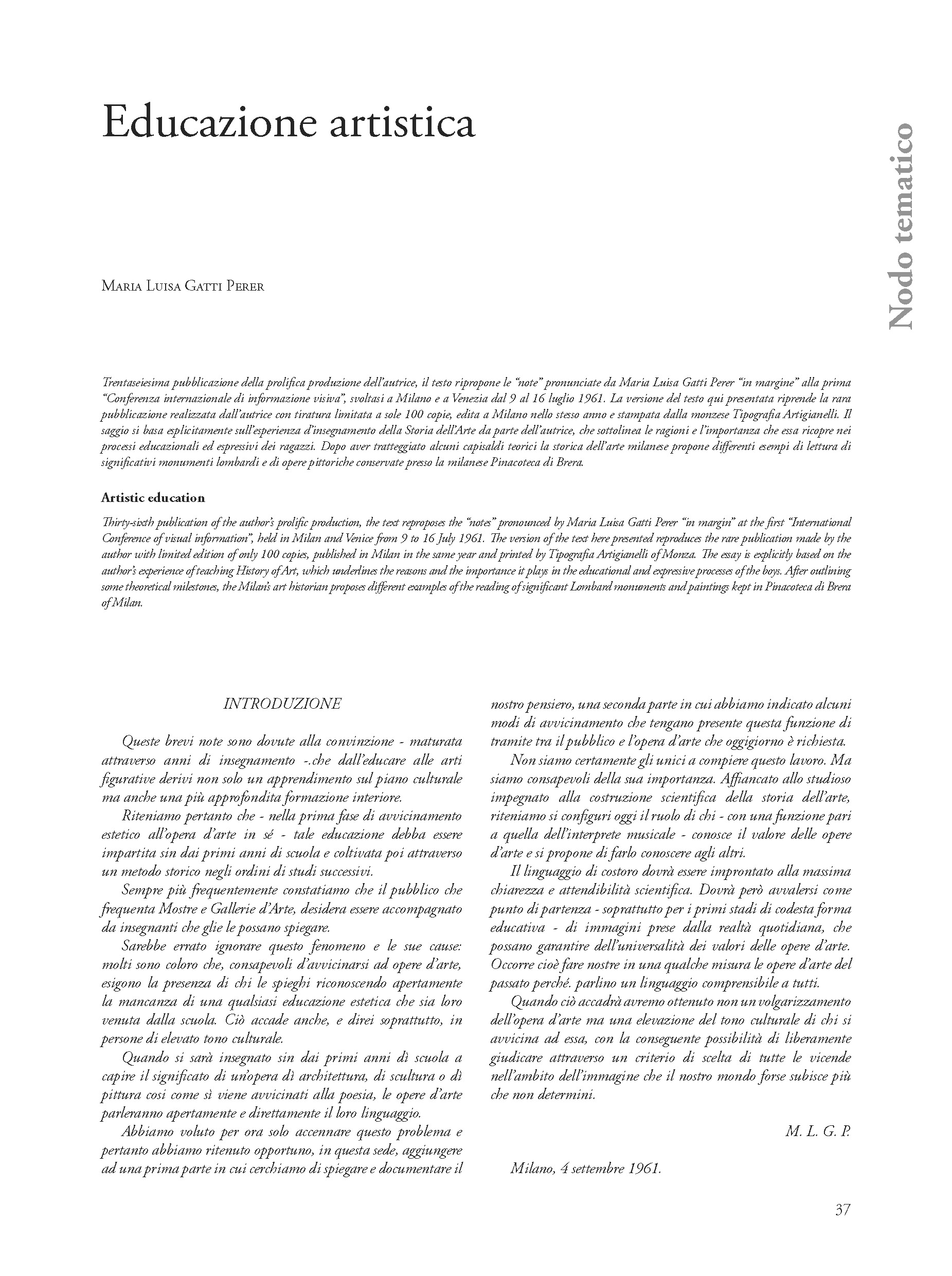 Trentaseiesima pubblicazione della prolifica produzione dell’autrice, il testo ripropone le “note” pronunciate da Maria Luisa Gatti Perer “in margine” alla prima “Conferenza internazionale di informazione visiva”, svoltasi a Milano e a Venezia dal 9 al 16 luglio 1961. La versione del testo qui presentata riprende la rara pubblicazione realizzata dall’autrice con tiratura limitata a sole 100 copie, edita a Milano nello stesso anno e stampata dalla monzese Tipografia Artigianelli. Il saggio si basa esplicitamente sull’esperienza d’insegnamento della Storia dell’Arte da parte dell’autrice, che sottolinea le ragioni e l’importanza che essa ricopre nei processi educazionali ed espressivi dei ragazzi. Dopo aver tratteggiato alcuni capisaldi teorici la storica dell’arte milanese propone differenti esempi di lettura di significativi monumenti lombardi e di opere pittoriche conservate presso la milanese Pinacoteca di Brera.