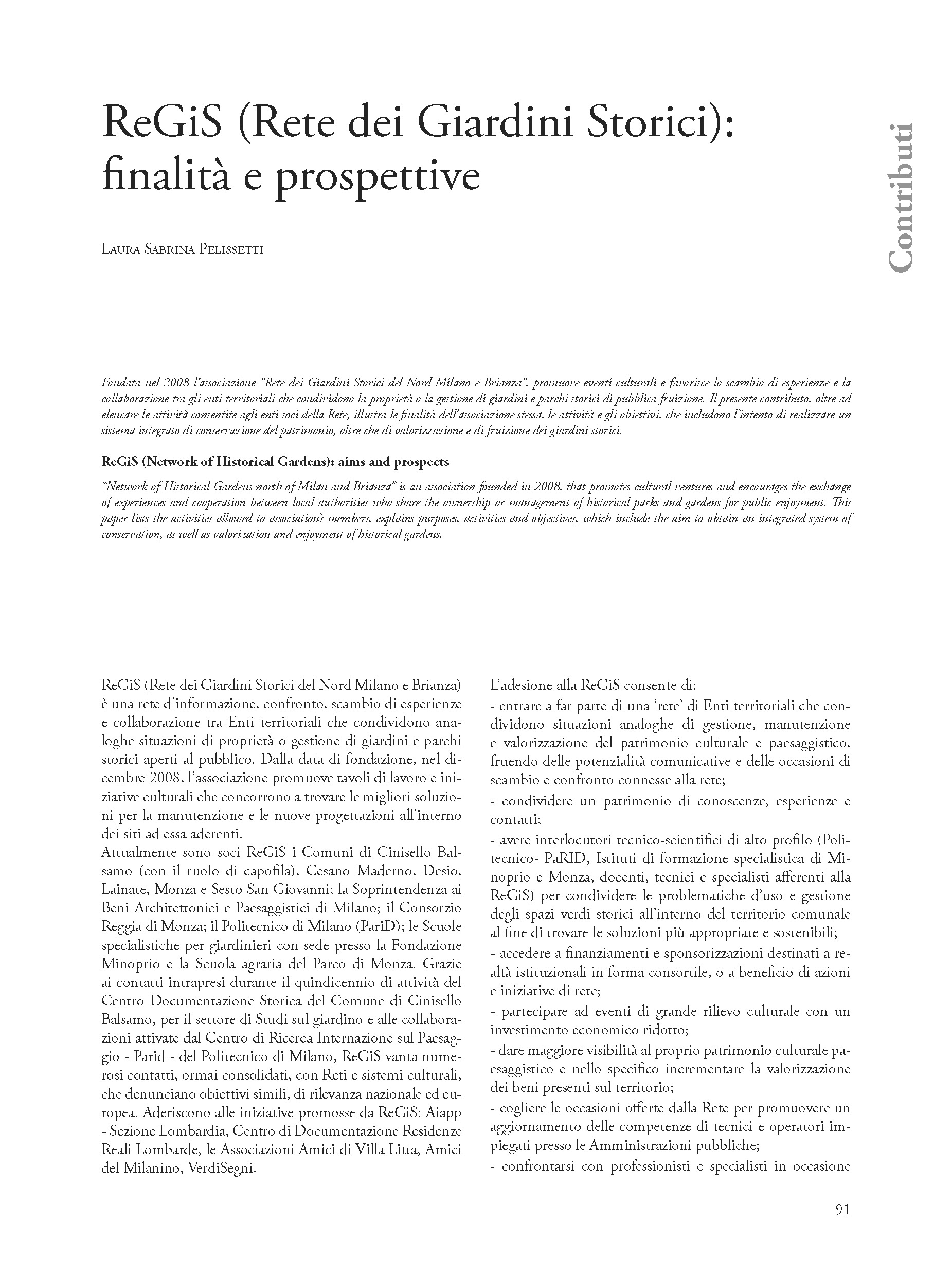 “Network of Historical Gardens north of Milan and Brianza” is an association founded in 2008, that promotes cultural ventures and encourages the exchange of experiences and cooperation between local authorities who share the ownership or management of historical parks and gardens for public enjoyment. This paper lists the activities allowed to association’s members, explains purposes, activities and objectives, which include the aim to obtain an integrated system of conservation, as well as valorization and enjoyment of historical gardens.
