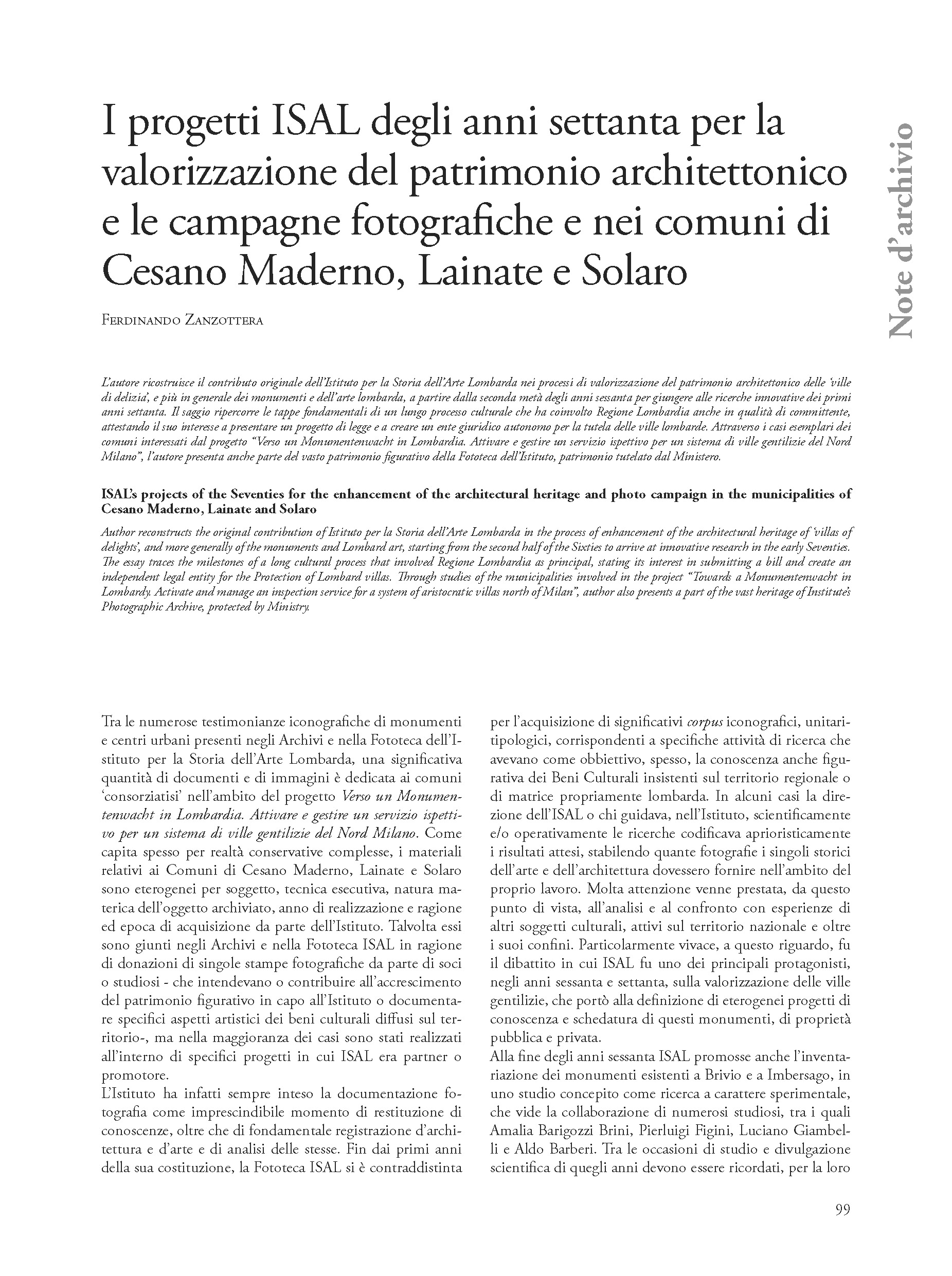 L’autore ricostruisce il contributo originale dell’Istituto per la Storia dell’Arte Lombarda nei processi di valorizzazione del patrimonio architettonico delle ‘ville di delizia’, e più in generale dei monumenti e dell’arte lombarda, a partire dalla seconda metà degli anni sessanta per giungere alle ricerche innovative dei primi anni settanta. Il saggio ripercorre le tappe fondamentali di un lungo processo culturale che ha coinvolto Regione Lombardia anche in qualità di committente, attestando il suo interesse a presentare un progetto di legge e a creare un ente giuridico autonomo per la tutela delle ville lombarde. Attraverso i casi esemplari dei comuni interessati dal progetto “Verso un Monumentenwacht in Lombardia. Attivare e gestire un servizio ispettivo per un sistema di ville gentilizie del Nord Milano”, l’autore presenta anche parte del vasto patrimonio figurativo della Fototeca dell’Istituto, patrimonio tutelato dal Ministero.