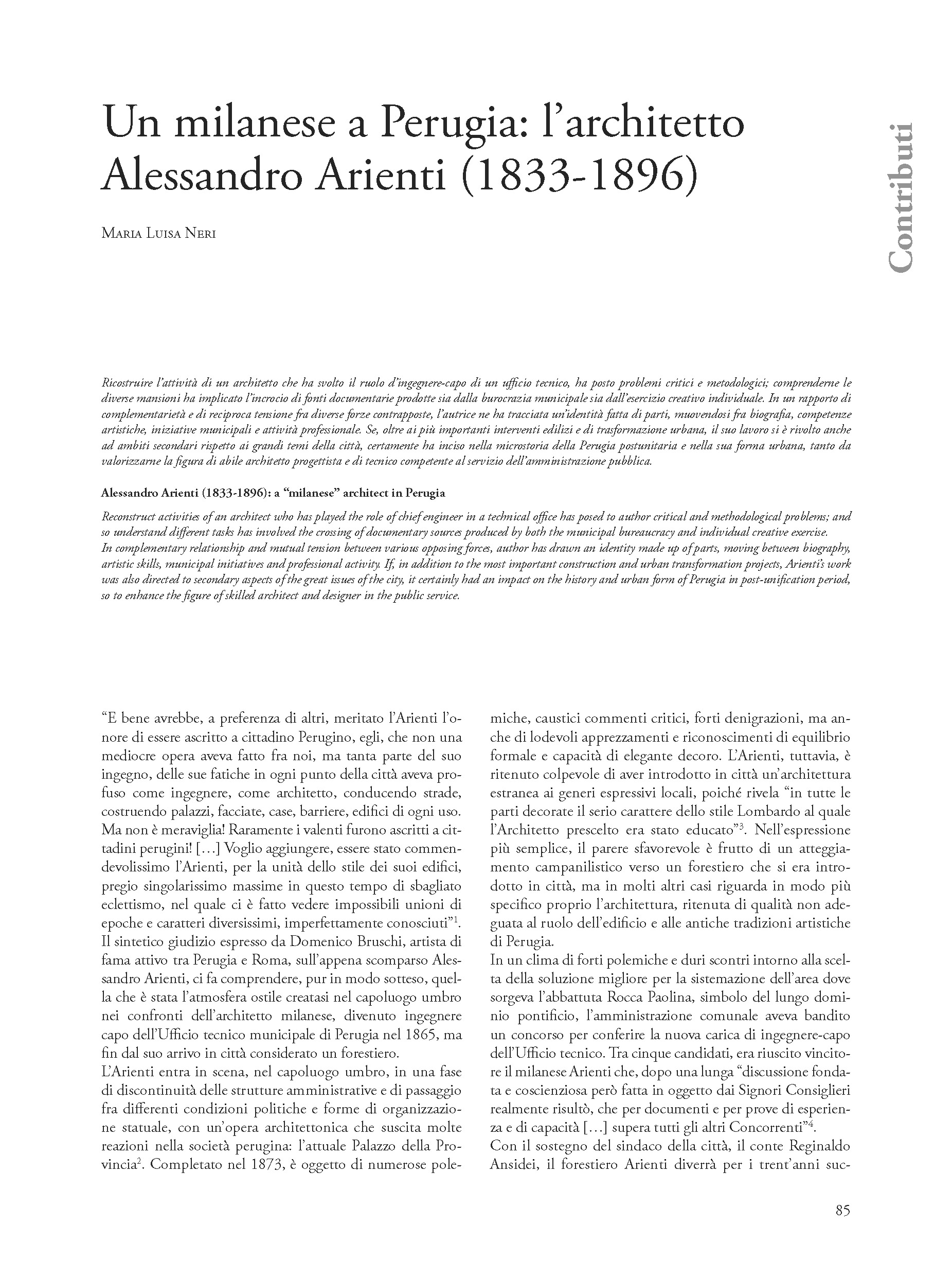 Reconstruct activities of an architect who has played the role of chief engineer in a technical office has posed to author critical and methodological problems; and so understand different tasks has involved the crossing of documentary sources produced by both the municipal bureaucracy and individual creative exercise. In complementary relationship and mutual tension between various opposing forces, author has drawn an identity made up of parts, moving between biography, artistic skills, municipal initiatives and professional activity. If, in addition to the most important construction and urban transformation projects, Arienti’s work was also directed to secondary aspects of the great issues of the city, it certainly had an impact on the history and urban form of Perugia in post-unification period, so to enhance the figure of skilled architect and designer in the public service.