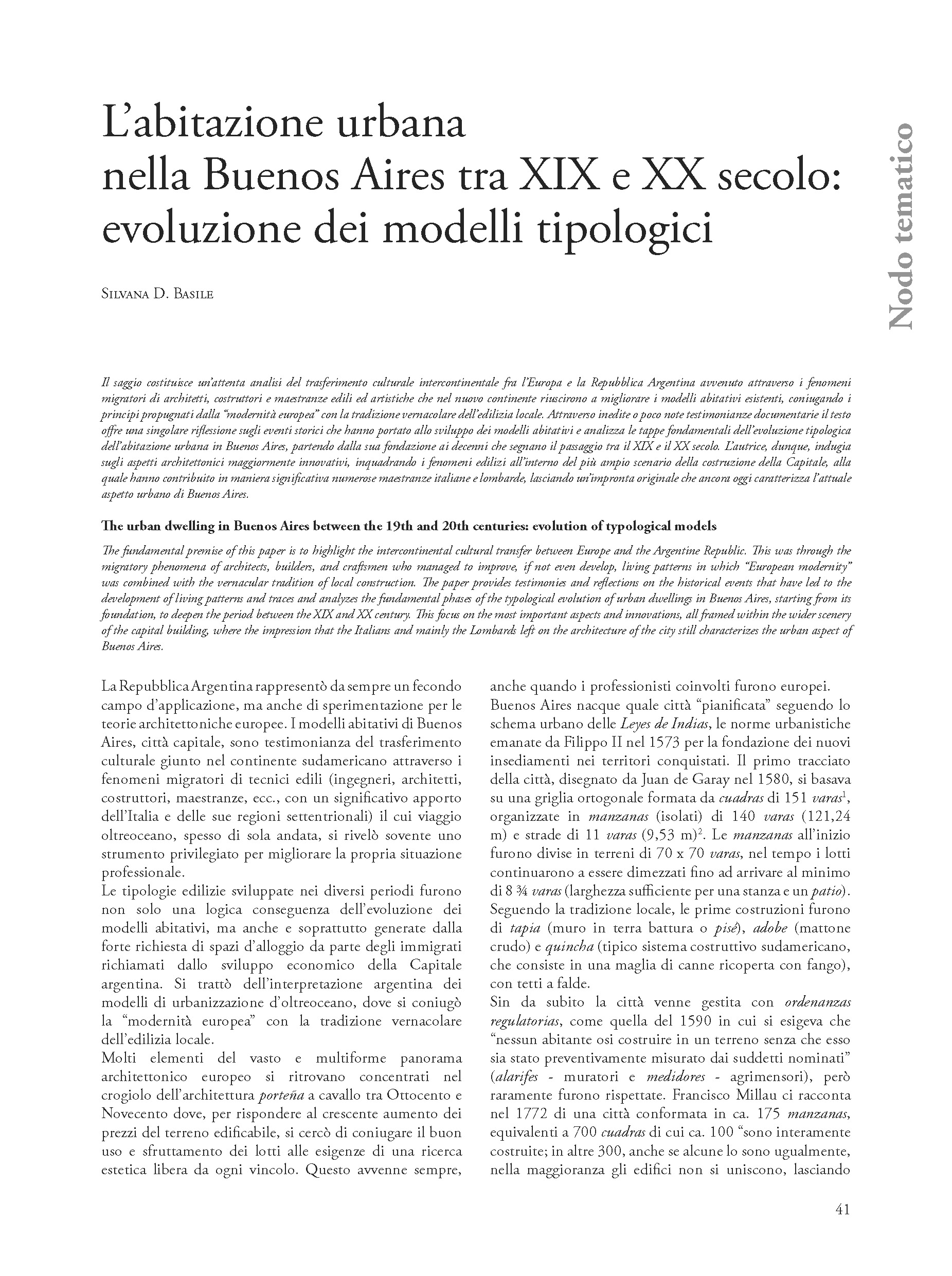 Il saggio costituisce un’attenta analisi del trasferimento culturale intercontinentale fra l’Europa e la Repubblica Argentina avvenuto attraverso i fenomeni migratori di architetti, costruttori e maestranze edili ed artistiche che nel nuovo continente riuscirono a migliorare i modelli abitativi esistenti, coniugando i principi propugnati dalla “modernità europea” con la tradizione vernacolare dell’edilizia locale. Attraverso inedite o poco note testimonianze documentarie il testo offre una singolare riflessione sugli eventi storici che hanno portato allo sviluppo dei modelli abitativi e analizza le tappe fondamentali dell’evoluzione tipologica dell’abitazione urbana in Buenos Aires, partendo dalla sua fondazione ai decenni che segnano il passaggio tra il XIX e il XX secolo. L’autrice, dunque, indugia sugli aspetti architettonici maggiormente innovativi, inquadrando i fenomeni edilizi all’interno del più ampio scenario della costruzione della Capitale, alla quale hanno contribuito in maniera significativa numerose maestranze italiane e lombarde, lasciando un’impronta originale che ancora oggi caratterizza l’attuale aspetto urbano di Buenos Aires.
