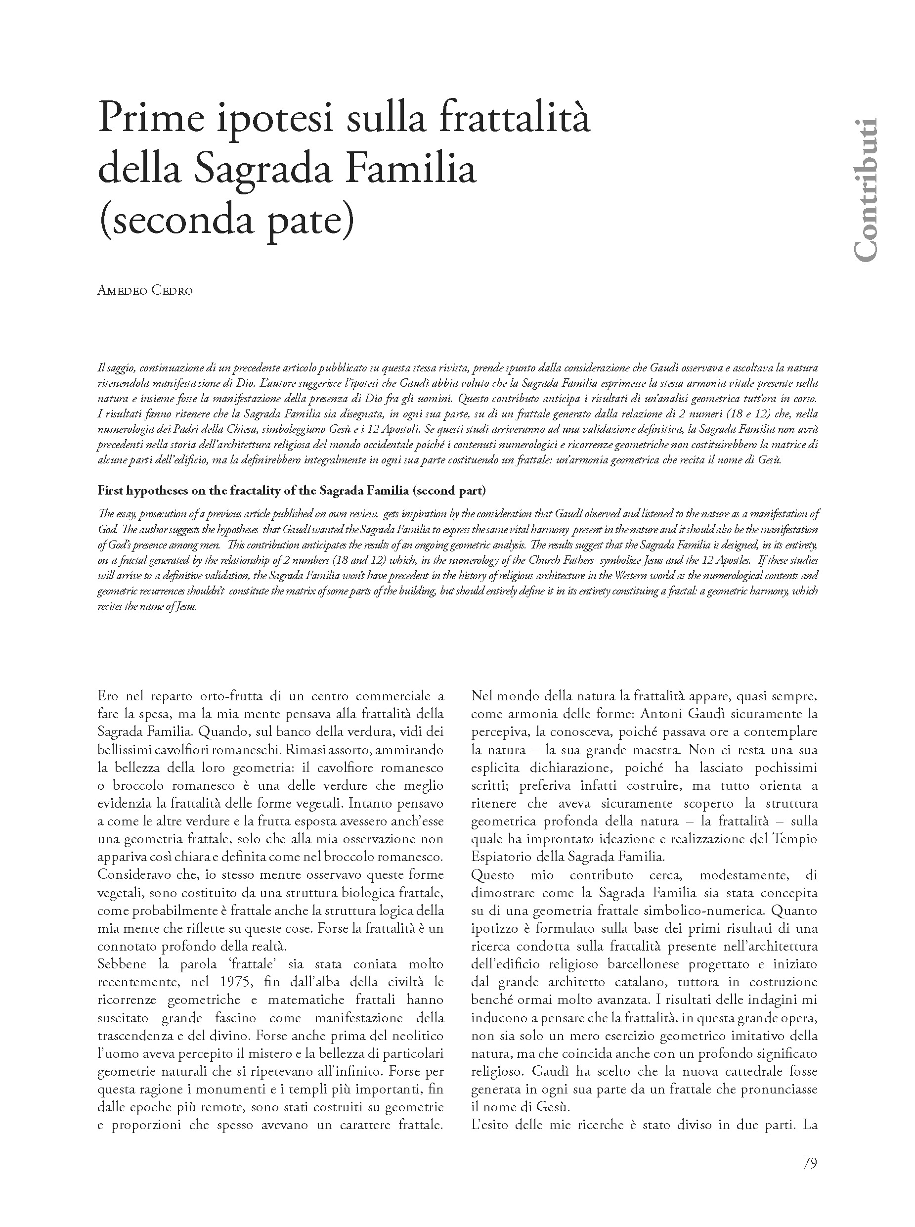 Il saggio, continuazione di un precedente articolo pubblicato su questa stessa rivista, prende spunto dalla considerazione che Gaudì osservava e ascoltava la natura ritenendola manifestazione di Dio. L’autore suggerisce l’ipotesi che Gaudì abbia voluto che la Sagrada Familia esprimesse la stessa armonia vitale presente nella natura e insieme fosse la manifestazione della presenza di Dio fra gli uomini. Questo contributo anticipa i risultati di un’analisi geometrica tutt’ora in corso. I risultati fanno ritenere che la Sagrada Familia sia disegnata, in ogni sua parte, su di un frattale generato dalla relazione di 2 numeri (18 e 12) che, nella numerologia dei Padri della Chiesa, simboleggiano Gesù e i 12 Apostoli. Se questi studi arriveranno ad una validazione definitiva, la Sagrada Familia non avrà precedenti nella storia dell’architettura religiosa del mondo occidentale poiché i contenuti numerologici e ricorrenze geometriche non costituirebbero la matrice di alcune parti dell’edificio, ma la definirebbero integralmente in ogni sua parte costituendo un frattale: un’armonia geometrica che recita il nome di Gesù.