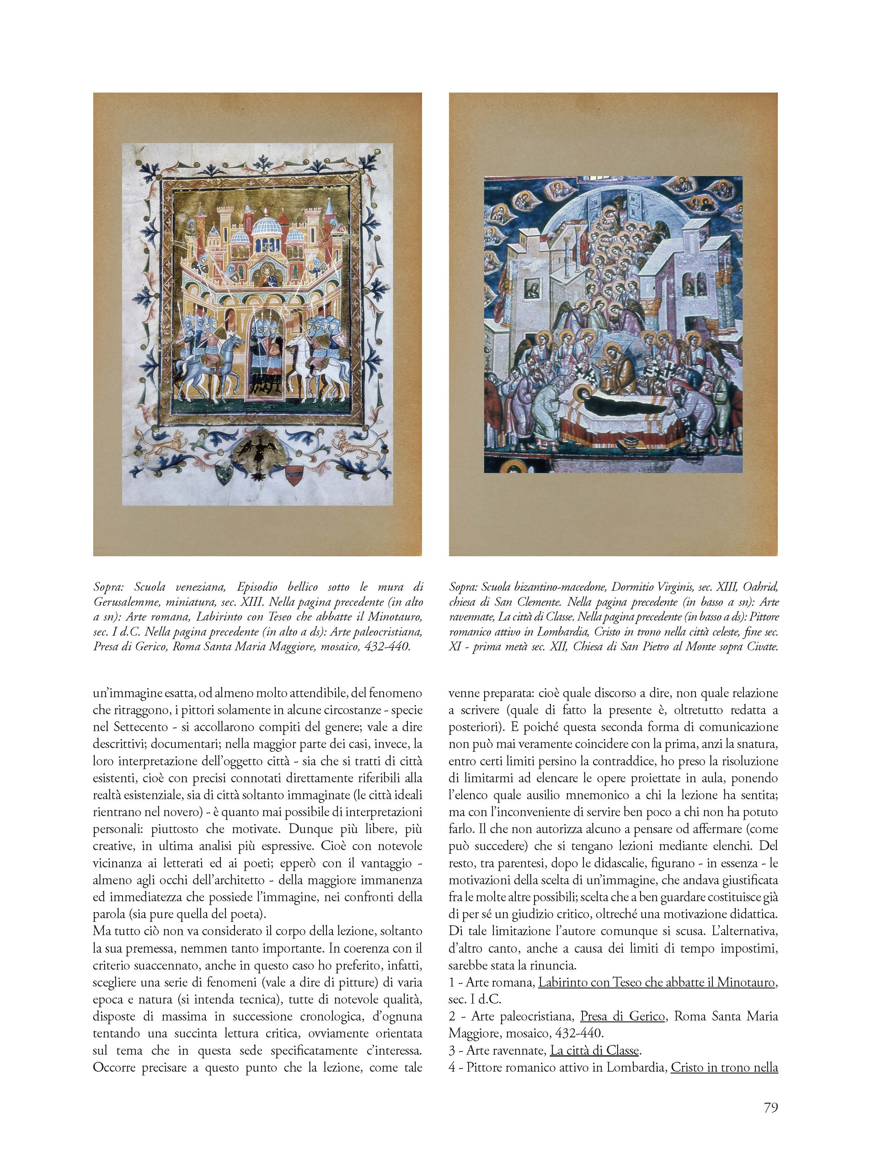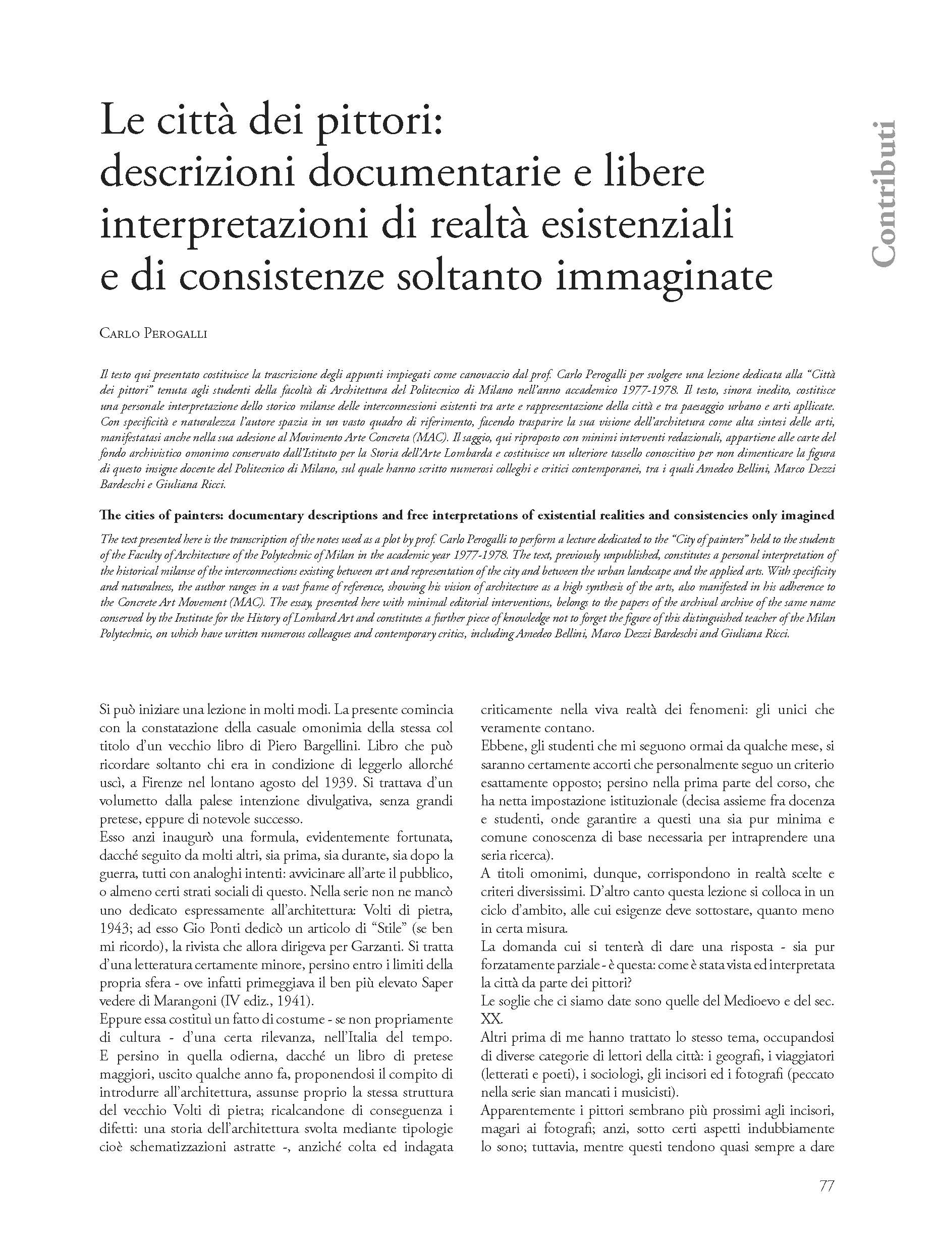 The text presented here is the transcription of the notes used as a plot by prof. Carlo Perogalli to perform a lecture dedicated to the “City of painters” held to the students of the Faculty of Architecture of the Polytechnic of Milan in the academic year 1977-1978. The text, previously unpublished, constitutes a personal interpretation of the historical milanse of the interconnections existing between art and representation of the city and between the urban landscape and the applied arts. With specificity and naturalness, the author ranges in a vast frame of reference, showing his vision of architecture as a high synthesis of the arts, also manifested in his adherence to the Concrete Art Movement (MAC). The essay, presented here with minimal editorial interventions, belongs to the papers of the archival archive of the same name conserved by the Institute for the History of Lombard Art and constitutes a further piece of knowledge not to forget the figure of this distinguished teacher of the Milan Polytechnic, on which have written numerous colleagues and contemporary critics, including Amedeo Bellini, Marco Dezzi Bardeschi and Giuliana Ricci.