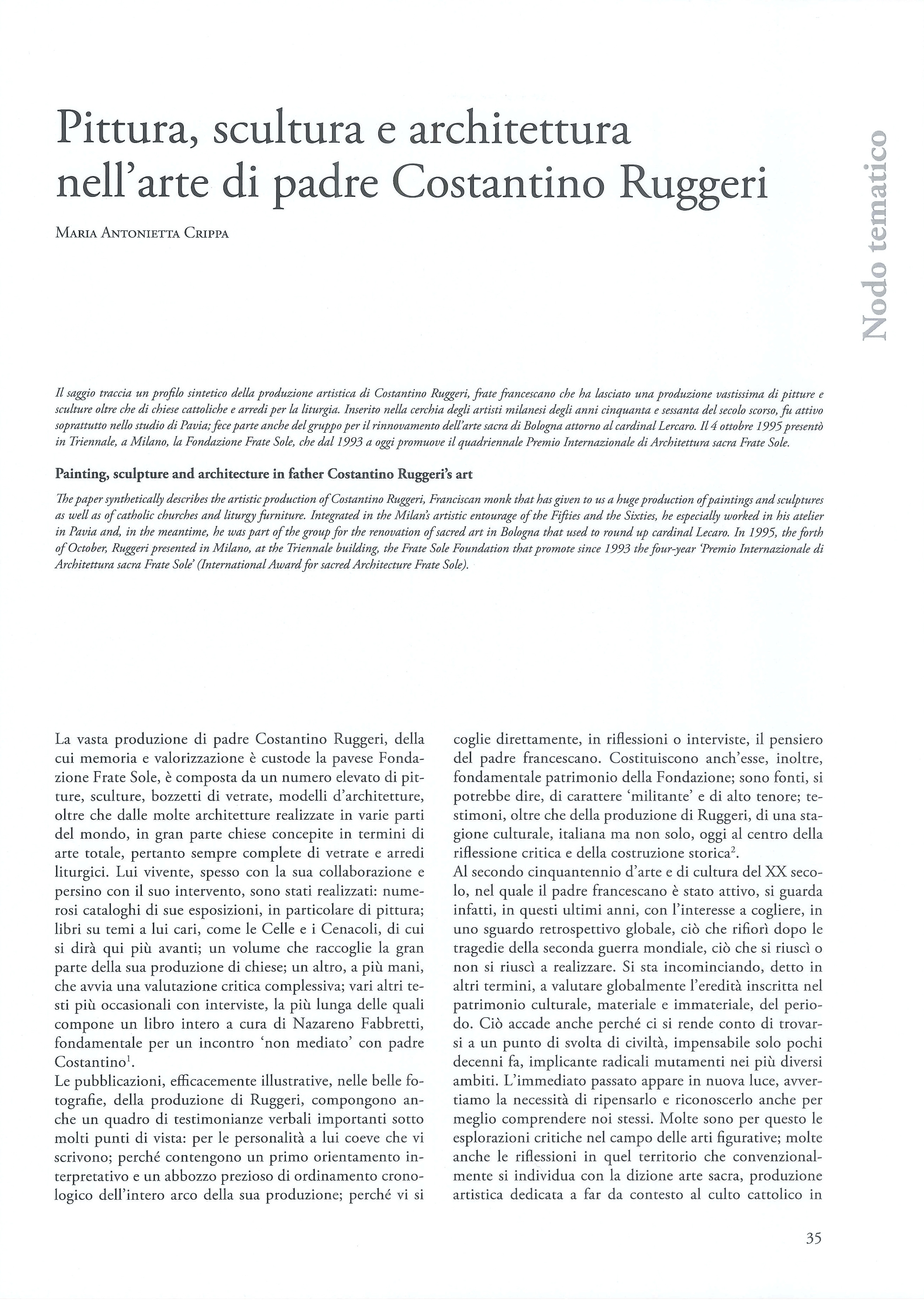 Il saggio traccia un profilo sintetico della produzione artistica di Costantino Ruggeri, frate francescano che ha lasciato una produzione vastissima di pitture e sculture oltre che di chiese cattoliche e arredi per la liturgia. Inserito nella cerchia degli artisti milanesi degli anni cinquanta e sessanta del secolo scorso, fu attivo soprattutto nello studio di Pavia; fece parte anche del gruppo per il rinnovamento dell’arte sacra di Bologna attorno al cardinal Lercaro. Il 4 ottobre 1995 presentò in Triennale, a Milano, la Fondazione Frate Sole, che dal 1993 a oggi promuove il quadriennale Premio Internazionale di Architettura sacra Frate Sole.