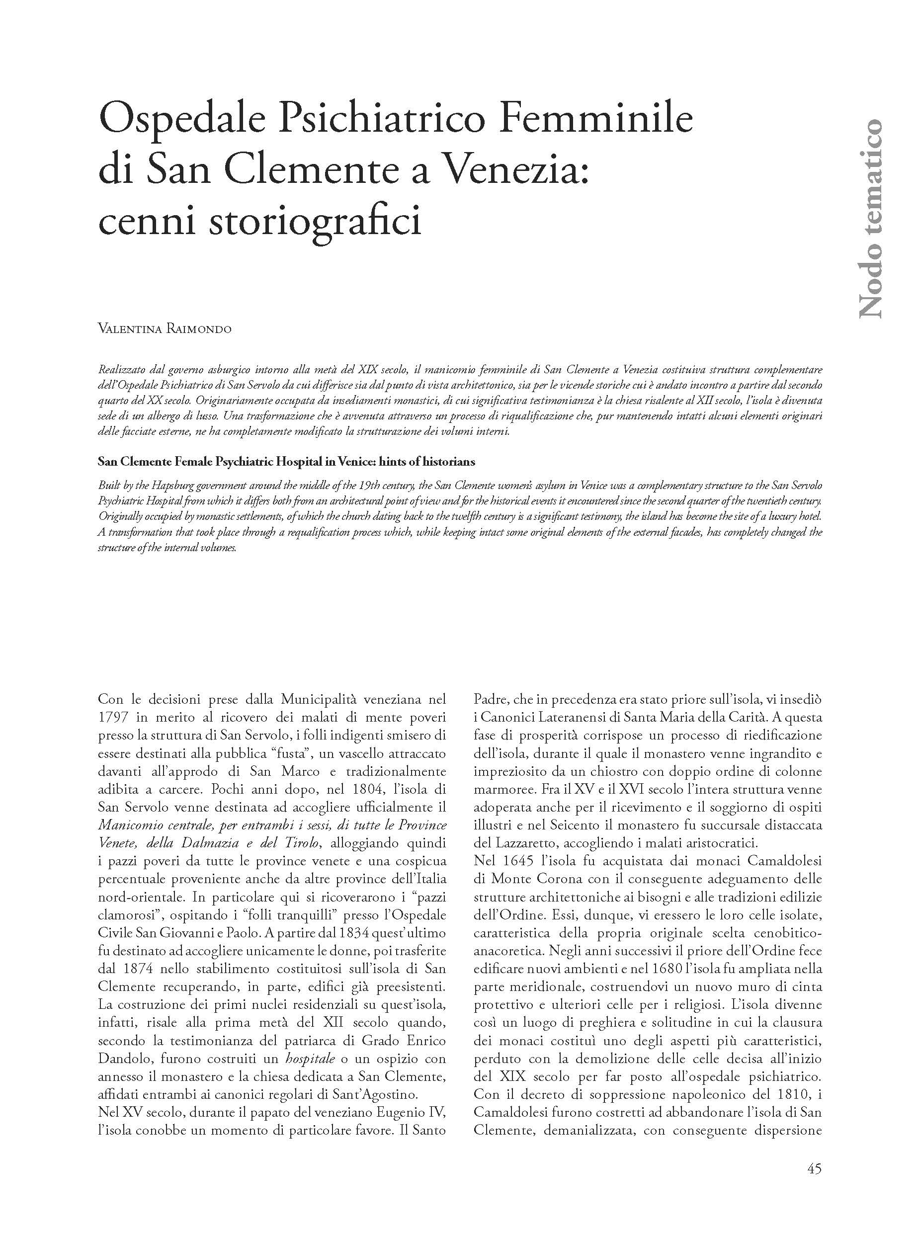 Realizzato dal governo asburgico intorno alla metà del XIX secolo, il manicomio femminile di San Clemente a Venezia costituiva struttura complementare dell’Ospedale Psichiatrico di San Servolo da cui differisce sia dal punto di vista architettonico, sia per le vicende storiche cui è andato incontro a partire dal secondo quarto del XX secolo. Originariamente occupata da insediamenti monastici, di cui significativa testimonianza è la chiesa risalente al XII secolo, l’isola è divenuta sede di un albergo di lusso. Una trasformazione che è avvenuta attraverso un processo di riqualificazione che, pur mantenendo intatti alcuni elementi originari delle facciate esterne, ne ha completamente modificato la strutturazione dei volumi interni.