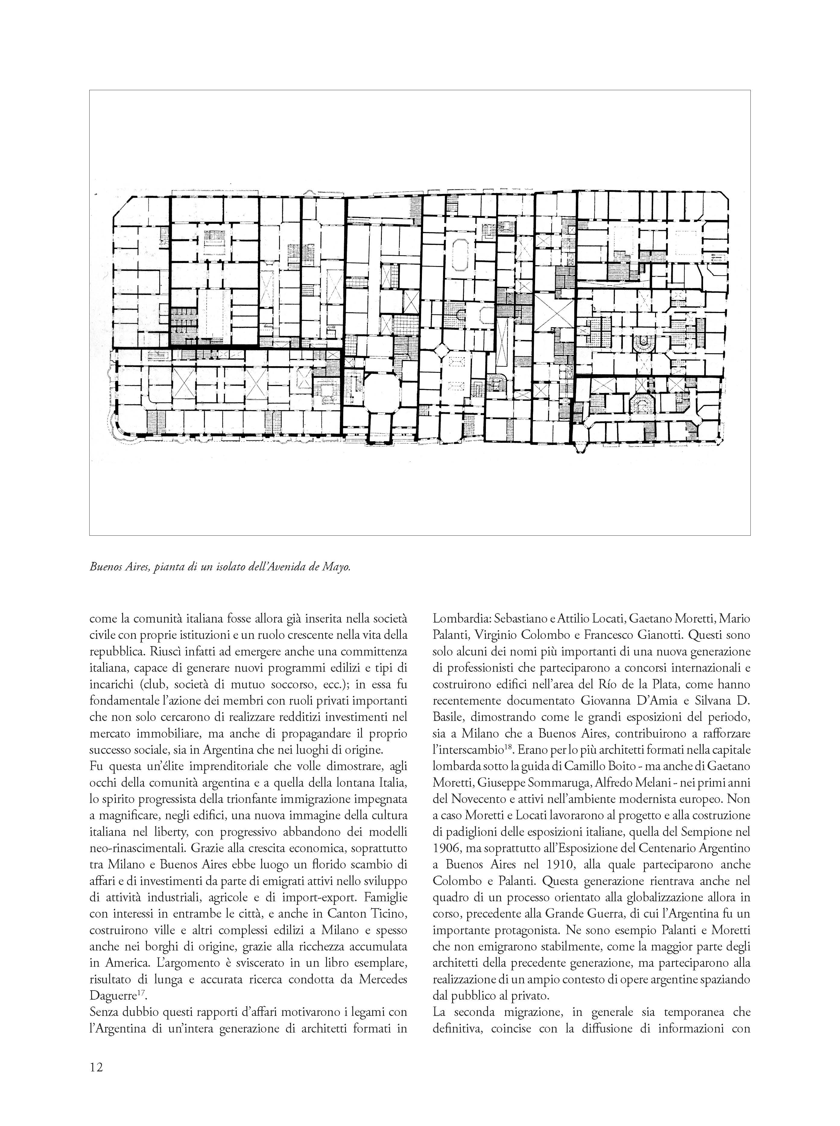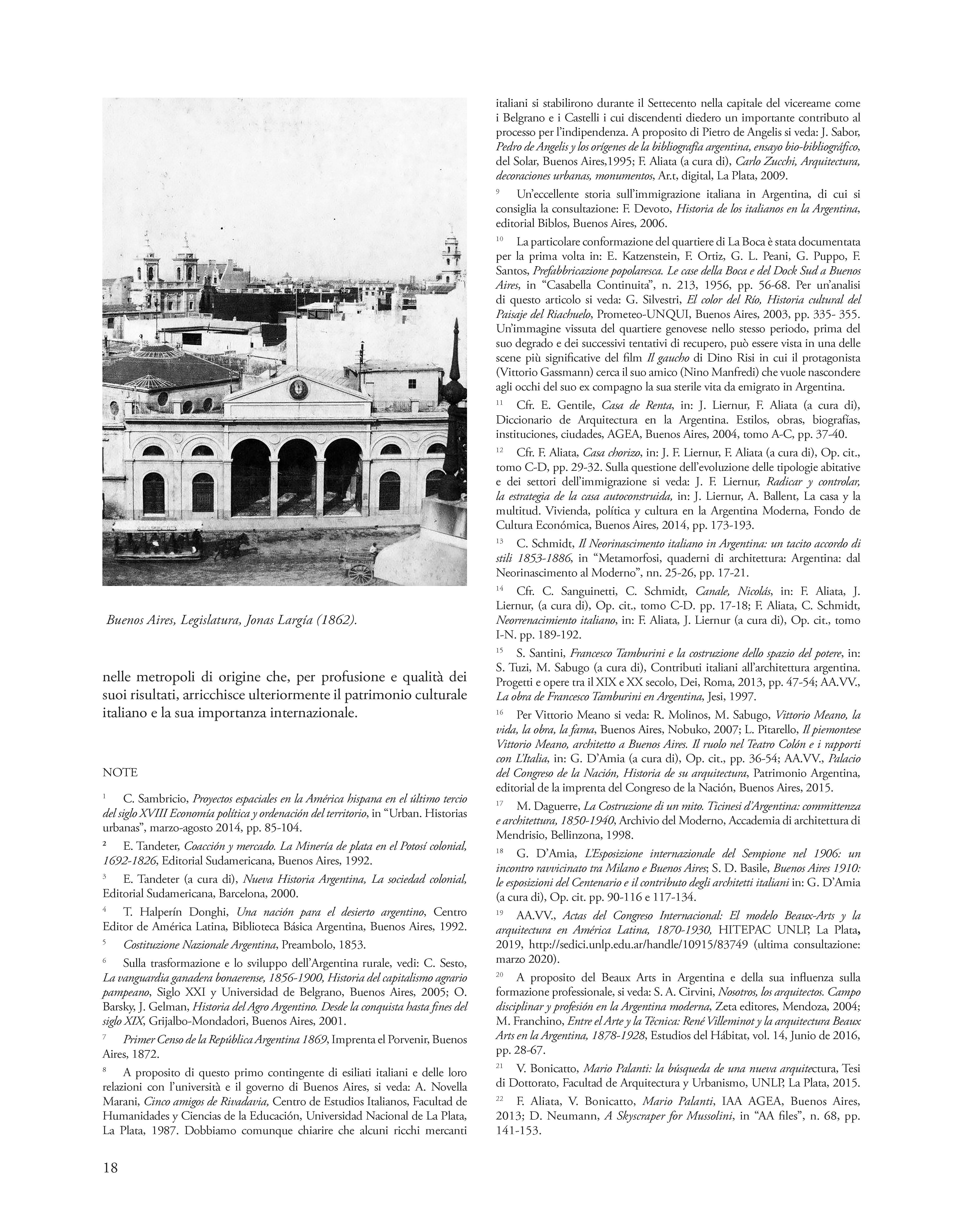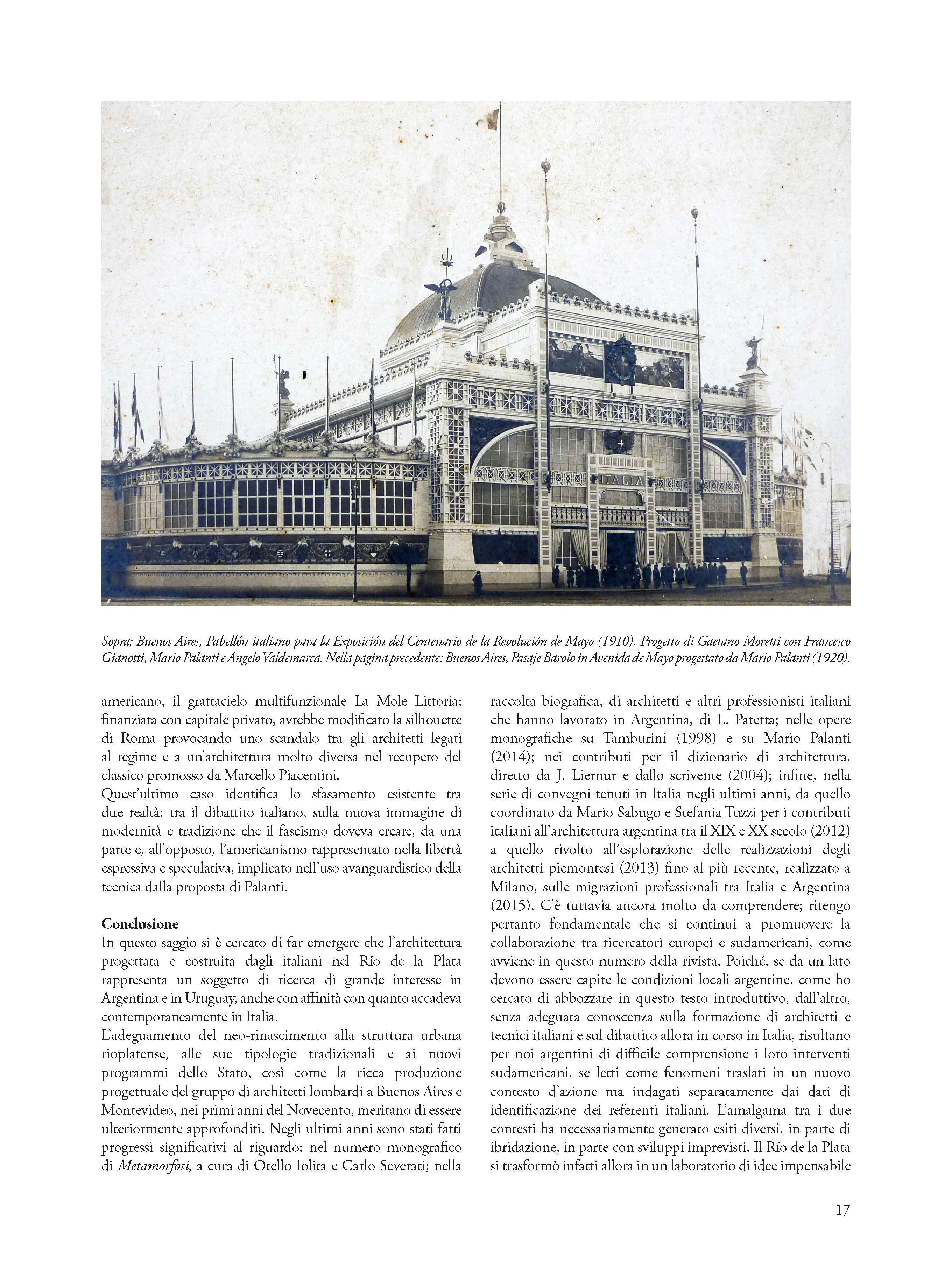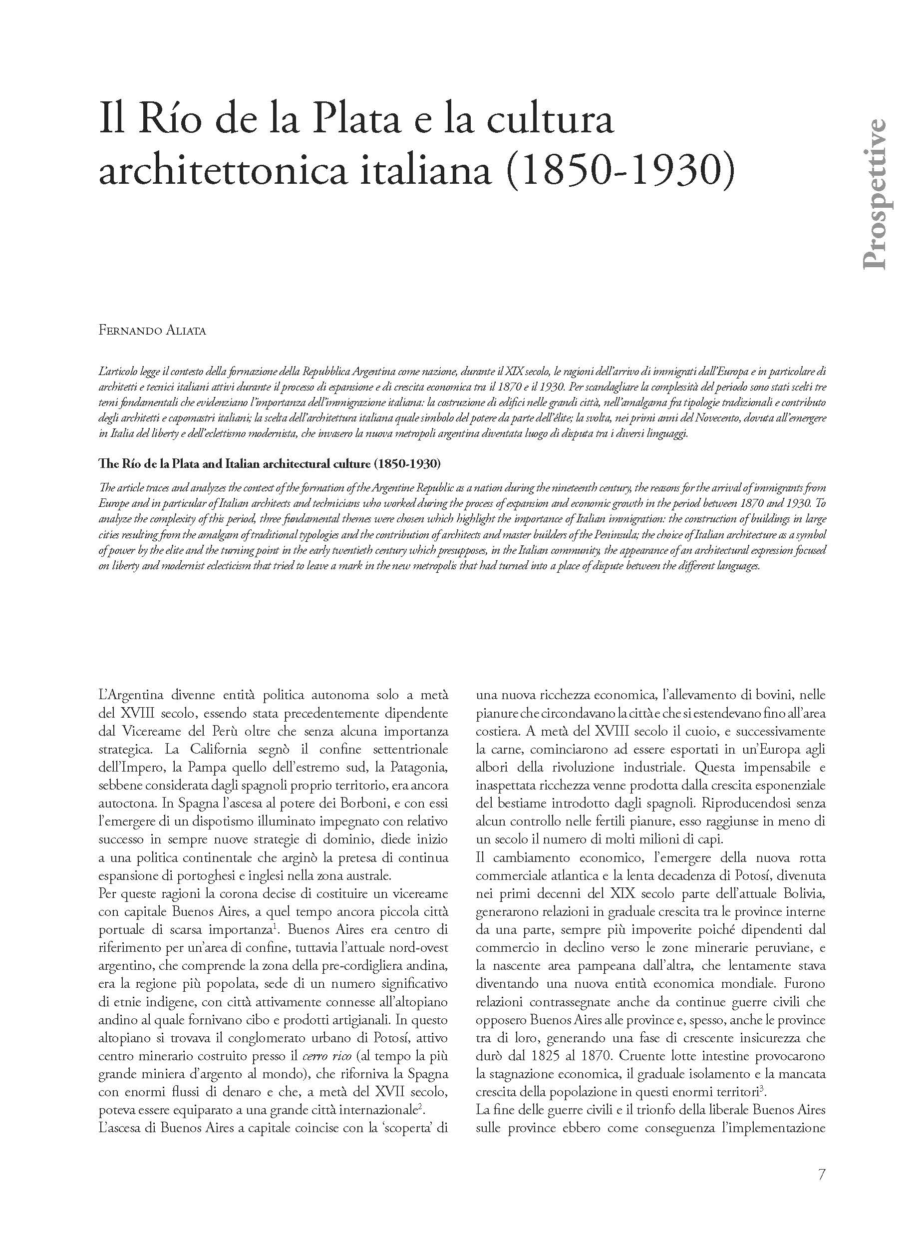 L’articolo legge il contesto della formazione della Repubblica Argentina come nazione, durante il XIX secolo, le ragioni dell’arrivo di immigrati dall’Europa e in particolare di architetti e tecnici italiani attivi durante il processo di espansione e di crescita economica tra il 1870 e il 1930. Per scandagliare la complessità del periodo sono stati scelti tre temi fondamentali che evidenziano l’importanza dell’immigrazione italiana: la costruzione di edifici nelle grandi città, nell’amalgama fra tipologie tradizionali e contributo degli architetti e capomastri italiani; la scelta dell’architettura italiana quale simbolo del potere da parte dell’élite; la svolta, nei primi anni del Novecento, dovuta all’emergere in Italia del liberty e dell’eclettismo modernista, che invasero la nuova metropoli argentina diventata luogo di disputa tra i diversi linguaggi.