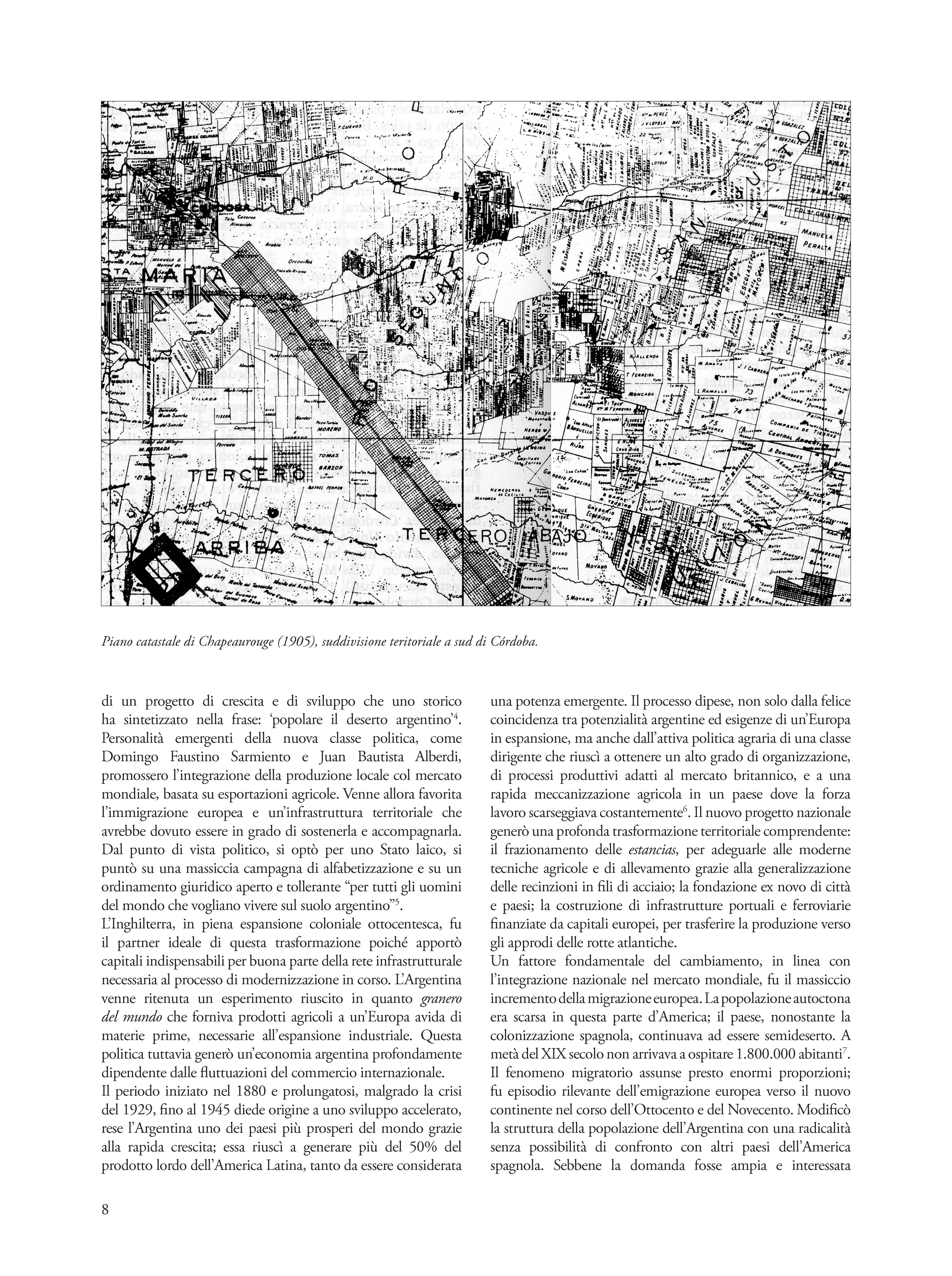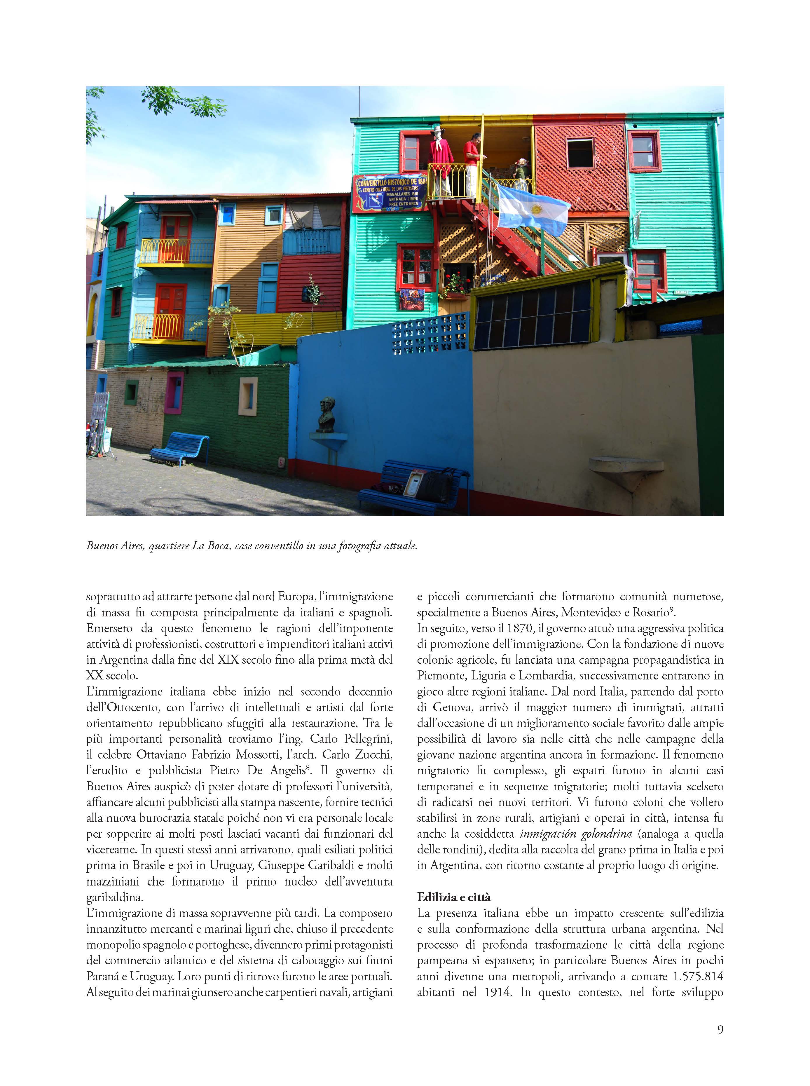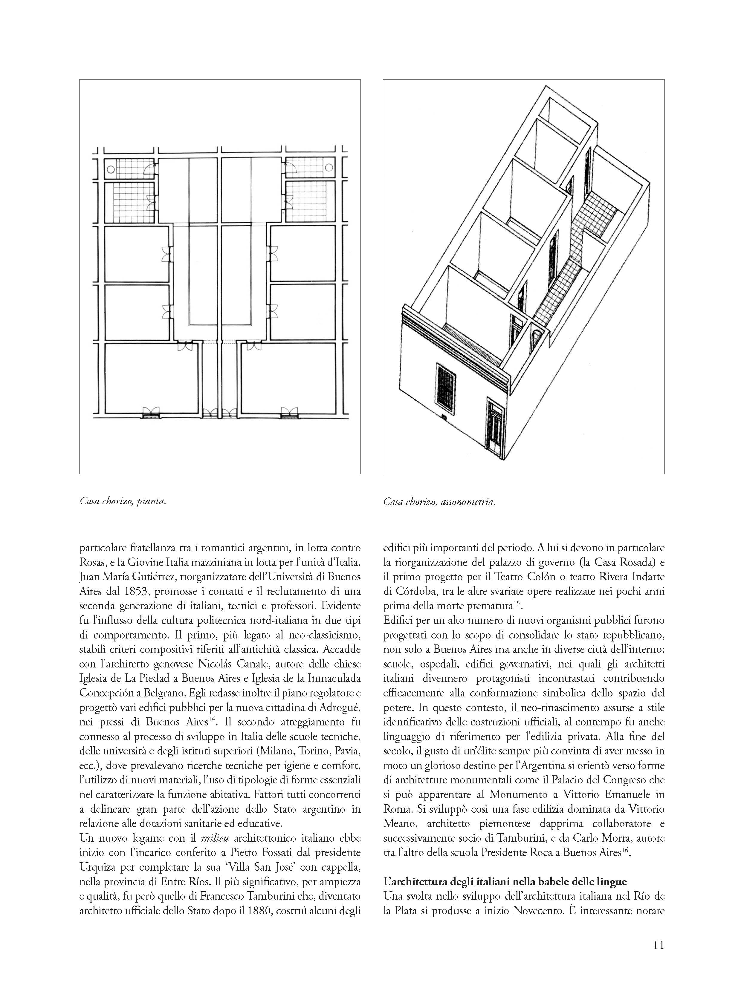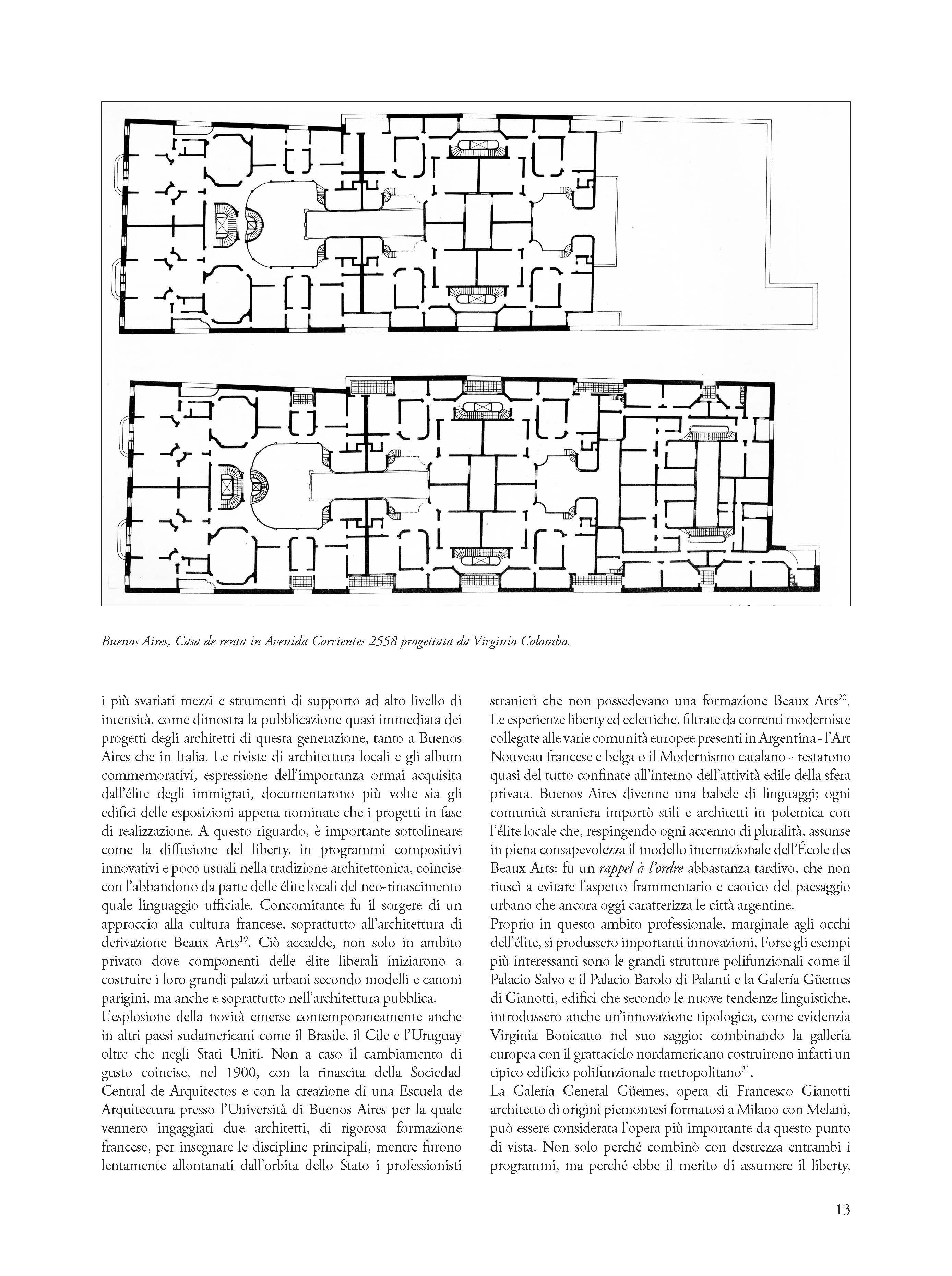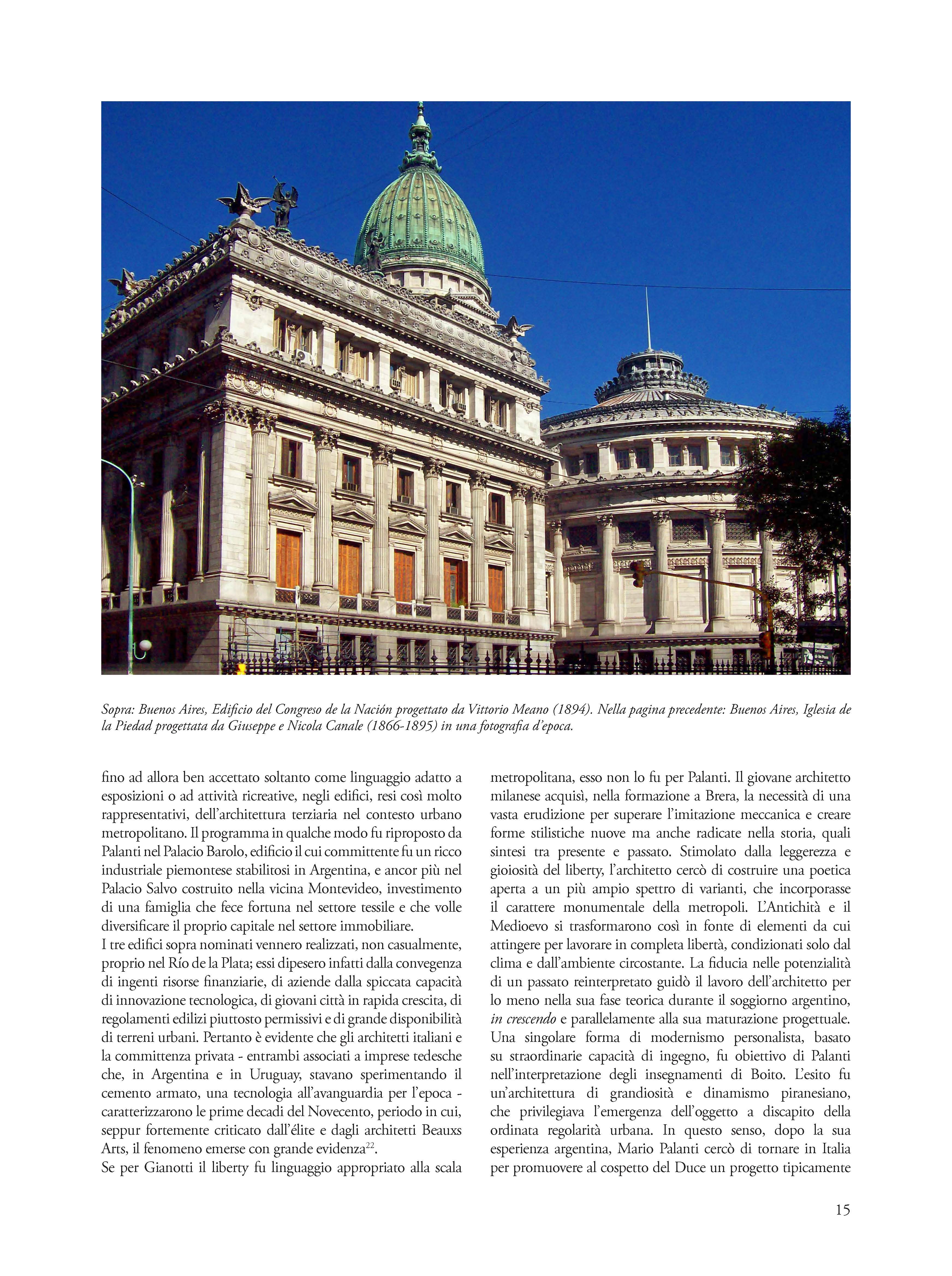 L’articolo legge il contesto della formazione della Repubblica Argentina come nazione, durante il XIX secolo, le ragioni dell’arrivo di immigrati dall’Europa e in particolare di architetti e tecnici italiani attivi durante il processo di espansione e di crescita economica tra il 1870 e il 1930. Per scandagliare la complessità del periodo sono stati scelti tre temi fondamentali che evidenziano l’importanza dell’immigrazione italiana: la costruzione di edifici nelle grandi città, nell’amalgama fra tipologie tradizionali e contributo degli architetti e capomastri italiani; la scelta dell’architettura italiana quale simbolo del potere da parte dell’élite; la svolta, nei primi anni del Novecento, dovuta all’emergere in Italia del liberty e dell’eclettismo modernista, che invasero la nuova metropoli argentina diventata luogo di disputa tra i diversi linguaggi.
