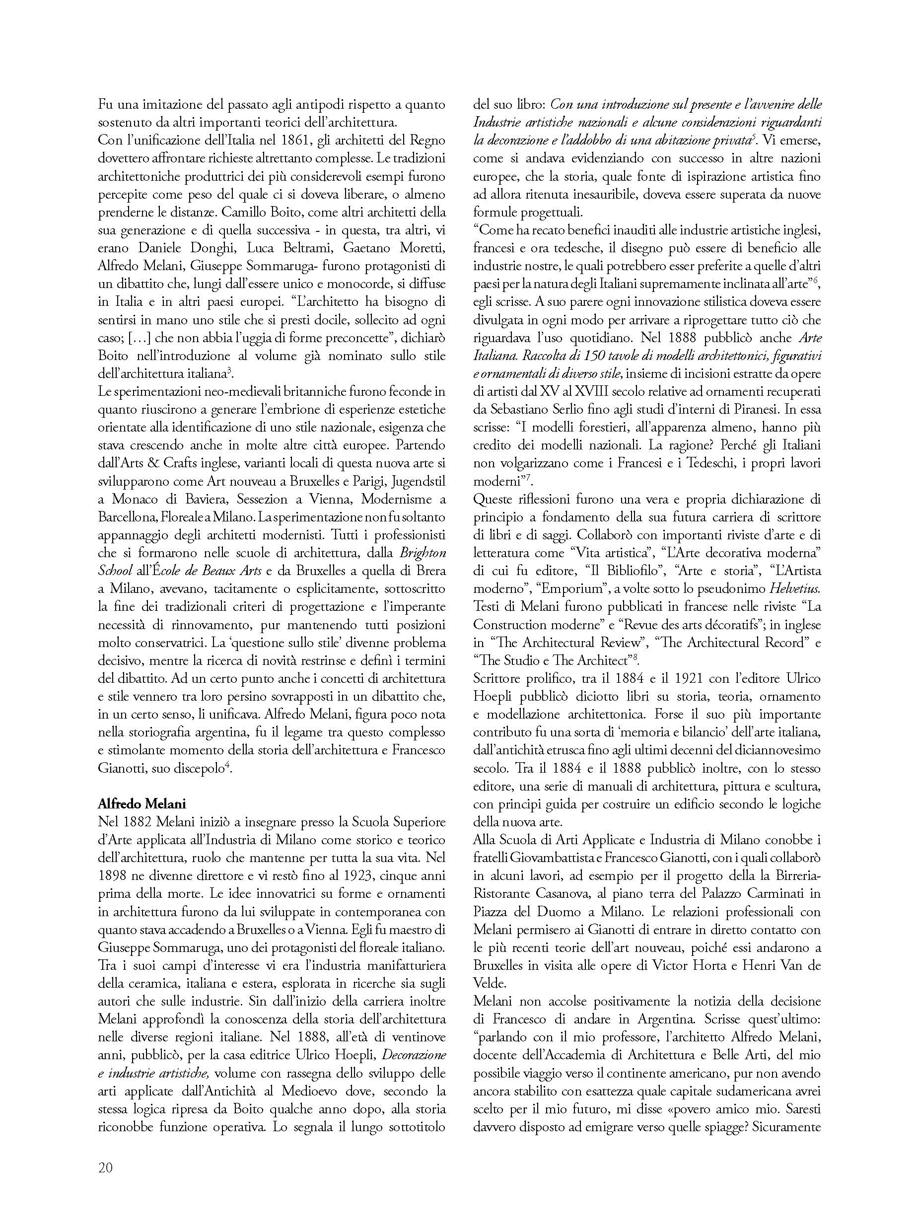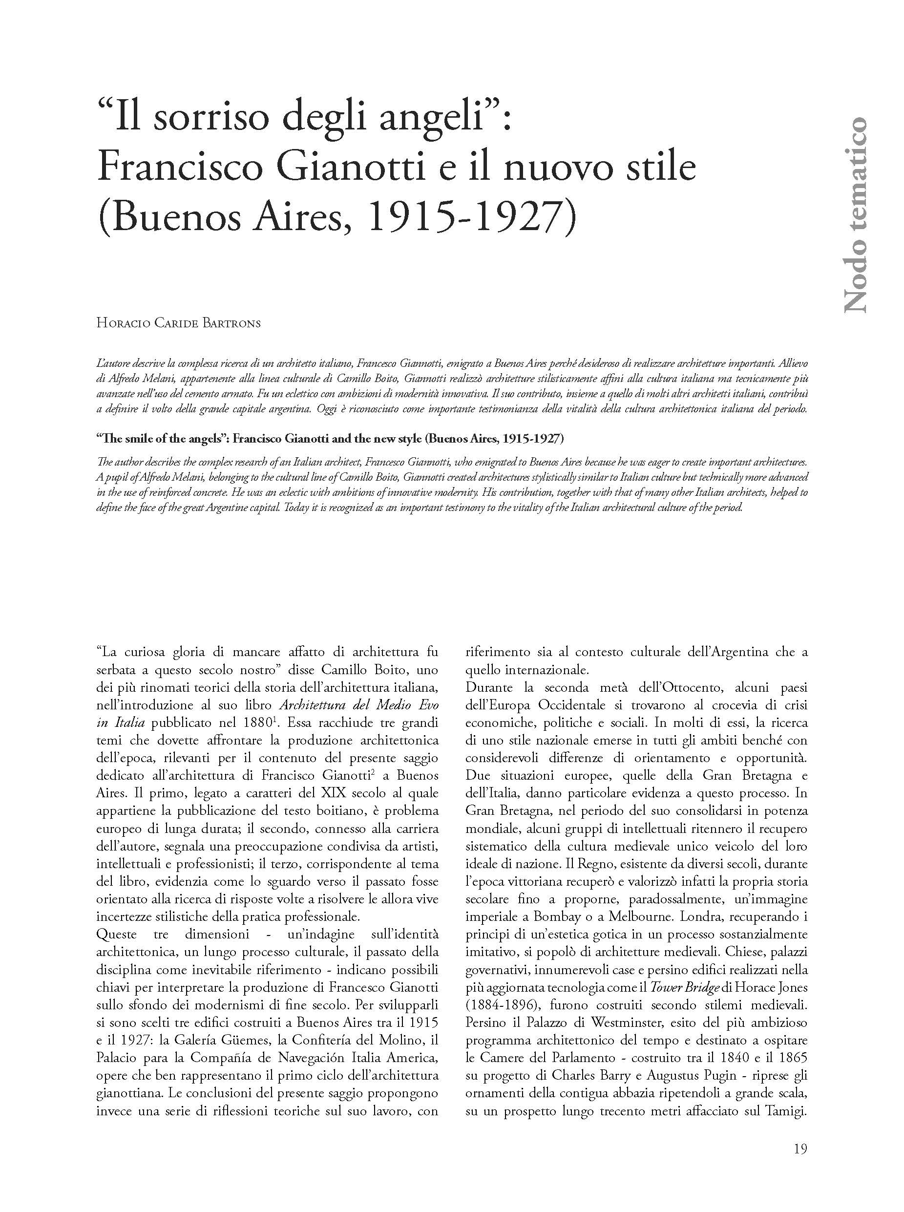 L’autore descrive la complessa ricerca di un architetto italiano, Francesco Giannotti, emigrato a Buenos Aires perché desideroso di realizzare architetture importanti. Allievo di Alfredo Melani, appartenente alla linea culturale di Camillo Boito, Giannotti realizzò architetture stilisticamente affini alla cultura italiana ma tecnicamente più avanzate nell’uso del cemento armato. Fu un eclettico con ambizioni di modernità innovativa. Il suo contributo, insieme a quello di molti altri architetti italiani, contribuì a definire il volto della grande capitale argentina. Oggi è riconosciuto come importante testimonianza della vitalità della cultura architettonica italiana del periodo.
