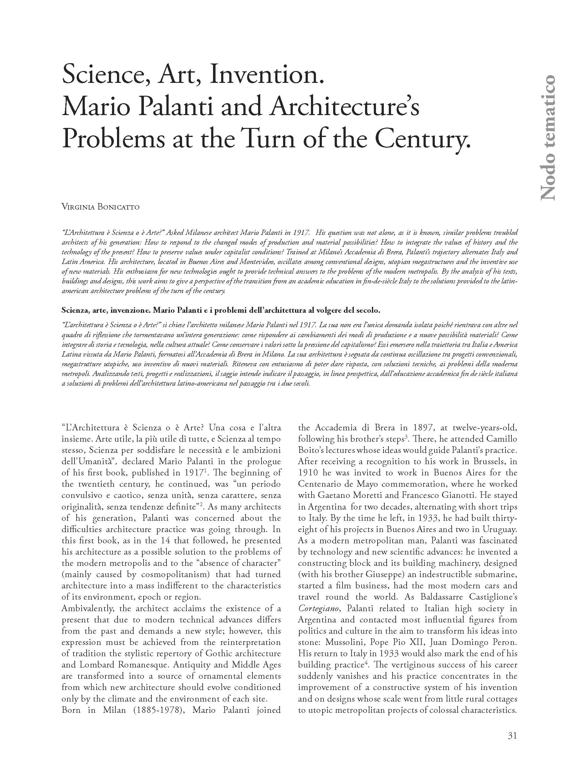 “L’architettura è Scienza o è Arte?” si chiese l’architetto milanese Mario Palanti nel 1917. La sua non era l’unica domanda isolata poiché rientrava con altre nel quadro di riflessione che tormentavano un’intera generazione: come rispondere ai cambiamenti dei modi di produzione e a nuove possibilità materiali? Come integrare di storia e tecnologia, nella cultura attuale? Come conservare i valori sotto la pressione del capitalismo? Essi emersero nella traiettoria tra Italia e America Latina vissuta da Mario Palanti, formatosi all’Accademia di Brera in Milano. La sua architettura è segnata da continua oscillazione tra progetti convenzionali, megastrutture utopiche, uso inventivo di nuovi materiali. Riteneva con entusiasmo di poter dare risposta, con soluzioni tecniche, ai problemi della moderna metropoli. Analizzando testi, progetti e realizzazioni, il saggio intende indicare il passaggio, in linea prospettica, dall’educazione accademica fin de siècle italiana a soluzioni di problemi dell’architettura latino-americana nel passaggio tra i due secoli.