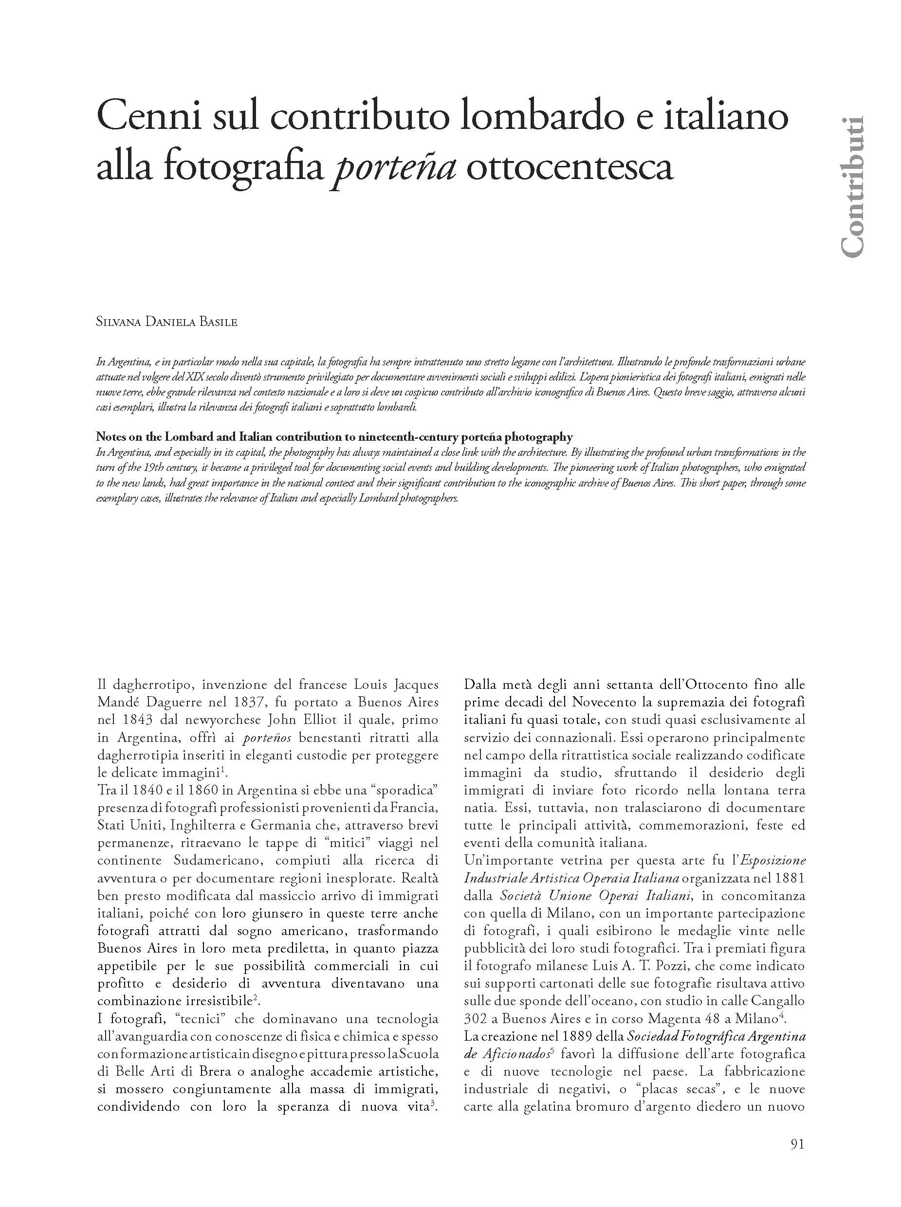 In Argentina, e in particolar modo nella sua capitale, la fotografia ha sempre intrattenuto uno stretto legame con l’architettura. Illustrando le profonde trasformazioni urbane attuate nel volgere del XIX secolo diventò strumento privilegiato per documentare avvenimenti sociali e sviluppi edilizi. L’opera pionieristica dei fotografi italiani, emigrati nelle nuove terre, ebbe grande rilevanza nel contesto nazionale e a loro si deve un cospicuo contributo all’archivio iconografico di Buenos Aires. Questo breve saggio, attraverso alcuni casi esemplari, illustra la rilevanza dei fotografi italiani e soprattutto lombardi.