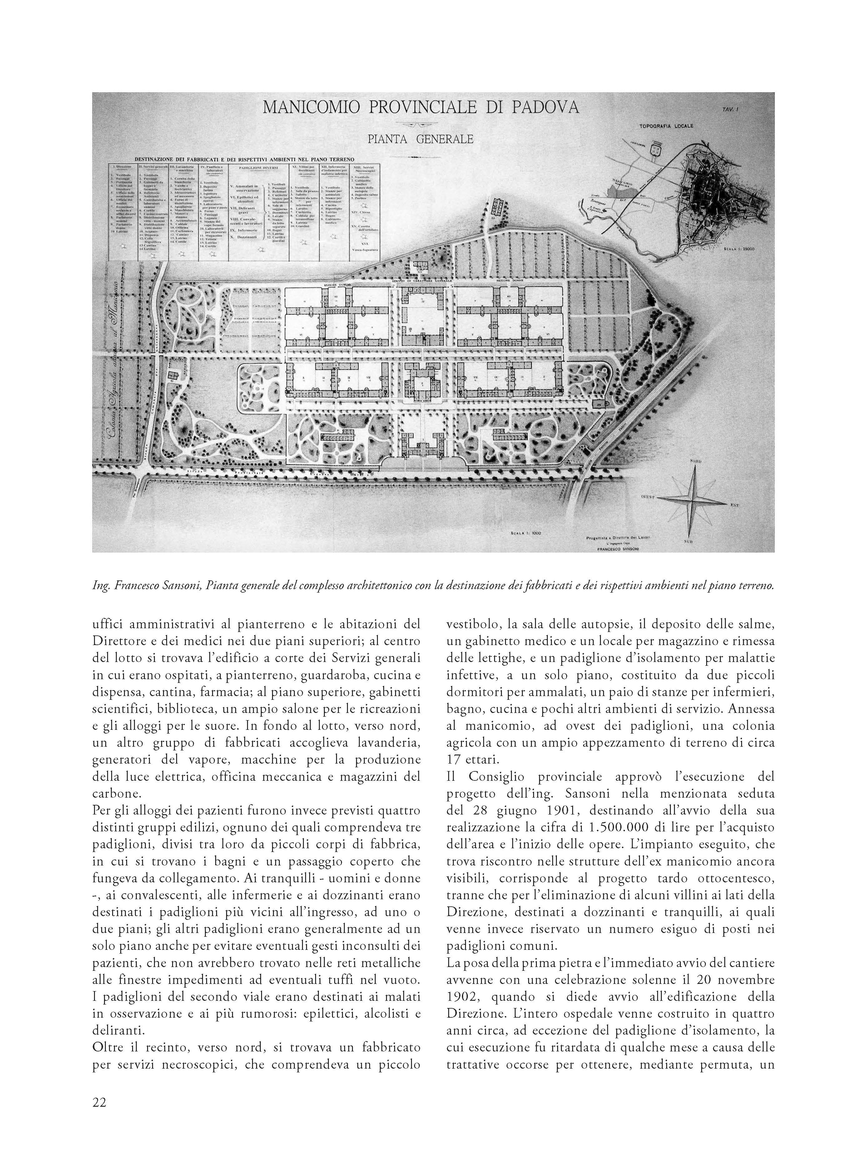 Edificato nei primi anni del Novecento il complesso architettonico del Manicomio Provinciale di Padova fu realizzato in adesione ai principi del “no-restraint” diffusi in quegli anni in tutta Europa e qui propugnati dal prof. Ernesto Belmondo, già ordinario di Psichiatria a Padova e primo Direttore del nosocomio. Il saggio, dopo aver analizzato l’originario progetto firmato dall’ing. Francesco Sansoni, sintetizza le trasformazioni salienti avvenute nella prima metà del XX secolo a questa significativa testimonianza di architettura sociale, segnata anche dall’ampliamento avvenuto nei primi anni degli anni cinquanta.
