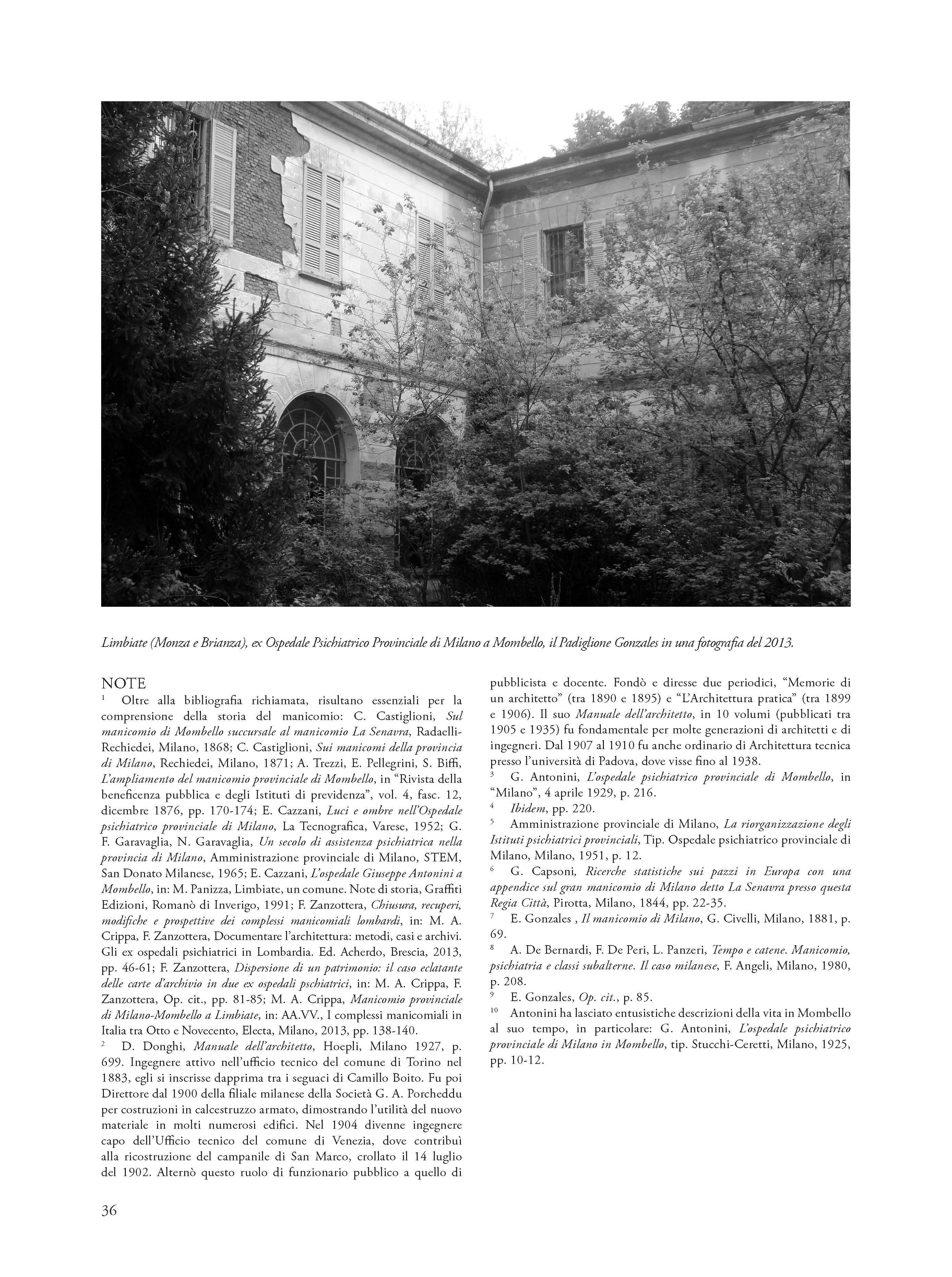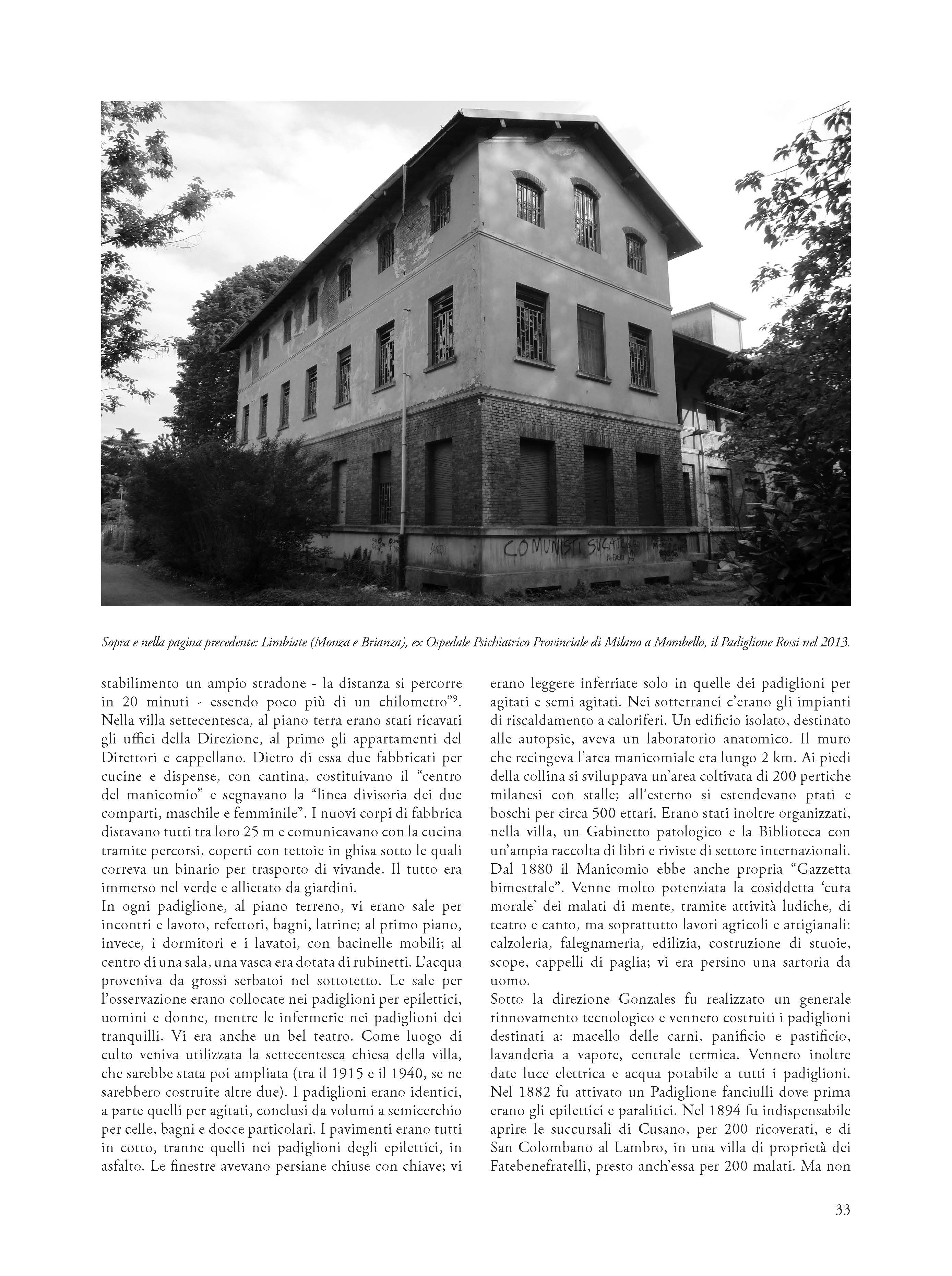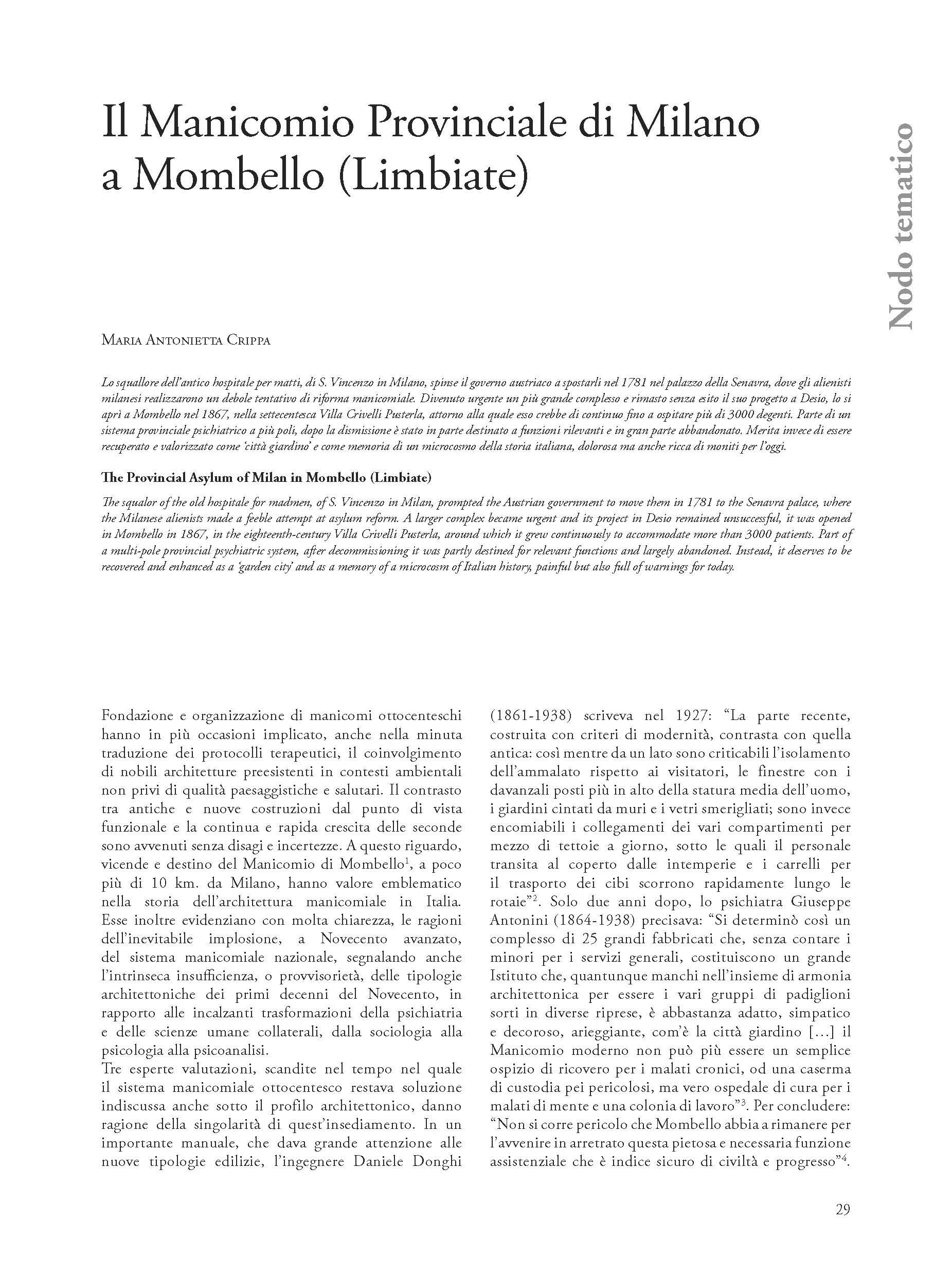 The squalor of the old hospitale for madmen, of S. Vincenzo in Milan, prompted the Austrian government to move them in 1781 to the Senavra palace, where the Milanese alienists made a feeble attempt at asylum reform. A larger complex became urgent and its project in Desio remained unsuccessful, it was opened in Mombello in 1867, in the eighteenth-century Villa Crivelli Pusterla, around which it grew continuously to accommodate more than 3000 patients. Part of a multi-pole provincial psychiatric system, after decommissioning it was partly destined for relevant functions and largely abandoned. Instead, it deserves to be recovered and enhanced as a ‘garden city’ and as a memory of a microcosm of Italian history, painful but also full of warnings for today.