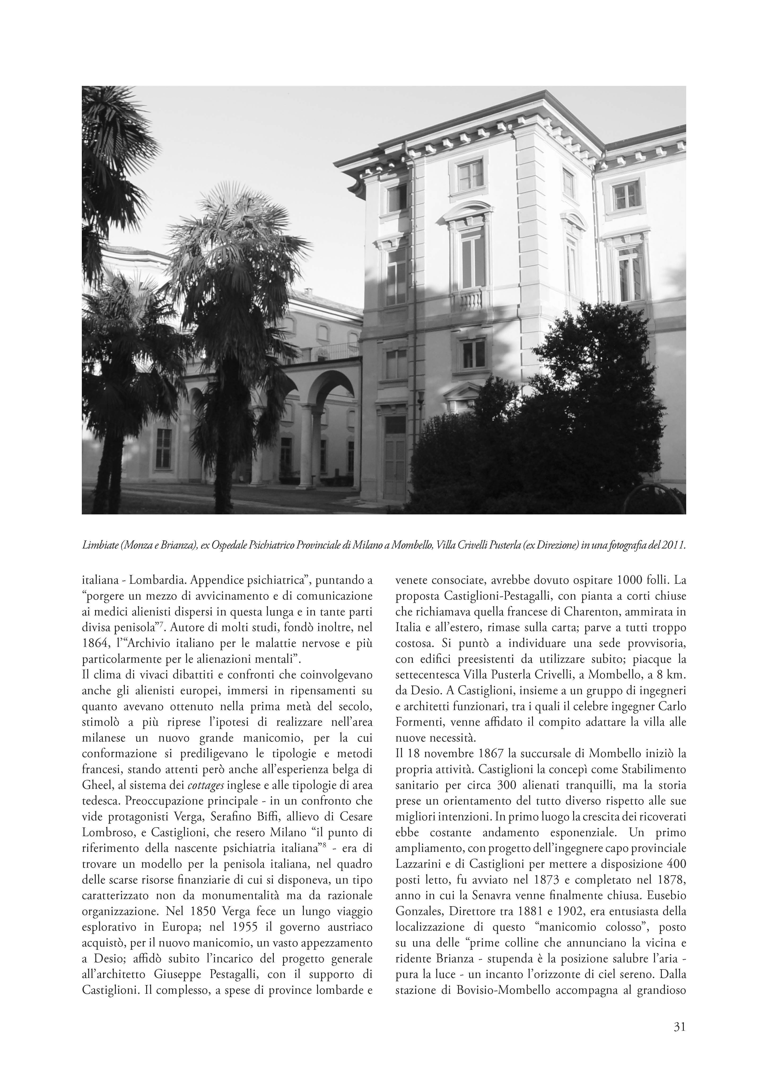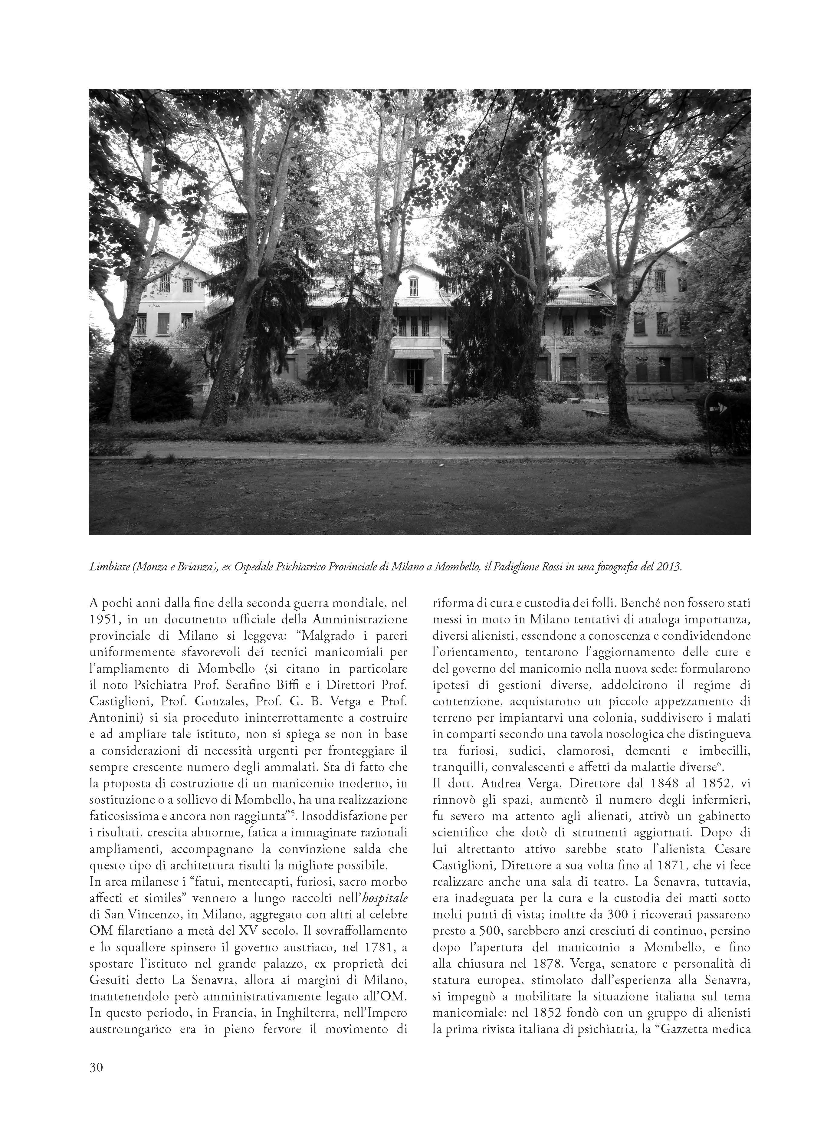 Lo squallore dell’antico hospitale per matti, di S. Vincenzo in Milano, spinse il governo austriaco a spostarli nel 1781 nel palazzo della Senavra, dove gli alienisti milanesi realizzarono un debole tentativo di riforma manicomiale. Divenuto urgente un più grande complesso e rimasto senza esito il suo progetto a Desio, lo si aprì a Mombello nel 1867, nella settecentesca Villa Crivelli Pusterla, attorno alla quale esso crebbe di continuo fino a ospitare più di 3000 degenti. Parte di un sistema provinciale psichiatrico a più poli, dopo la dismissione è stato in parte destinato a funzioni rilevanti e in gran parte abbandonato. Merita invece di essere recuperato e valorizzato come ‘città giardino’ e come memoria di un microcosmo della storia italiana, dolorosa ma anche ricca di moniti per l’oggi.