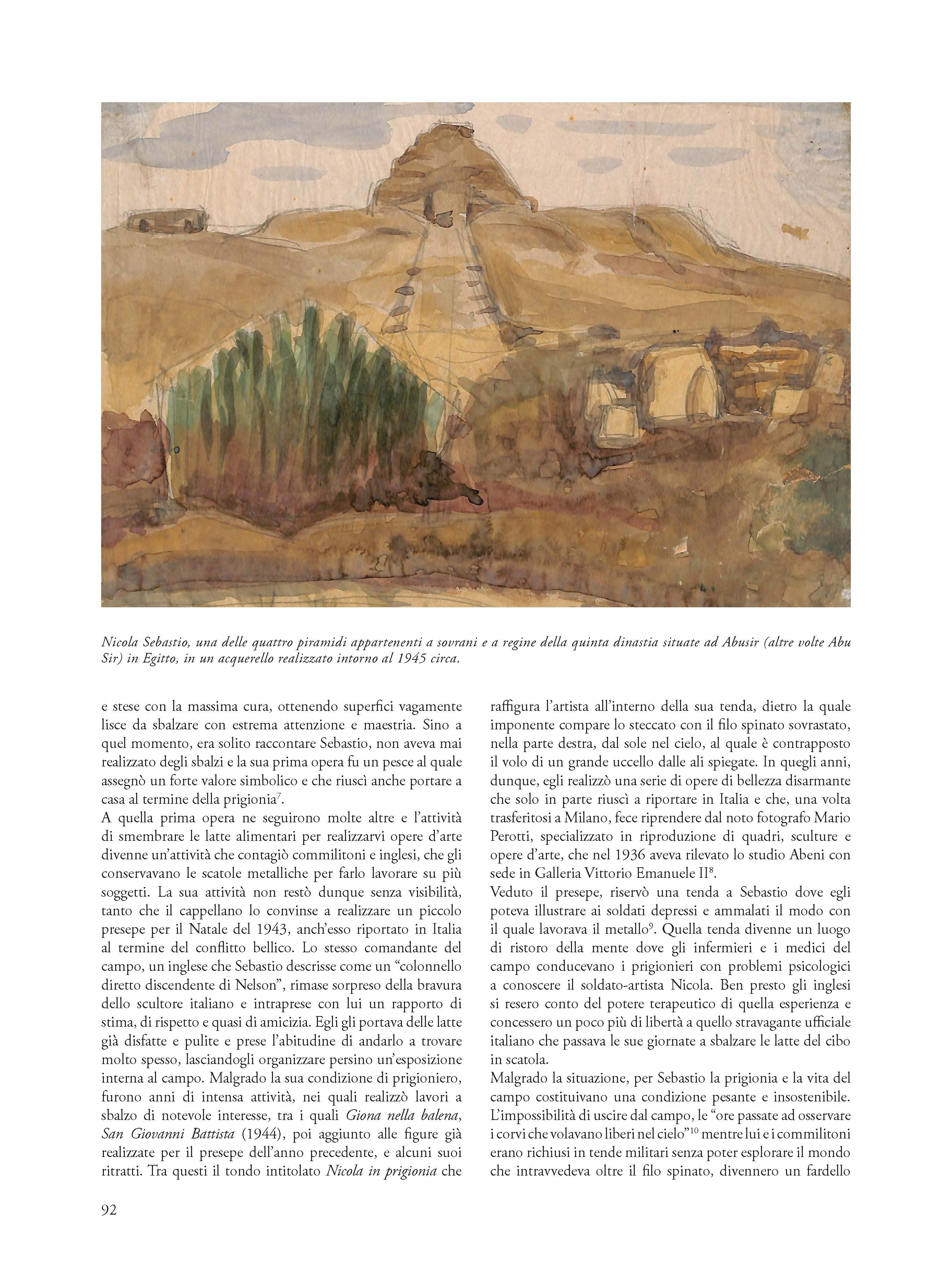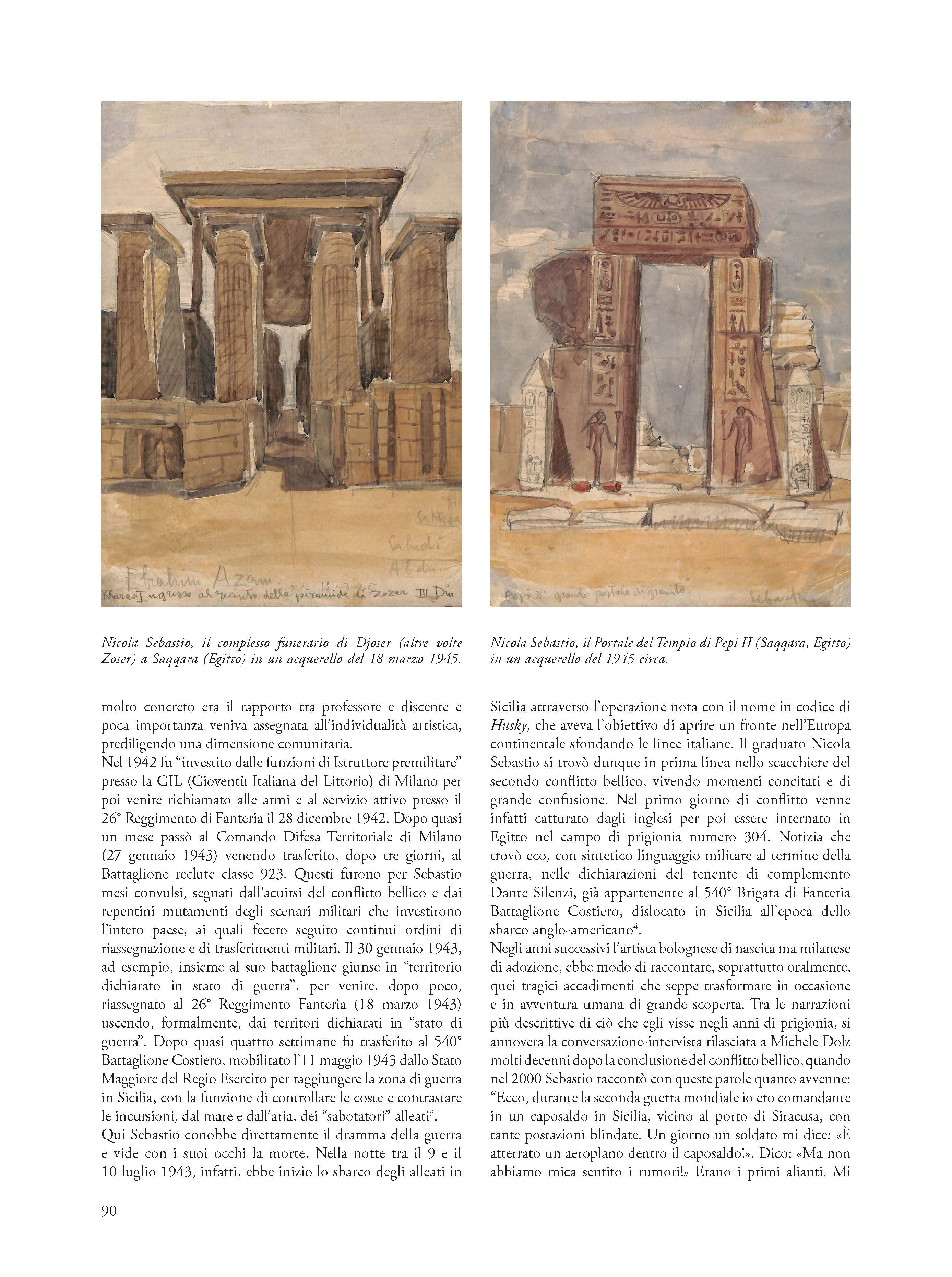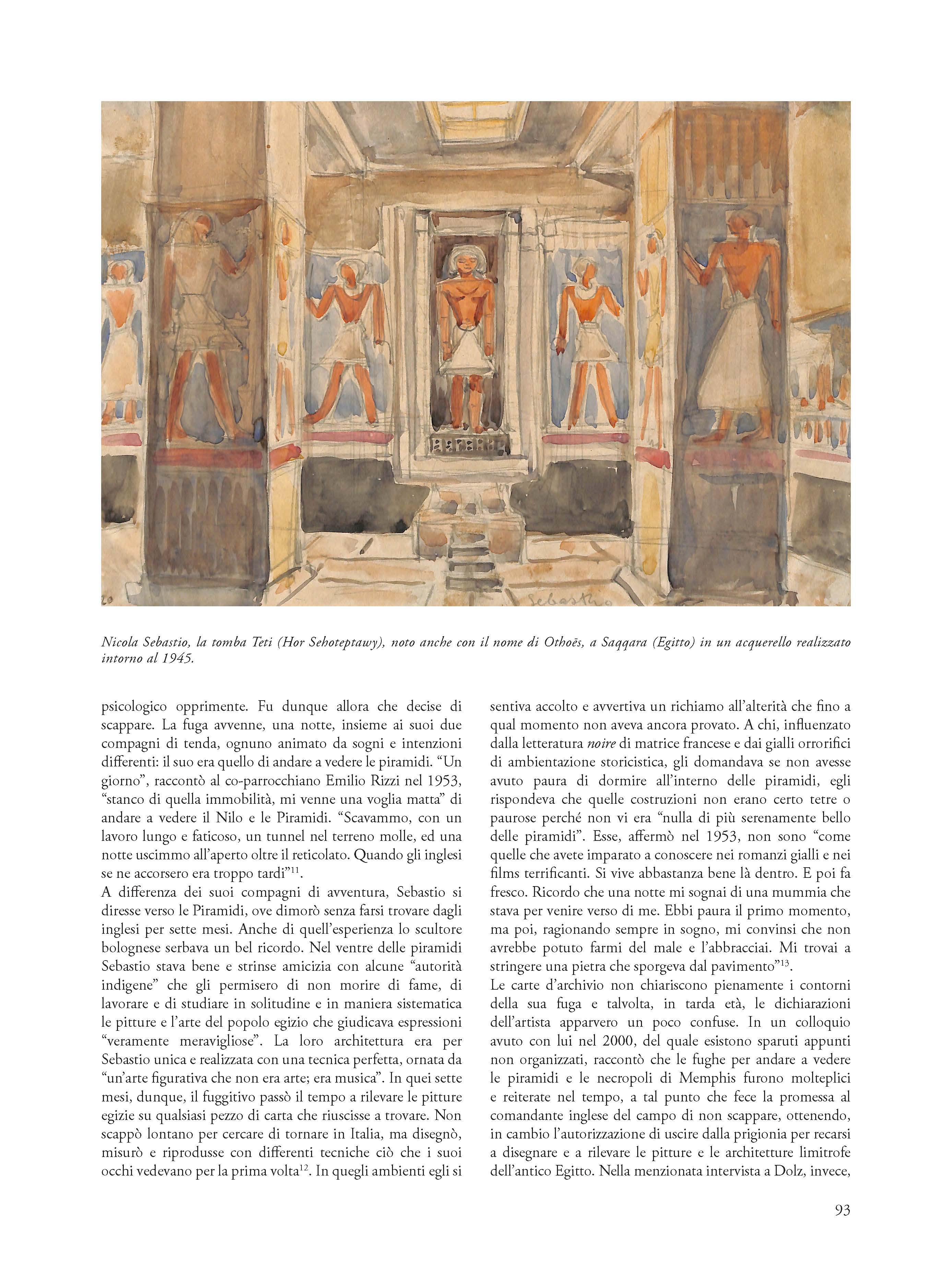 Significativo scultore del XX secolo, Nicola Sebastio fu protagonista indiscusso del dibattito sull’arte sacra del Novecento. Diplomatosi all’Accademia di Belle Arti di Firenze, fin da giovane entrò in contatto con numerosi intellettuali e artisti che frequentò anche nei periodi in cui si dedicò all’insegnamento presso numerose istituzioni milanesi, tra le quali la Società Umanitaria, la Scuola Beato Angelico e l’Istituto Gonzaga. Autore della statua raffigurante San Giovanni Battista de La Salle collocata sulla guglia centrale della facciata del Duomo di Milano, Sebastio fu segnato dall’esperienza della seconda guerra mondiale e, in particolare, dalla prigionia in Egitto. Il saggio ripercorre, dunque, le tappe salienti degli anni della guerra, della fuga dal campo di prigionia inglese e del suo nascondimento di numerosi mesi nelle piramidi e nella Necropoli di Memphis. Un’esperienza che lo condusse a iniziare un’opera di studio e rilievo della pittura funeraria egizia che, secondo Costantino Baroni, lo portò a costituire un corpus di disegni “di grande novità e rilievo per la conoscenza e la valutazione critica” della civiltà egiziana.