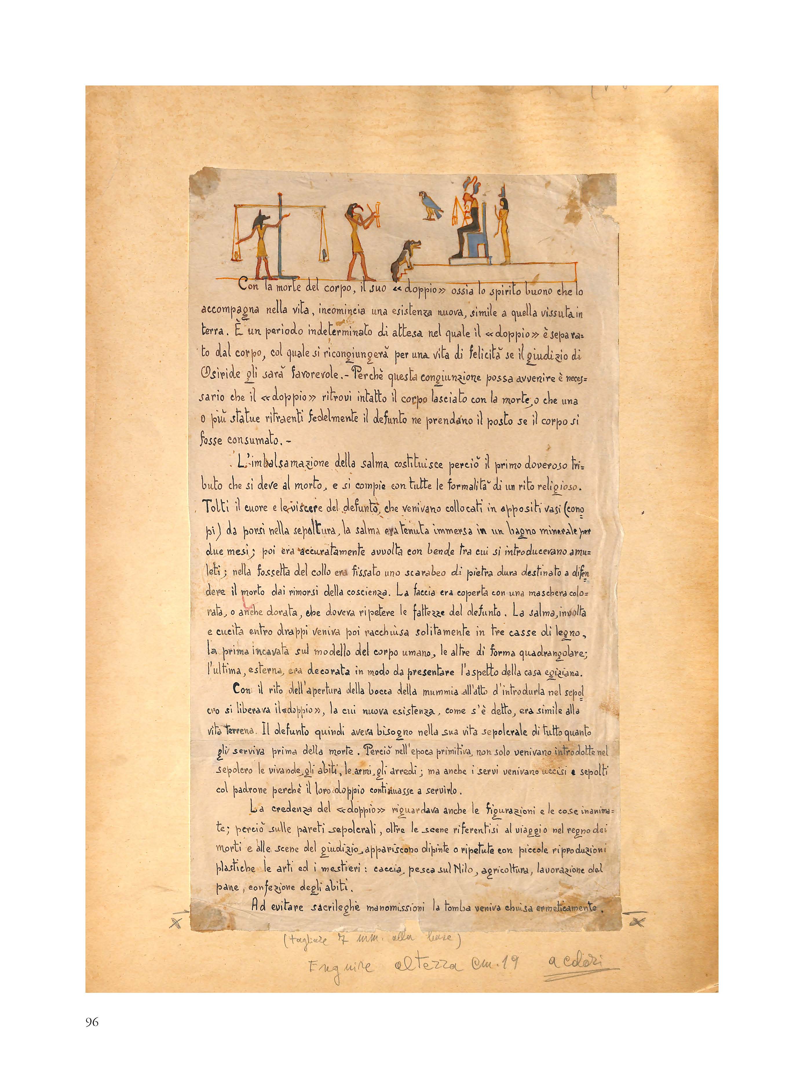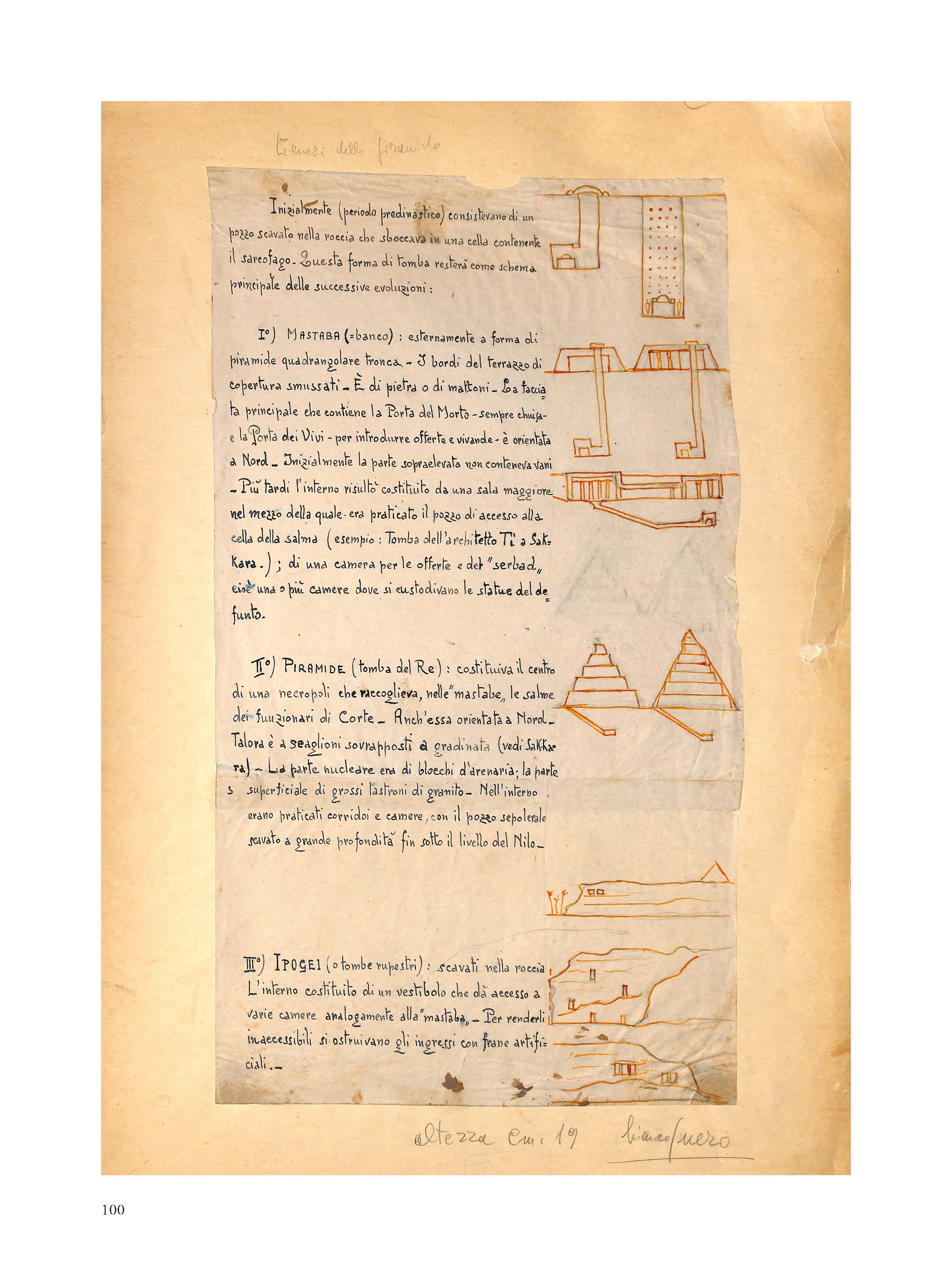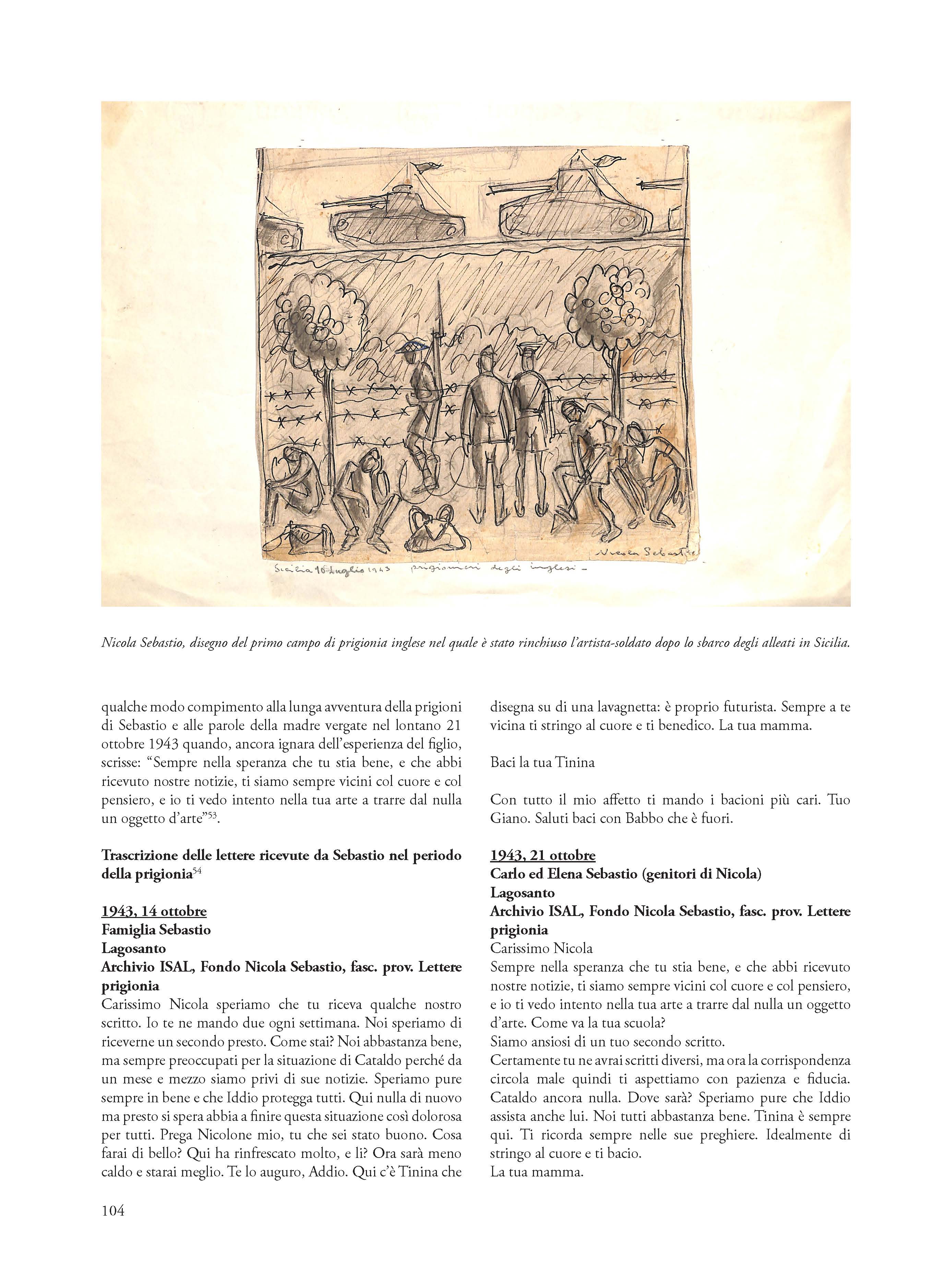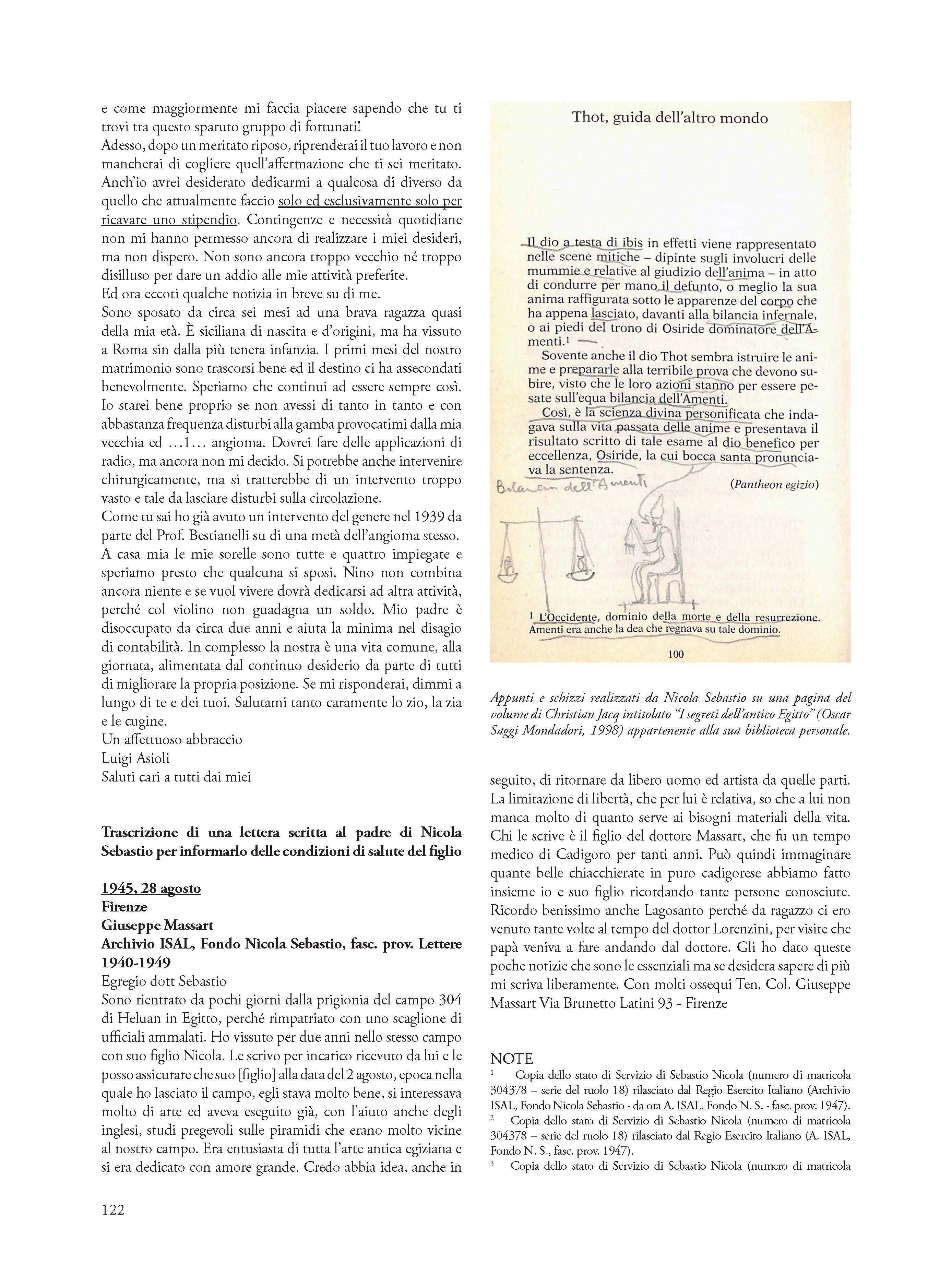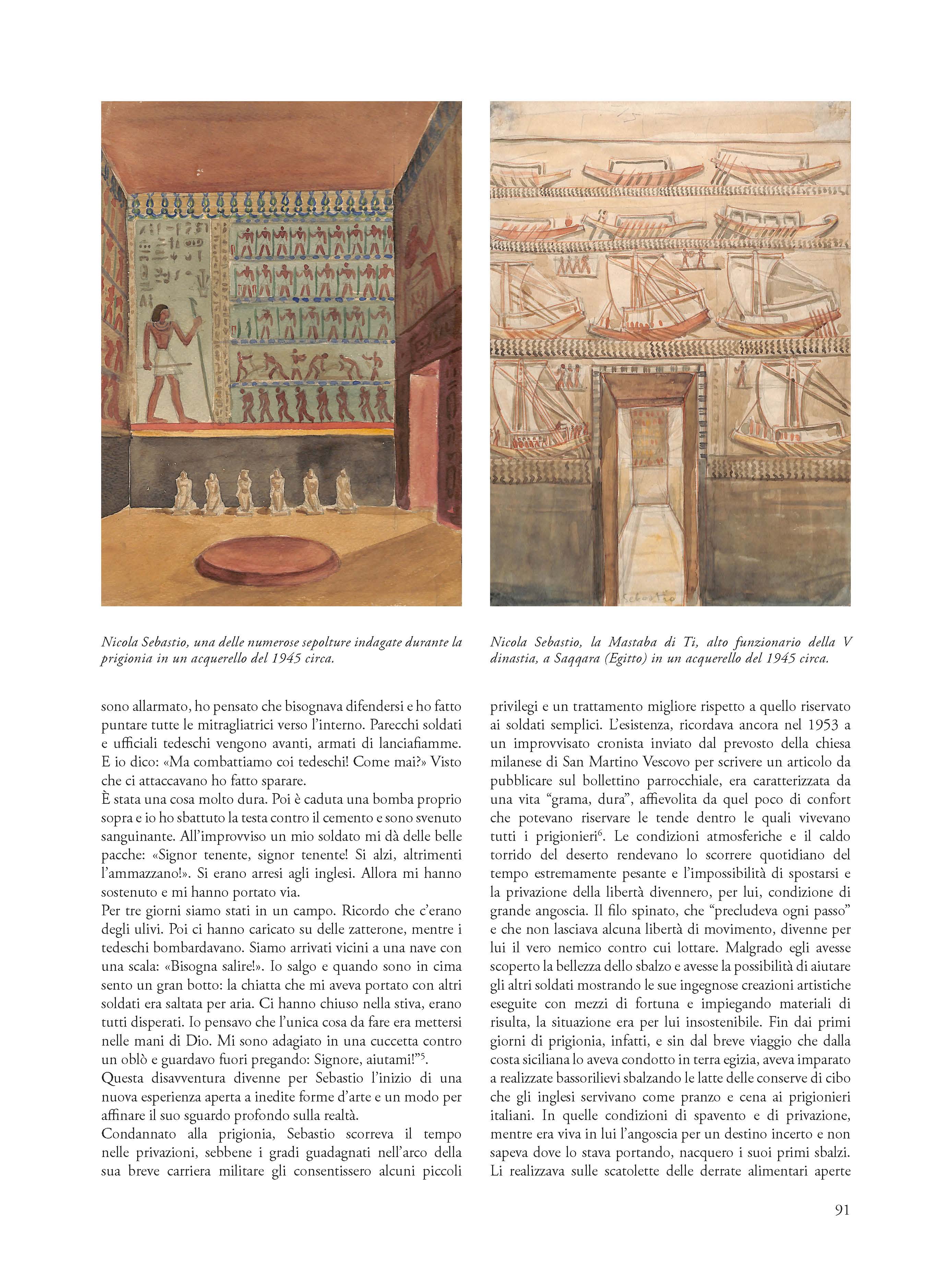 An important sculptor of the twentieth century, Nicola Sebastio was the undiscussed protagonist of the debate on the sacred art of the twentieth century. Graduated from the Academy of Fine Arts in Florence, from an early age he came in contact with numerous intellectuals and artists he frequented even in the periods in which he dedicated himself to teaching at numerous Milan institutions, including the Humanitarian Society, the Beato Angelico School and the Gonzaga Institute. Author of the statue depicting St. John the Baptist de La Salle placed on the central spire of the facade of the Milan Cathedral, Sebastio was marked by the experience of the Second World War and, in particular, by his imprisonment in Egypt. The essay therefore traces the salient steps of the war years, of his escape from the English prison camp and his many months’ hiding in the pyramids and in the Necropolis of Memphis. An experience that led him to start a relevant study of Egyptian funerary painting which, according to Costantino Baroni, led him to build a corpus of drawings “of great novelty and importance for the knowledge and critical evaluation” of Egyptian civilization.