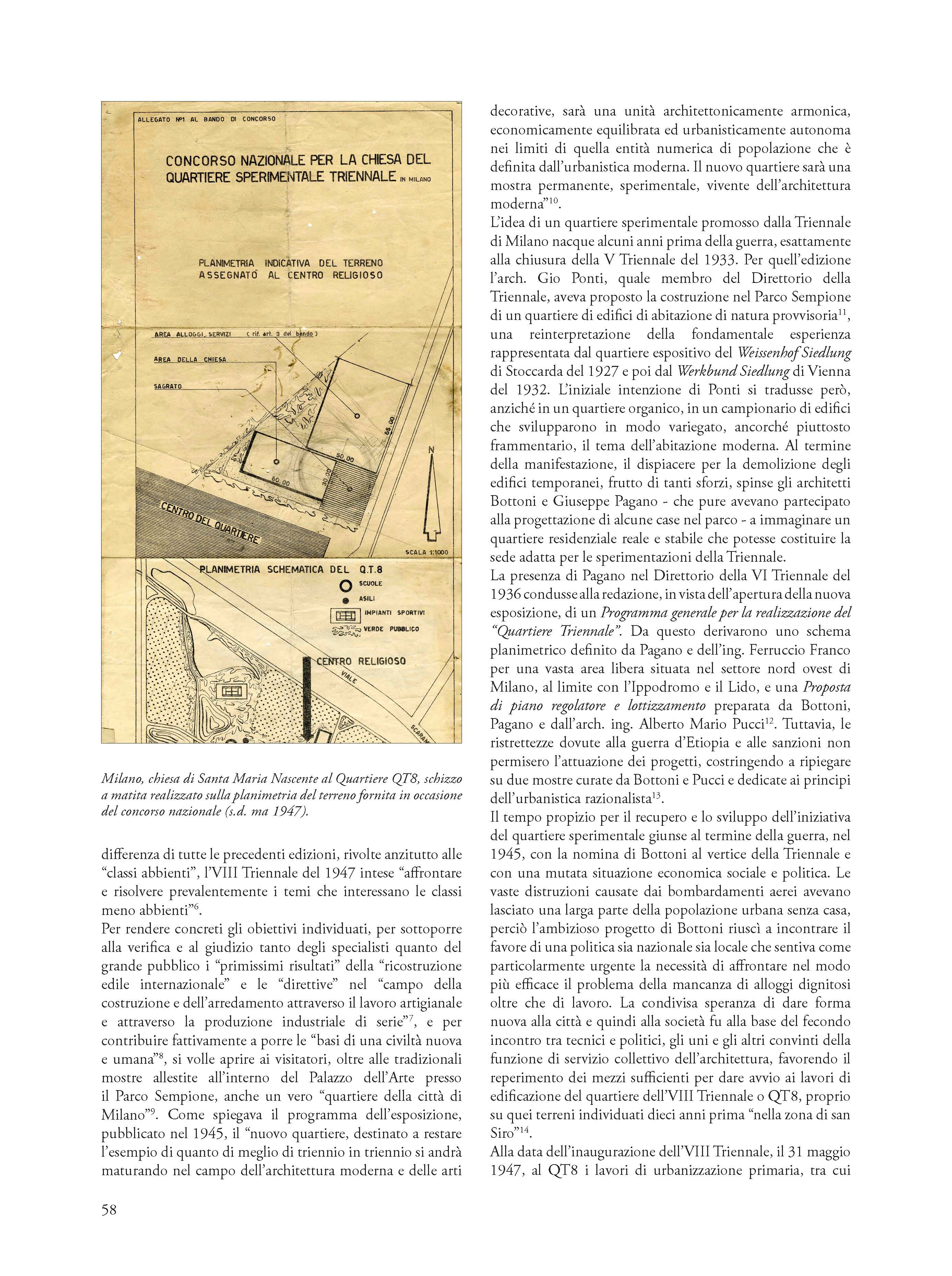 The parish church at QT8 in Milan, designed by architects Vico Magistretti and Mario Tedeschi between 1947 and 1954, can be completely understood if regarded in its close connection with the experimental district for which it was conceived. Its language and the bond between architecture and town planning in the design phase make it an extraordinary theme of Italian modernity indeed, promoted in the reconstruction period following the Second World War. The essay aims at first to enhance the bond there pursued between architecture and the city, shortly retracing the events of the District of the Eighth Triennale of Milan and those of the church, and then to analyze more in detail the sacred building’s specific characteristics, even through the examination of some original project drawings, unpublished so far, preserved in the Magistretti’s architectural archiv.