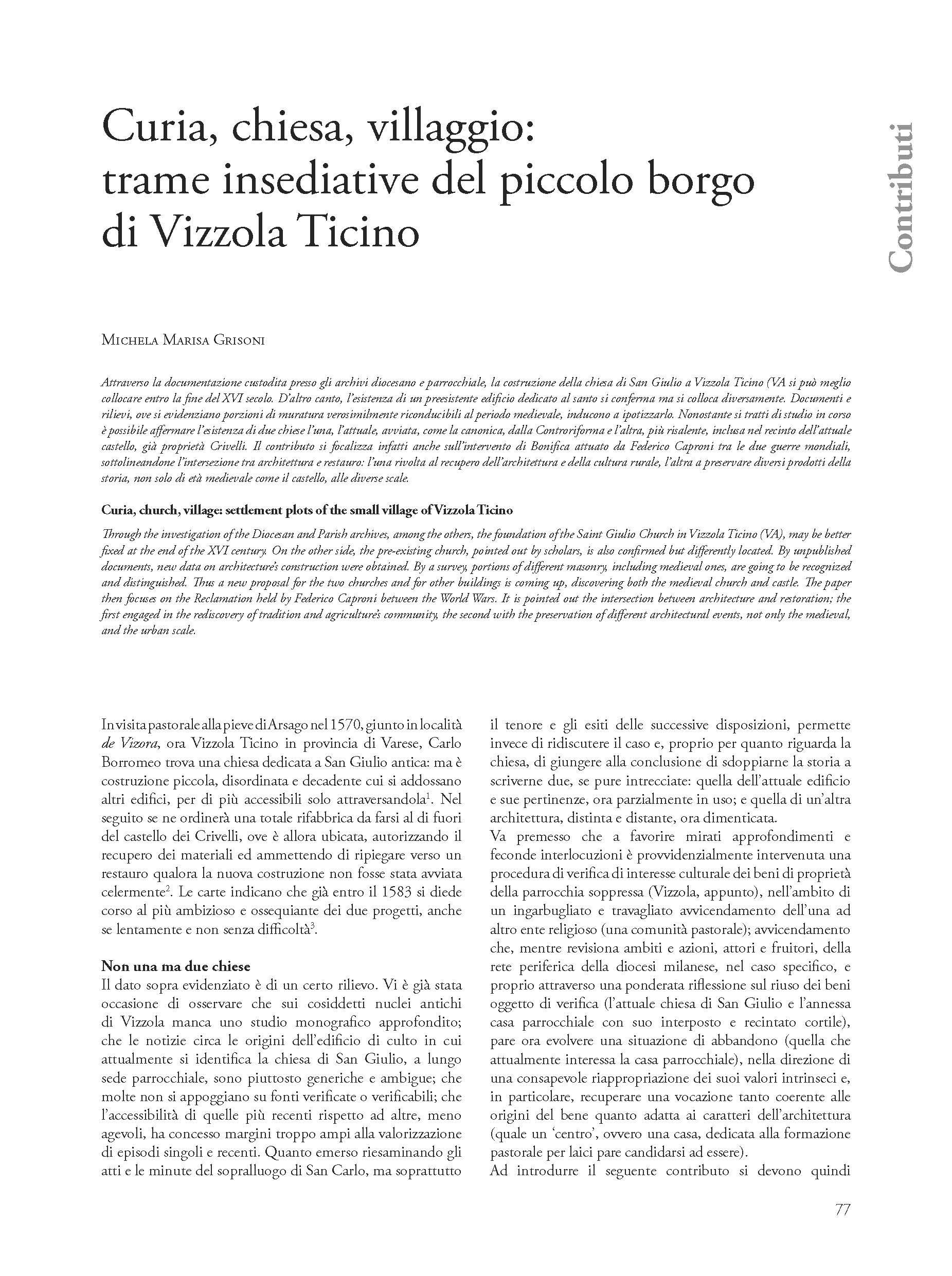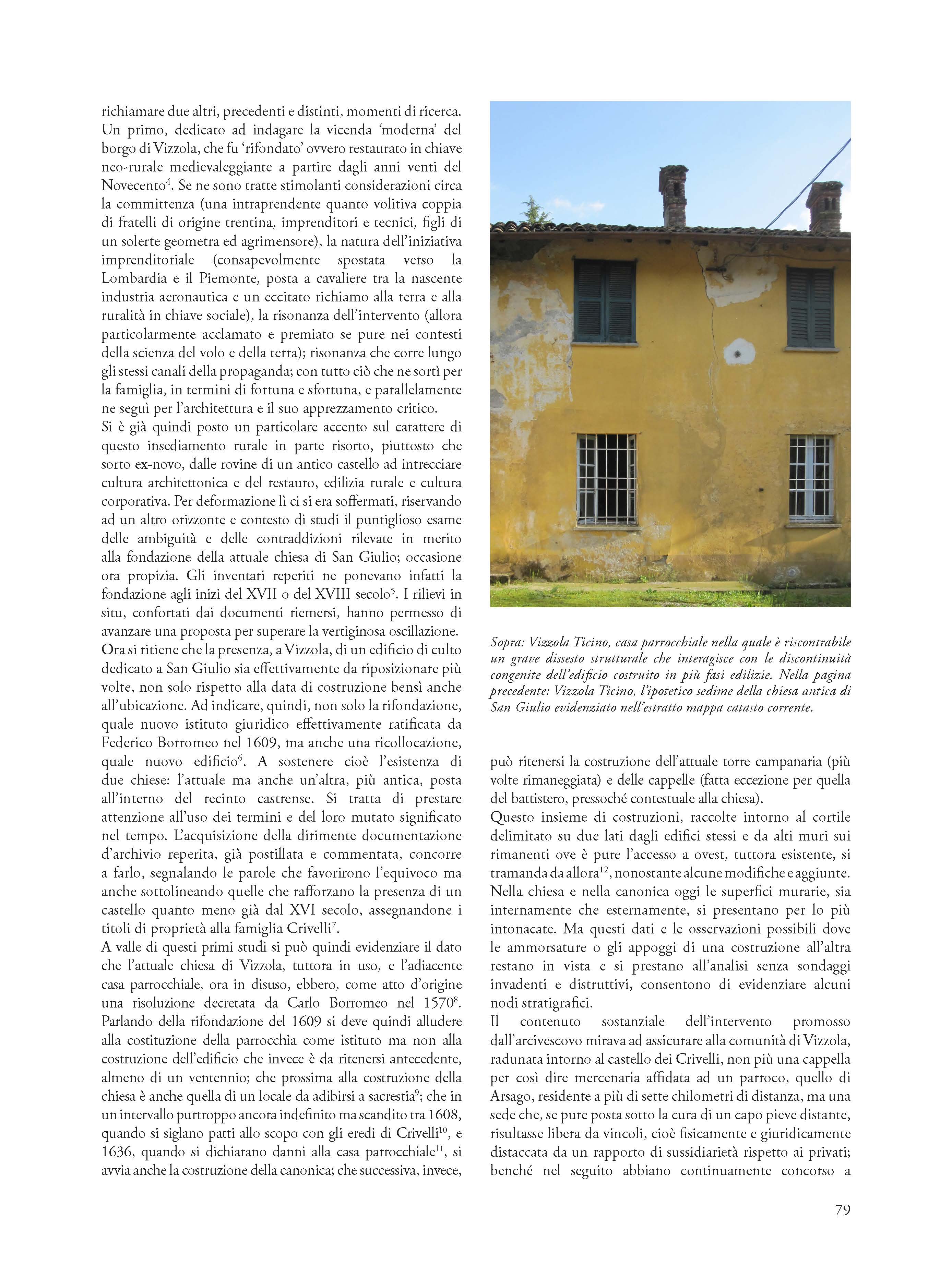 Attraverso la documentazione custodita presso gli archivi diocesano e parrocchiale, la costruzione della chiesa di San Giulio a Vizzola Ticino (VA si può meglio collocare entro la fine del XVI secolo. D’altro canto, l’esistenza di un preesistente edificio dedicato al santo si conferma ma si colloca diversamente. Documenti e rilievi, ove si evidenziano porzioni di muratura verosimilmente riconducibili al periodo medievale, inducono a ipotizzarlo. Nonostante si tratti di studio in corso è possibile affermare l’esistenza di due chiese l’una, l’attuale, avviata, come la canonica, dalla Controriforma e l’altra, più risalente, inclusa nel recinto dell’attuale castello, già proprietà Crivelli. Il contributo si focalizza infatti anche sull’intervento di Bonifica attuato da Federico Caproni tra le due guerre mondiali, sottolineandone l’intersezione tra architettura e restauro: l’una rivolta al recupero dell’architettura e della cultura rurale, l’altra a preservare diversi prodotti della storia, non solo di età medievale come il castello, alle diverse scale.