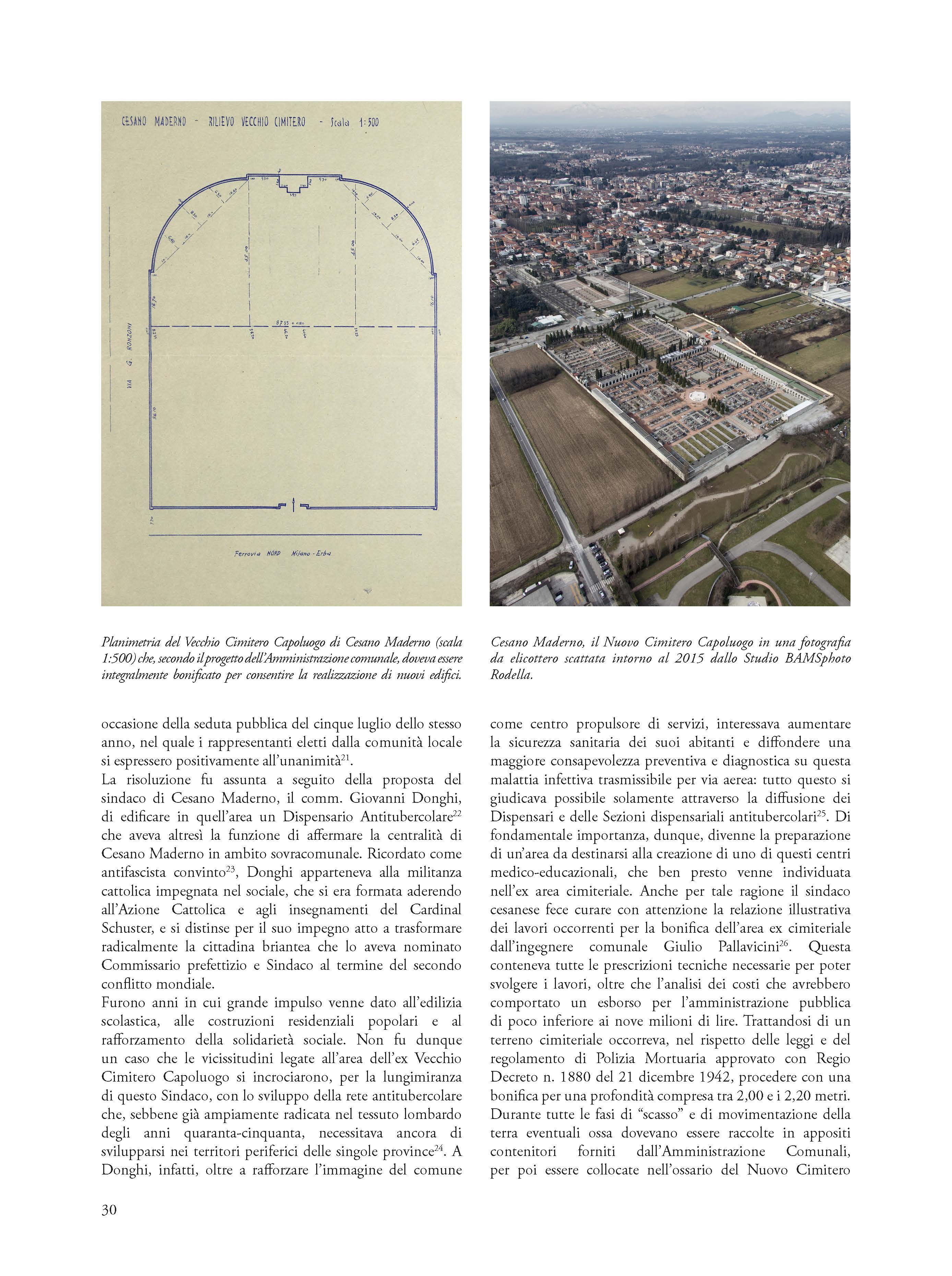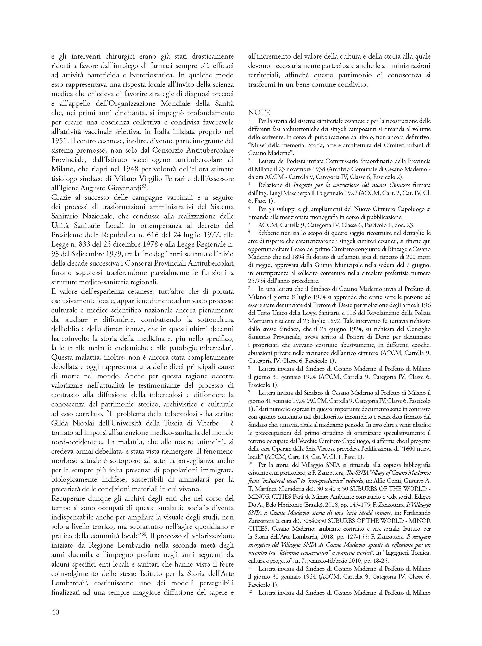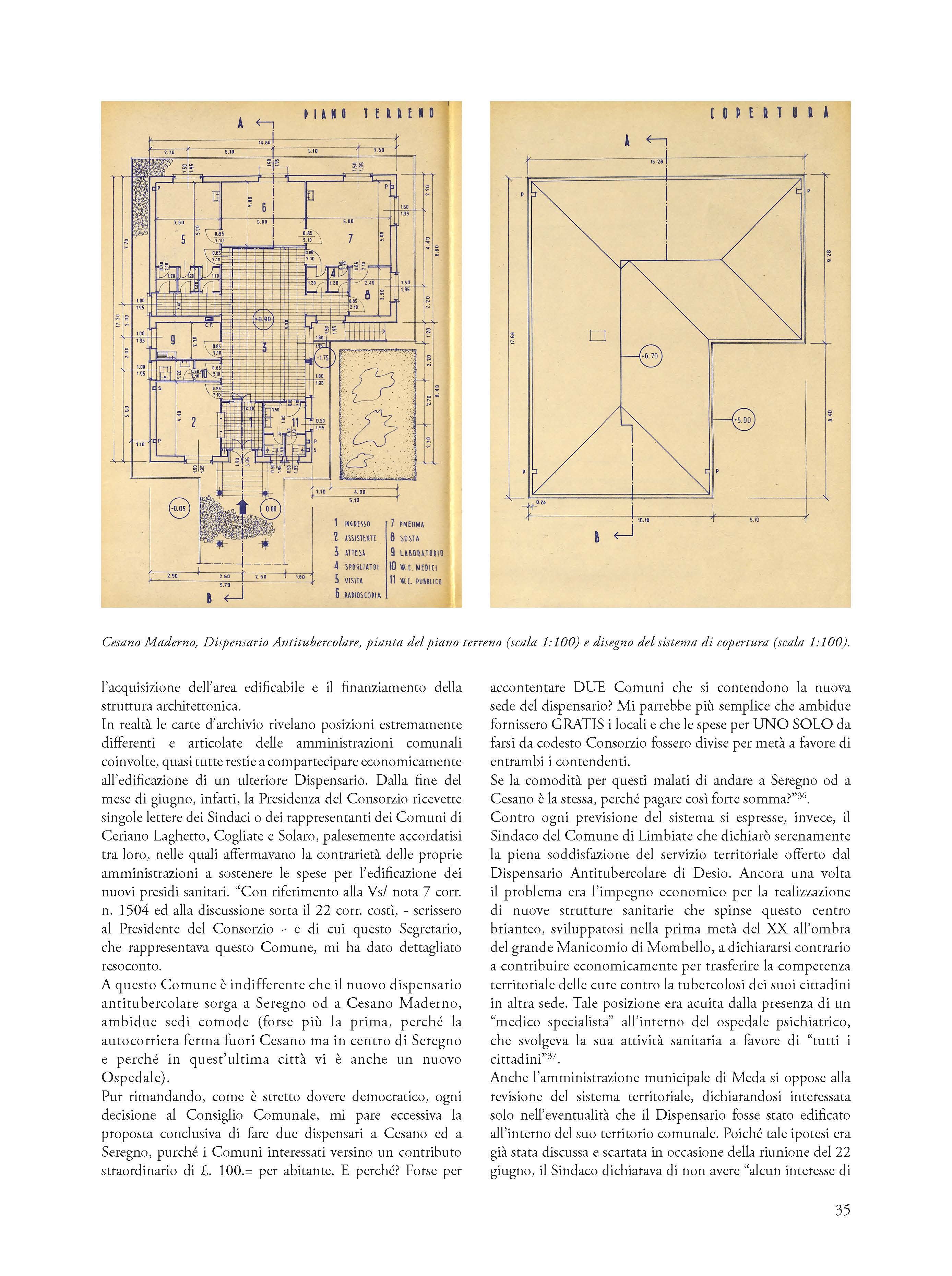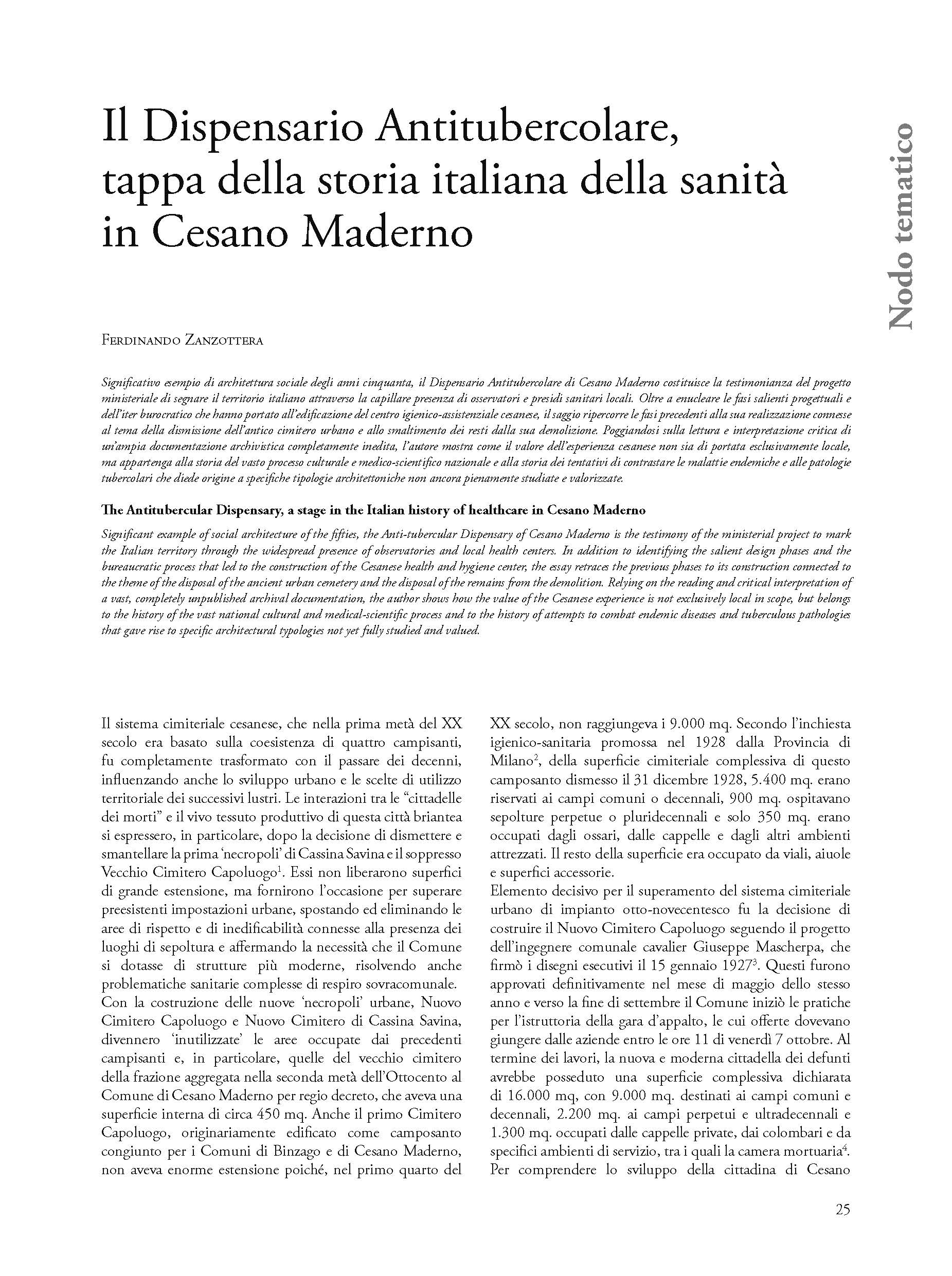 Significant example of social architecture of the fifties, the Anti-tubercular Dispensary of Cesano Maderno is the testimony of the ministerial project to mark the Italian territory through the widespread presence of observatories and local health centers. In addition to identifying the salient design phases and the bureaucratic process that led to the construction of the Cesanese health and hygiene center, the essay retraces the previous phases to its construction connected to the theme of the disposal of the ancient urban cemetery and the disposal of the remains from the demolition. Relying on the reading and critical interpretation of a vast, completely unpublished archival documentation, the author shows how the value of the Cesanese experience is not exclusively local in scope, but belongs to the history of the vast national cultural and medical-scientific process and to the history of attempts to combat endemic diseases and tuberculous pathologies that gave rise to specific architectural typologies not yet fully studied and valued.