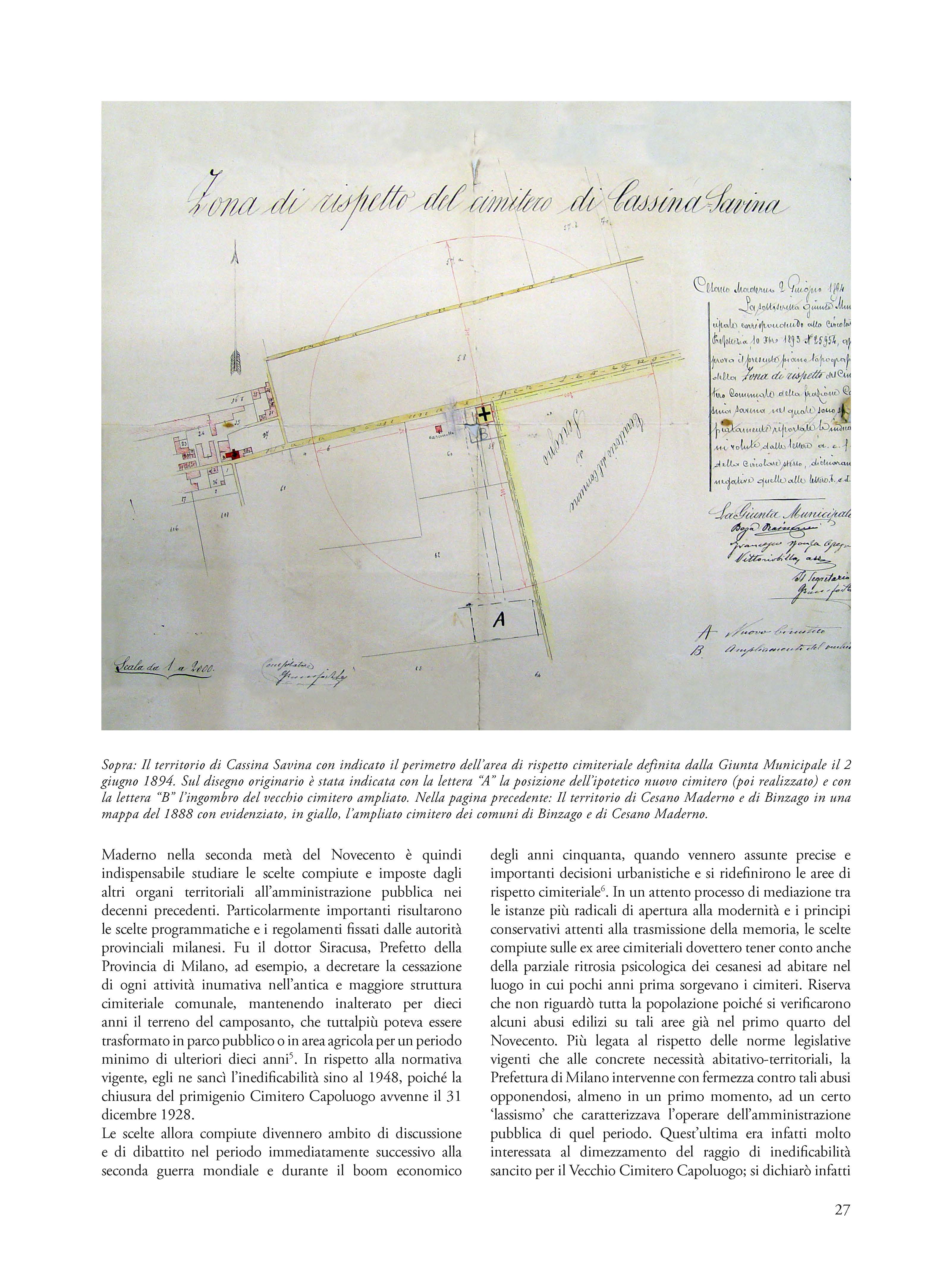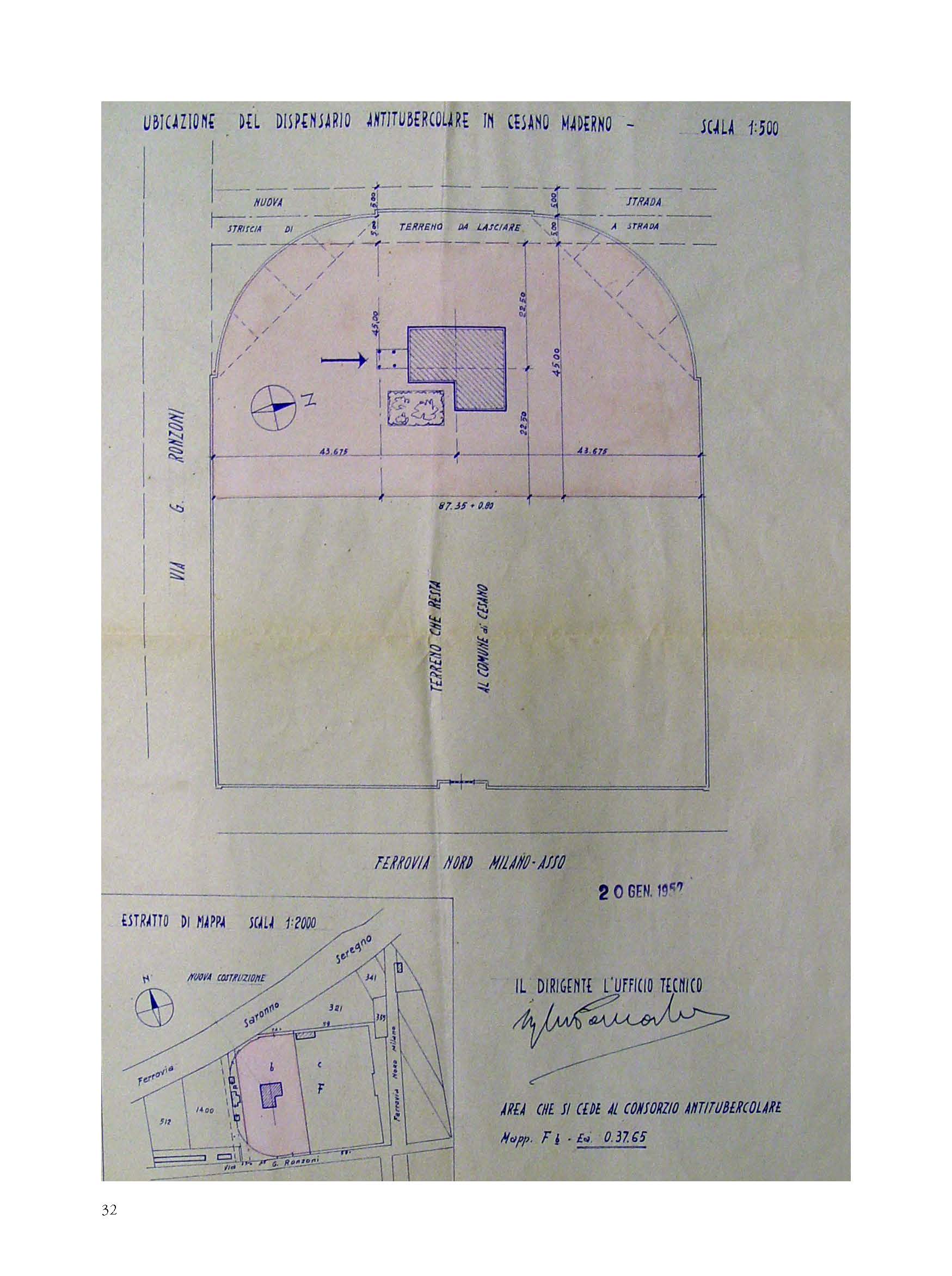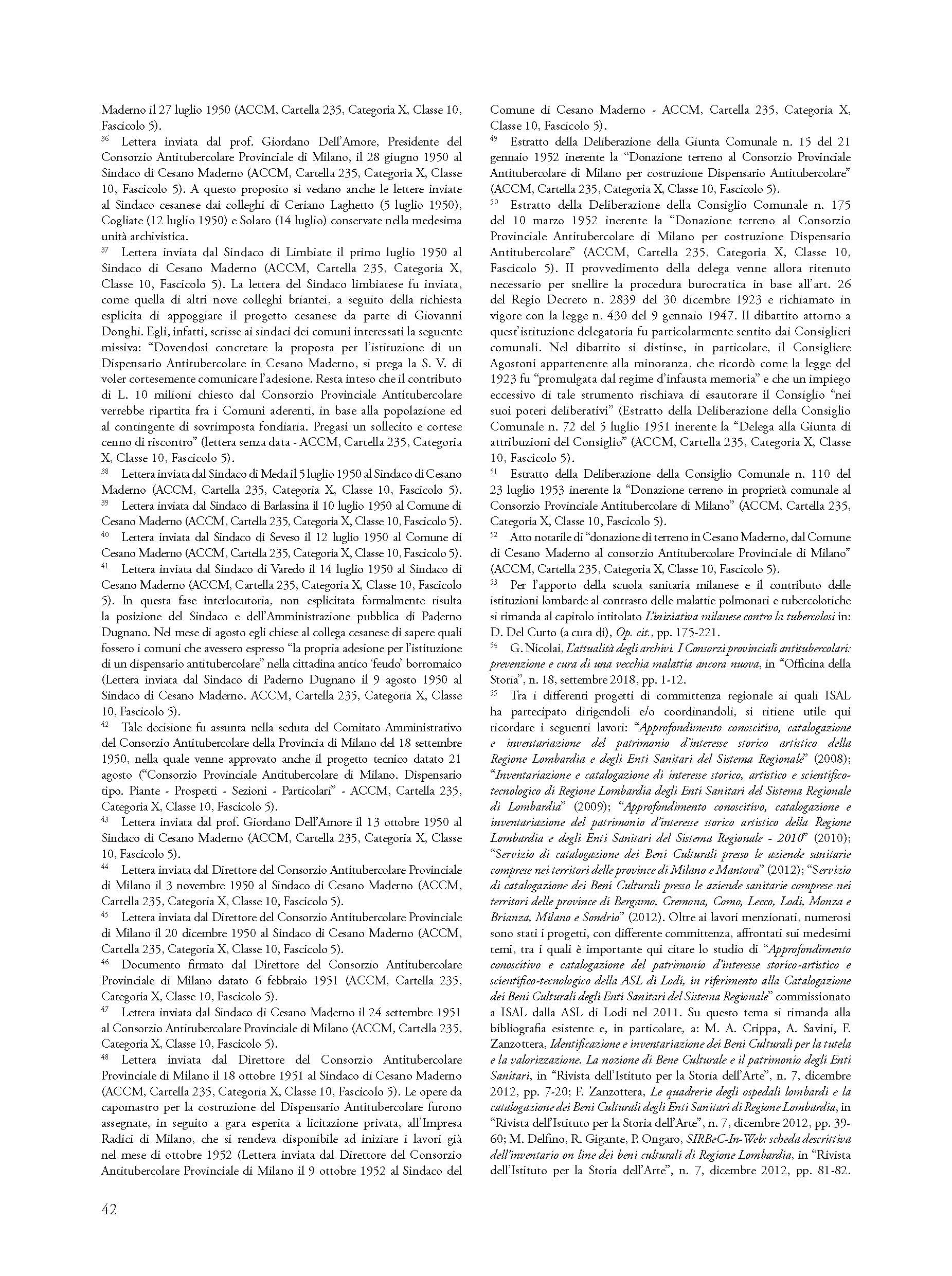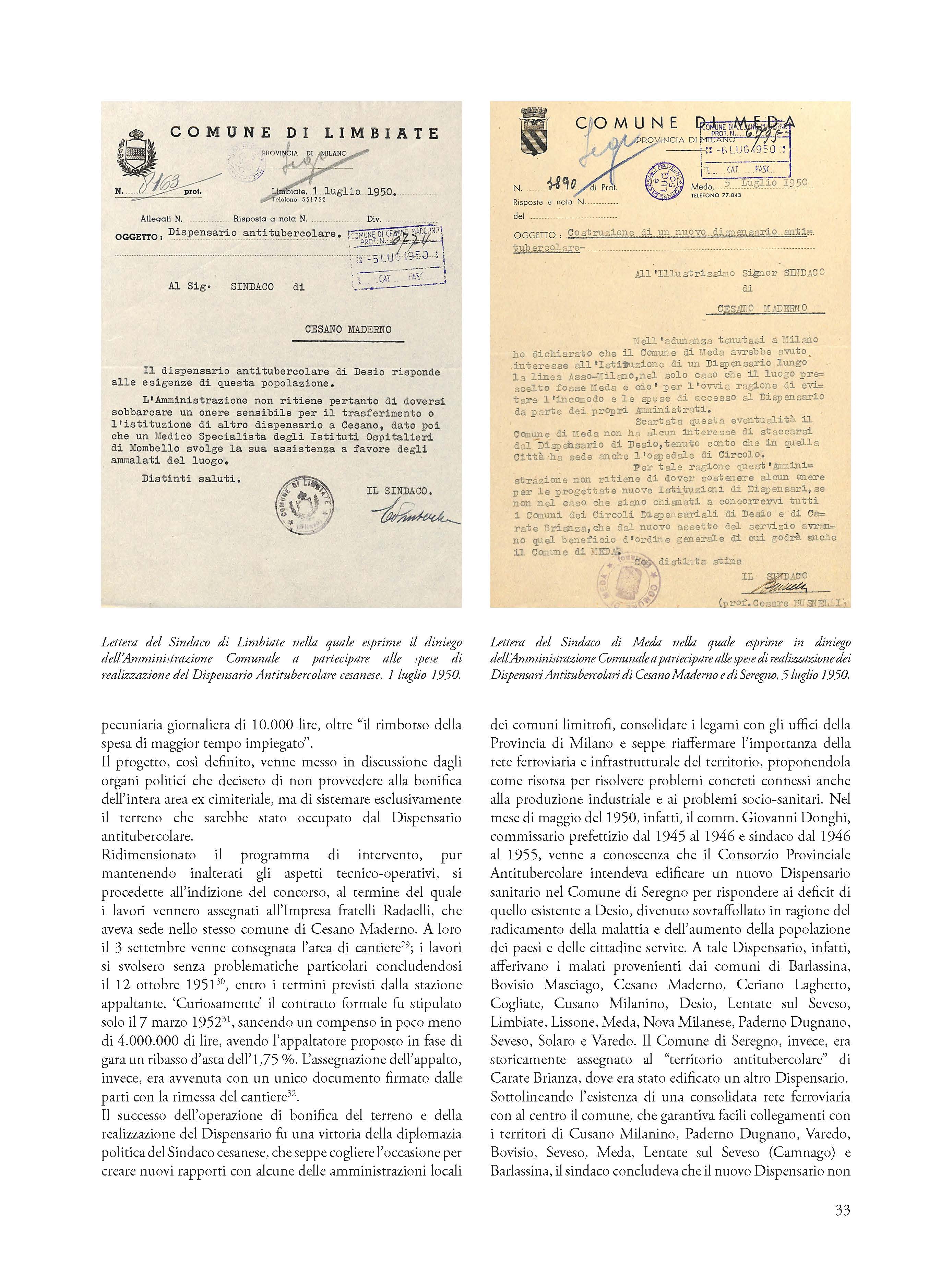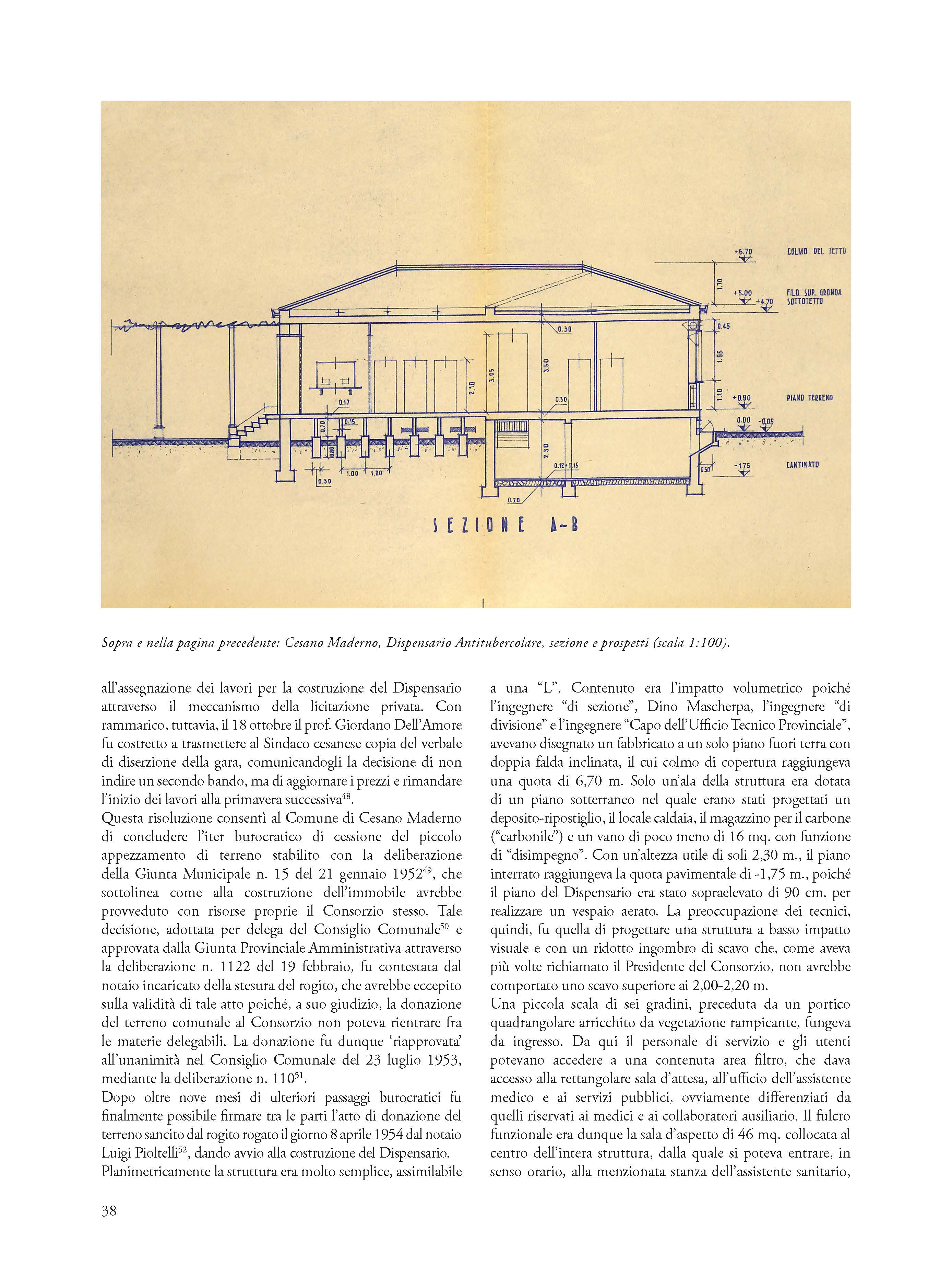 Significant example of social architecture of the fifties, the Anti-tubercular Dispensary of Cesano Maderno is the testimony of the ministerial project to mark the Italian territory through the widespread presence of observatories and local health centers. In addition to identifying the salient design phases and the bureaucratic process that led to the construction of the Cesanese health and hygiene center, the essay retraces the previous phases to its construction connected to the theme of the disposal of the ancient urban cemetery and the disposal of the remains from the demolition. Relying on the reading and critical interpretation of a vast, completely unpublished archival documentation, the author shows how the value of the Cesanese experience is not exclusively local in scope, but belongs to the history of the vast national cultural and medical-scientific process and to the history of attempts to combat endemic diseases and tuberculous pathologies that gave rise to specific architectural typologies not yet fully studied and valued.