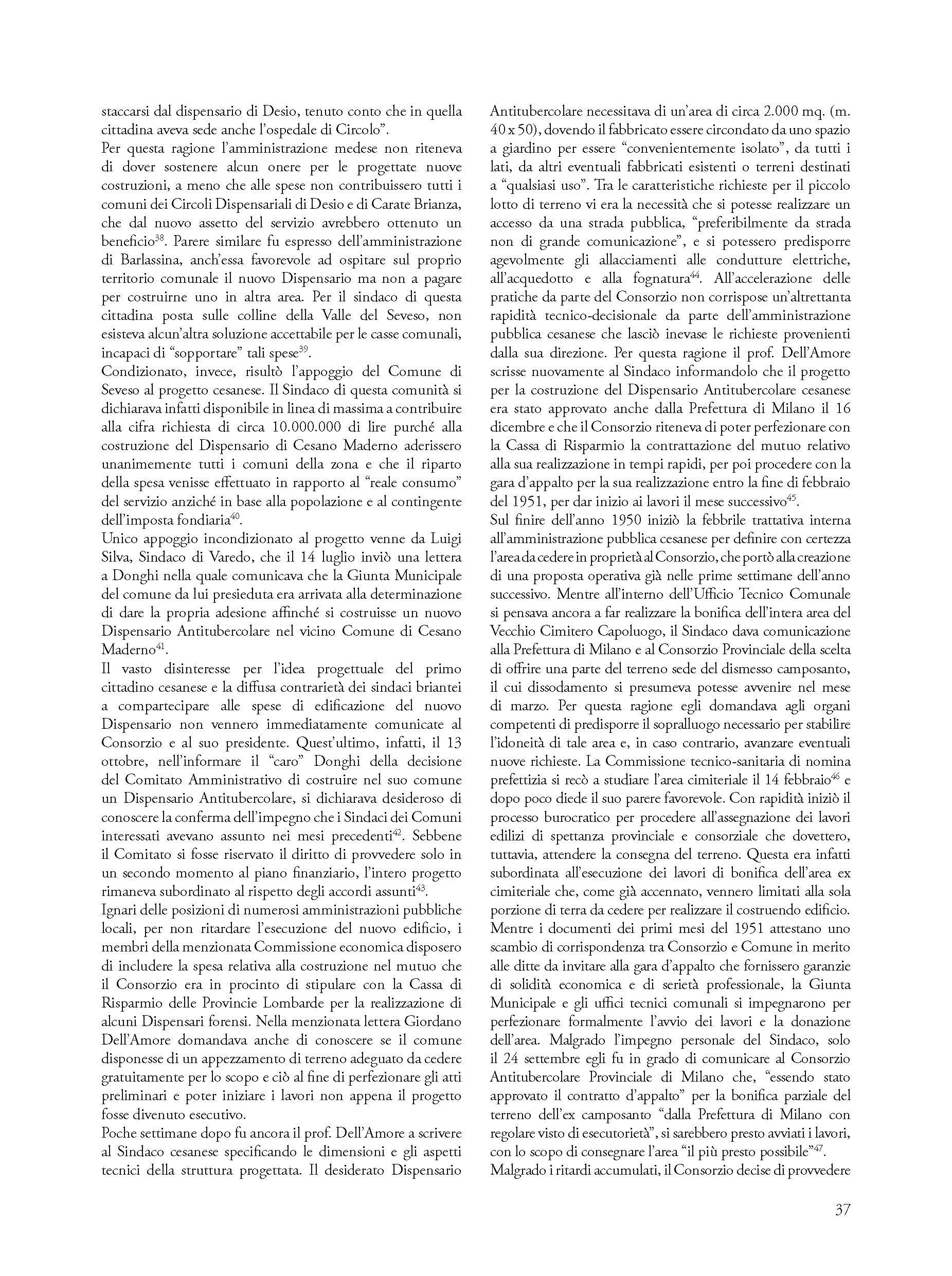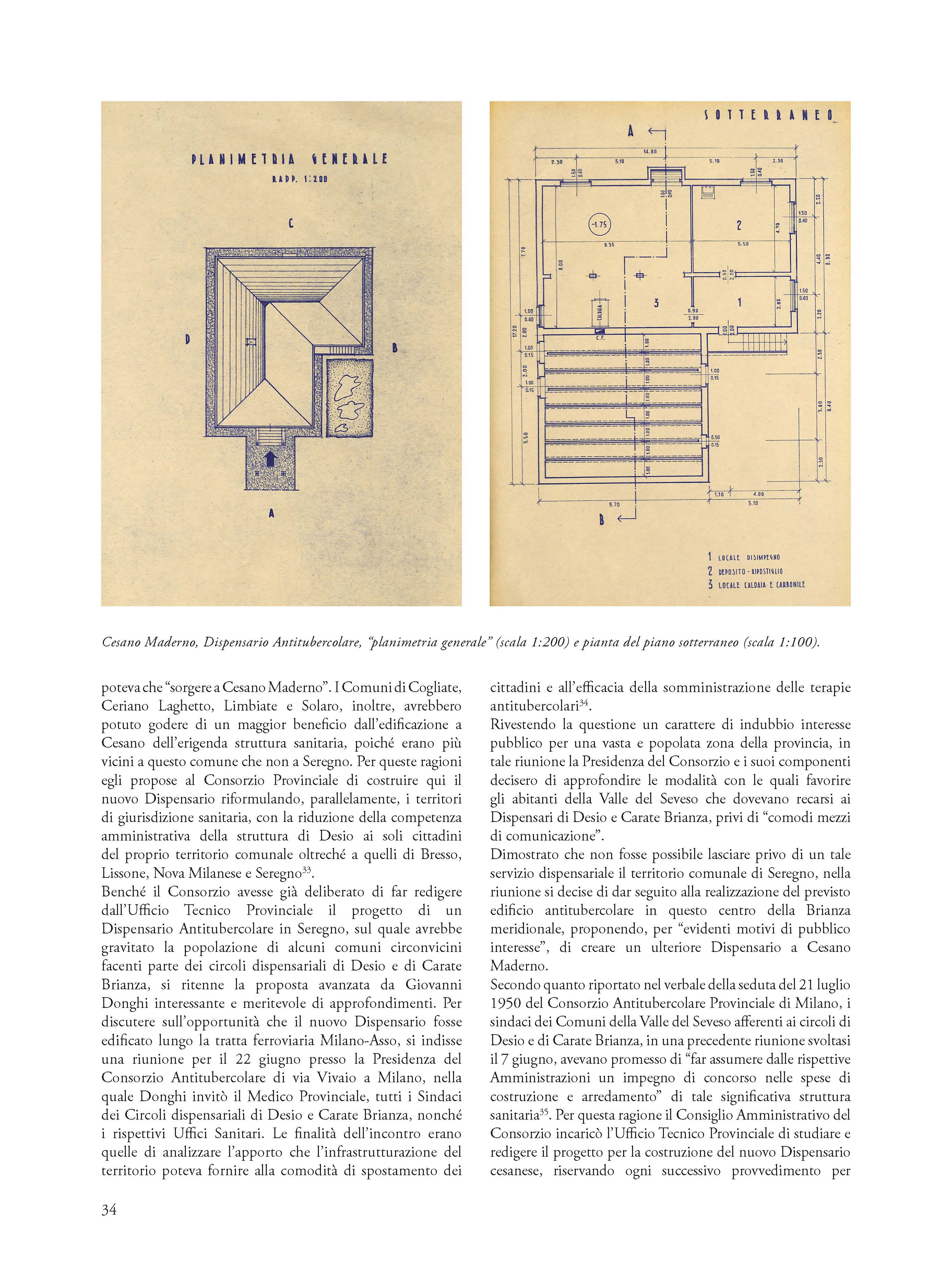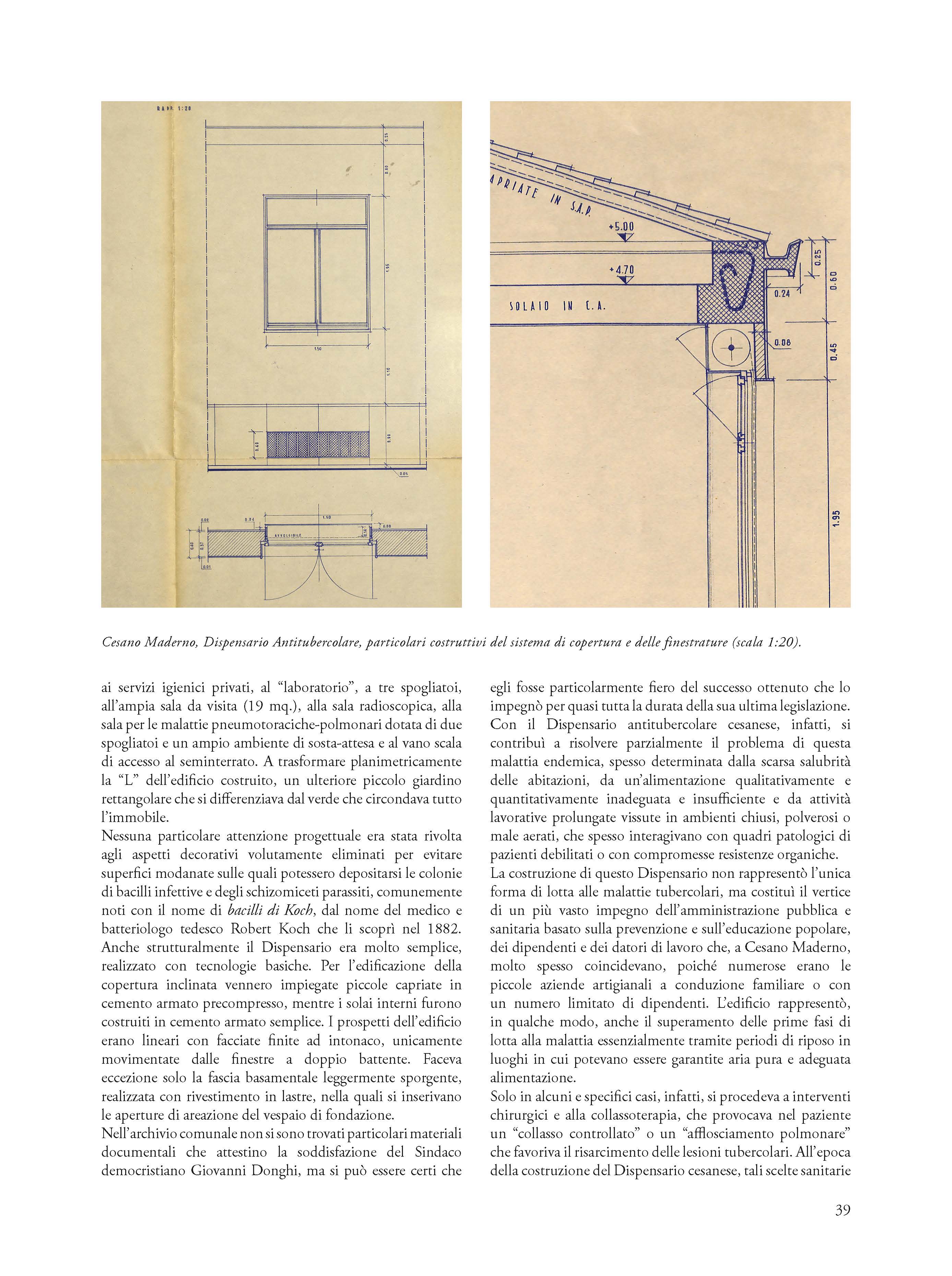 Significativo esempio di architettura sociale degli anni cinquanta, il Dispensario Antitubercolare di Cesano Maderno costituisce la testimonianza del progetto ministeriale di segnare il territorio italiano attraverso la capillare presenza di osservatori e presidi sanitari locali. Oltre a enucleare le fasi salienti progettuali e dell’iter burocratico che hanno portato all’edificazione del centro igienico-assistenziale cesanese, il saggio ripercorre le fasi precedenti alla sua realizzazione connesse al tema della dismissione dell’antico cimitero urbano e allo smaltimento dei resti dalla sua demolizione. Poggiandosi sulla lettura e interpretazione critica di un’ampia documentazione archivistica completamente inedita, l’autore mostra come il valore dell’esperienza cesanese non sia di portata esclusivamente locale, ma appartenga alla storia del vasto processo culturale e medico-scientifico nazionale e alla storia dei tentativi di contrastare le malattie endemiche e alle patologie tubercolari che diede origine a specifiche tipologie architettoniche non ancora pienamente studiate e valorizzate.