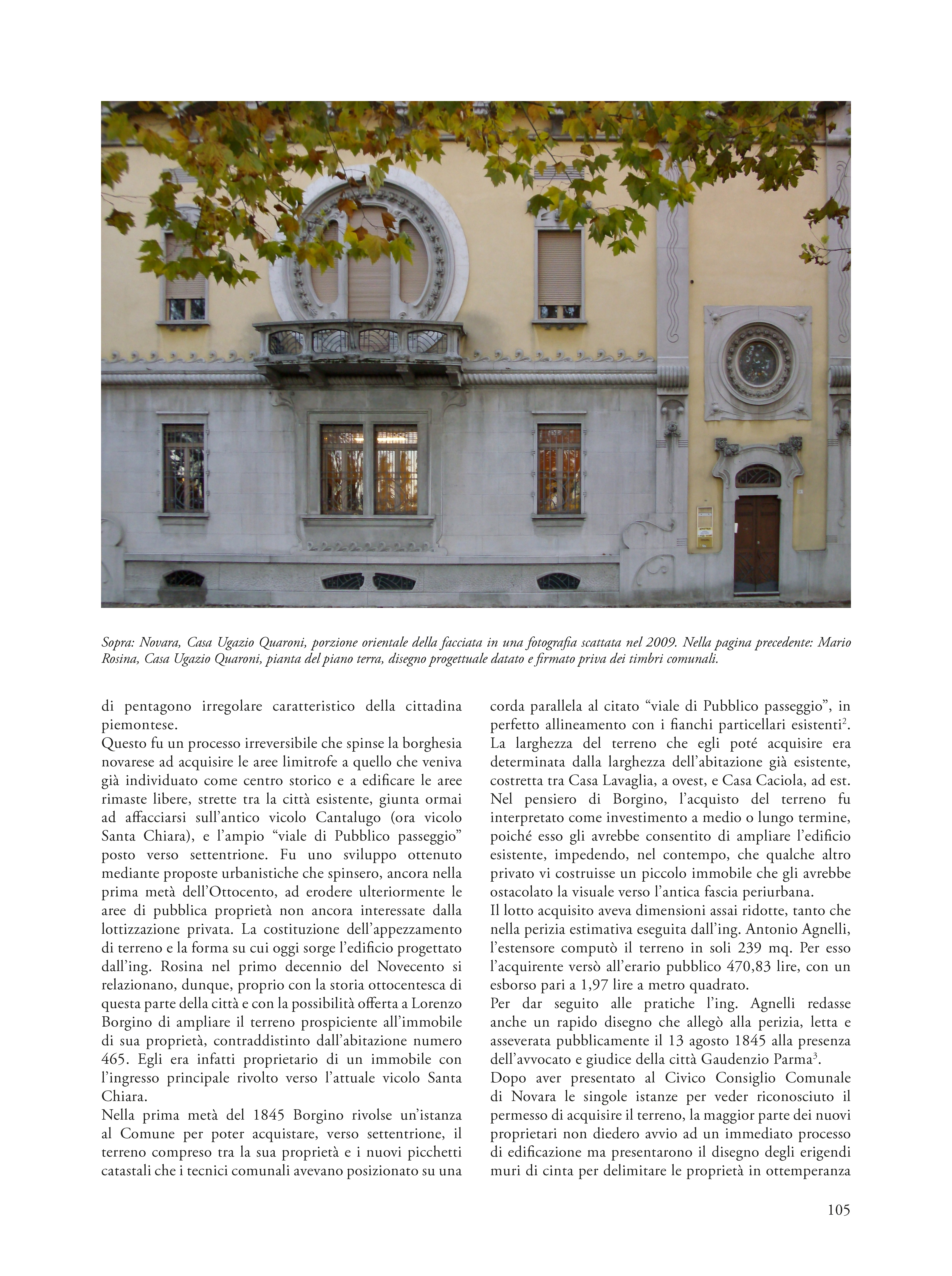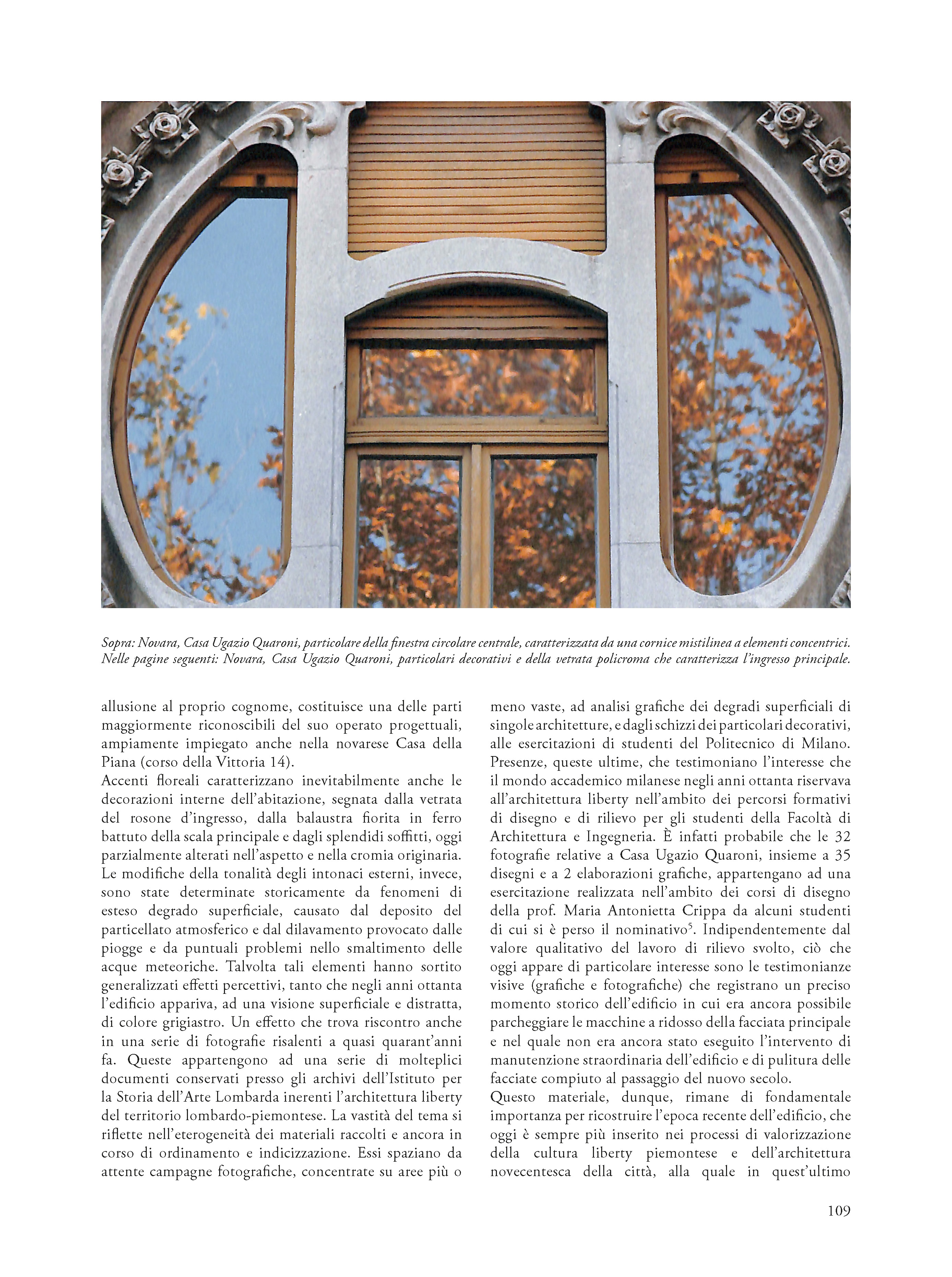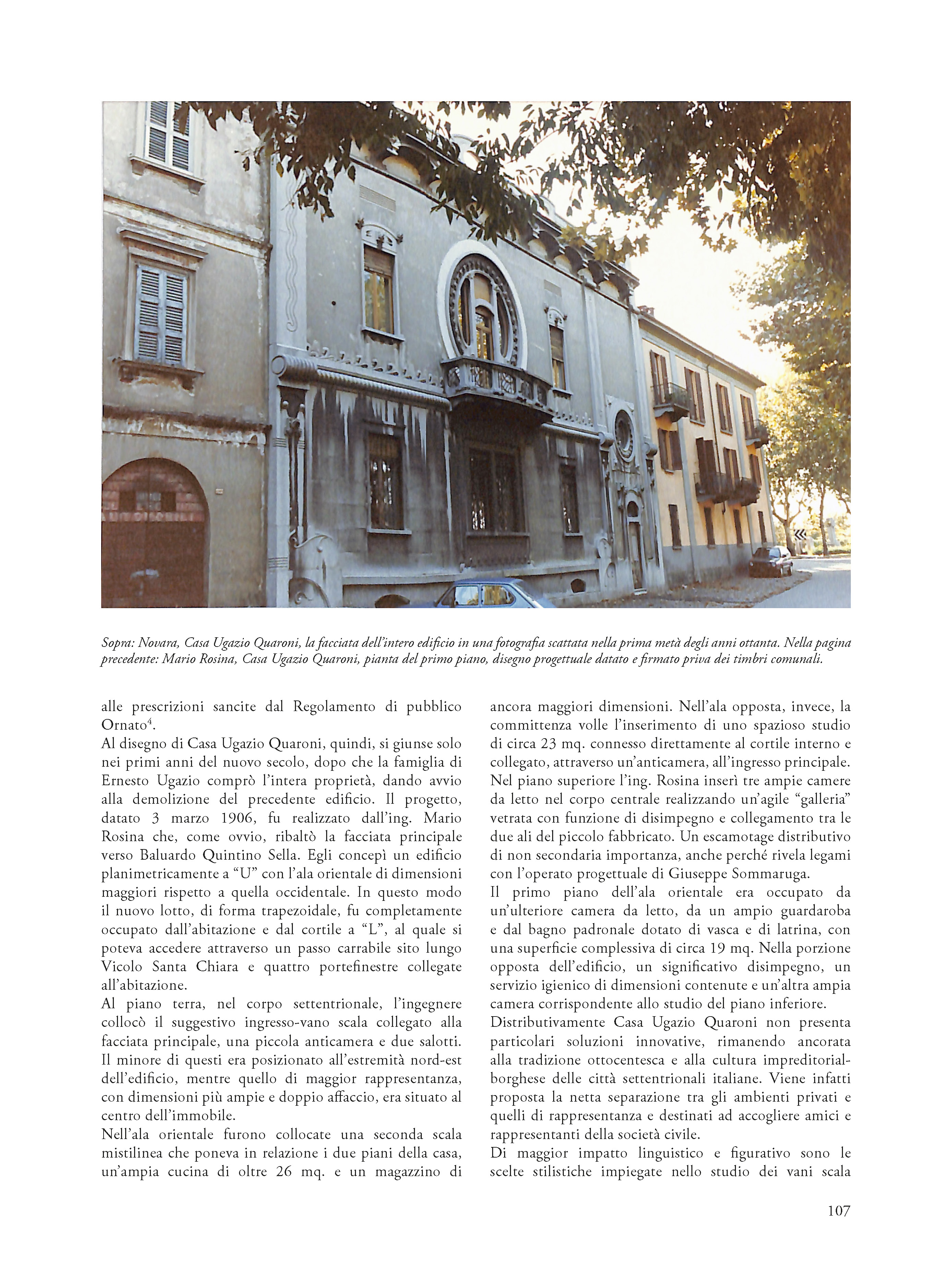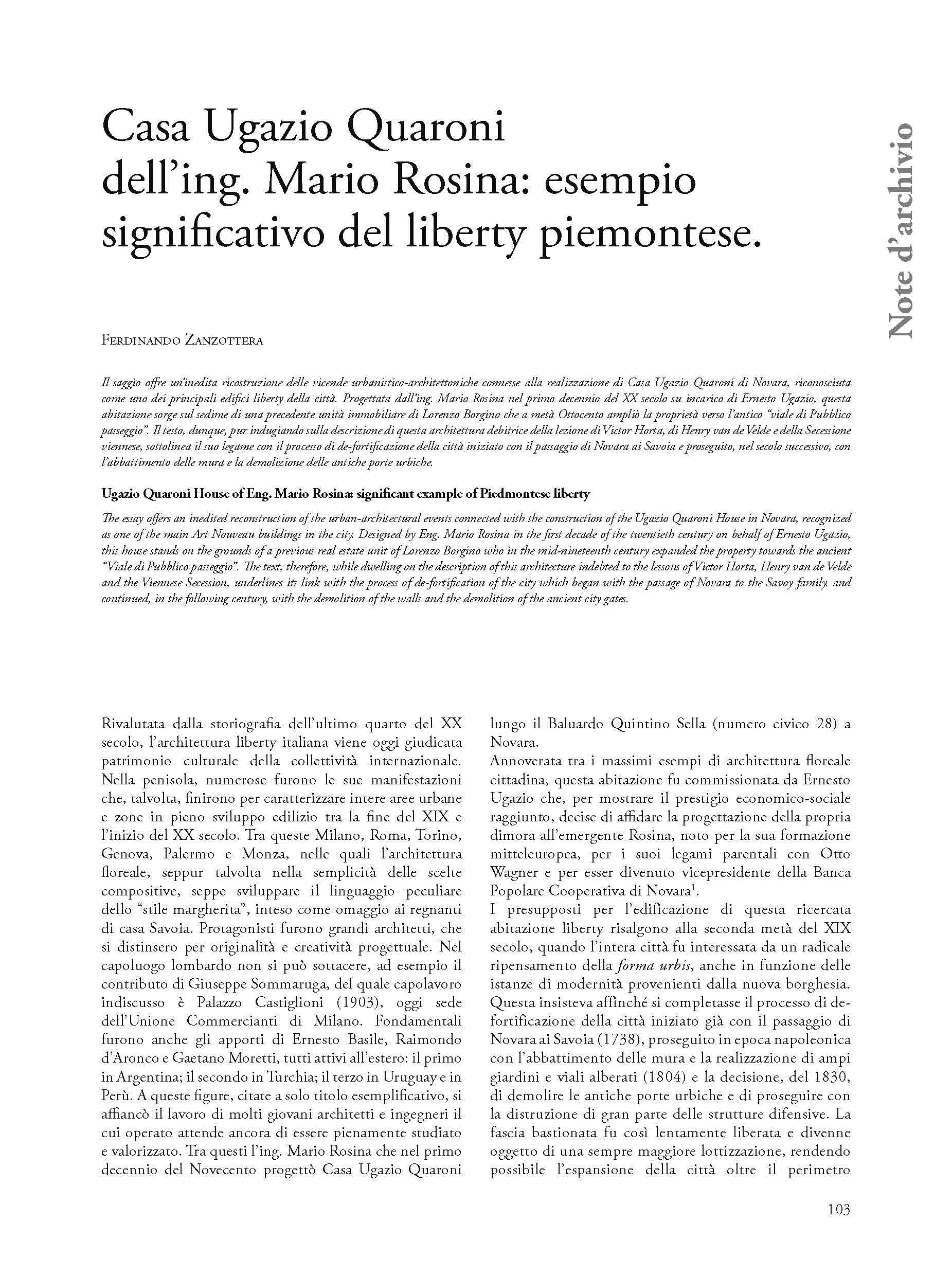 Il saggio offre un’inedita ricostruzione delle vicende urbanistico-architettoniche connesse alla realizzazione di Casa Ugazio Quaroni di Novara, riconosciuta come uno dei principali edifici liberty della città. Progettata dall’ing. Mario Rosina nel primo decennio del XX secolo su incarico di Ernesto Ugazio, questa abitazione sorge sul sedime di una precedente unità immobiliare di Lorenzo Borgino che a metà Ottocento ampliò la proprietà verso l’antico “viale di Pubblico passeggio”. Il testo, dunque, pur indugiando sulla descrizione di questa architettura debitrice della lezione di Victor Horta, di Henry van de Velde e della Secessione viennese, sottolinea il suo legame con il processo di de-fortificazione della città iniziato con il passaggio di Novara ai Savoia e proseguito, nel secolo successivo, con l’abbattimento delle mura e la demolizione delle antiche porte urbiche.