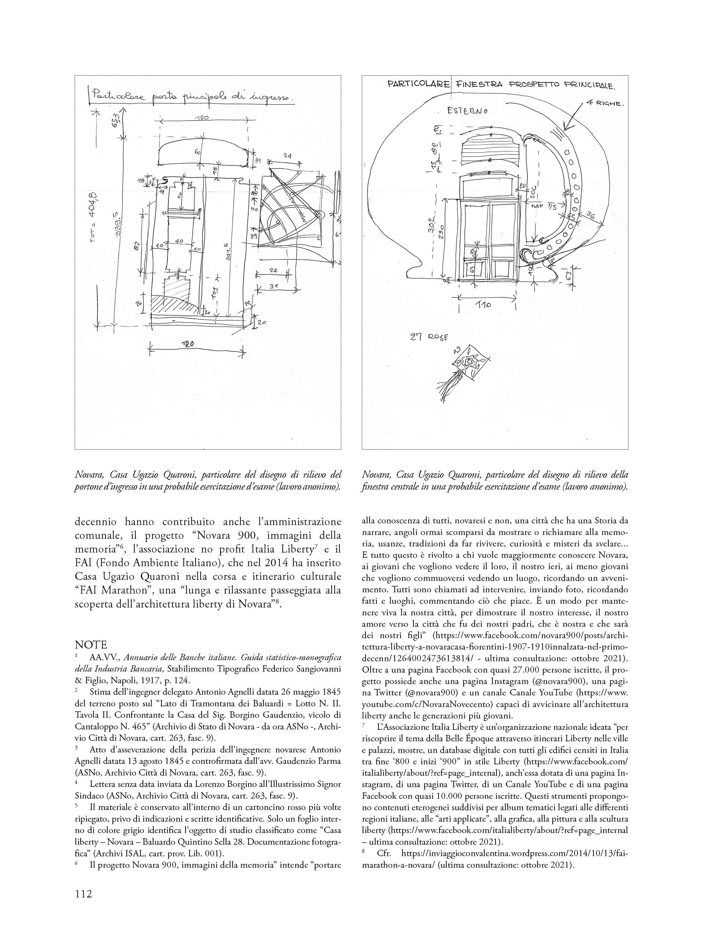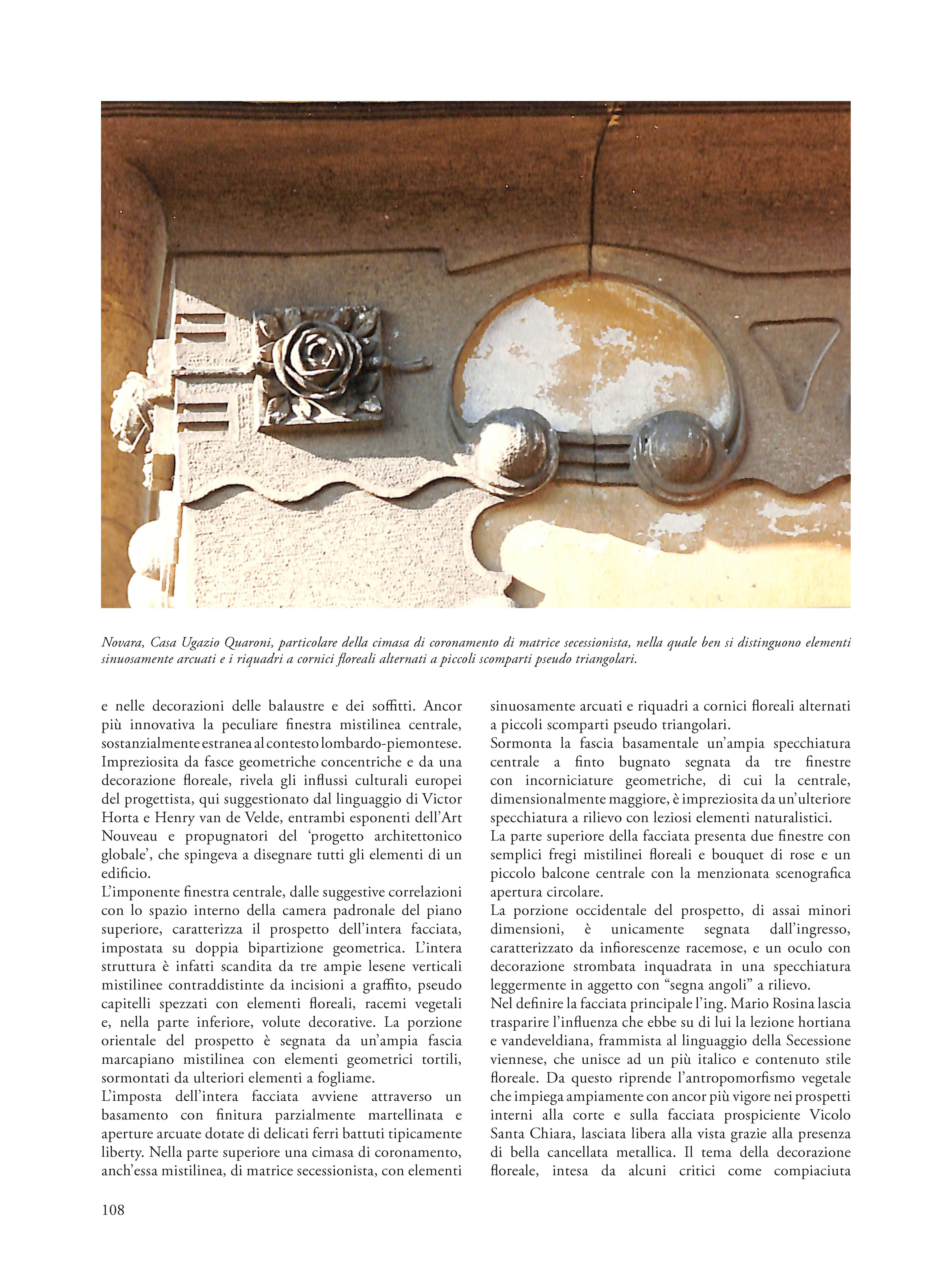 The essay offers an inedited reconstruction of the urban-architectural events connected with the construction of the Ugazio Quaroni House in Novara, recognized as one of the main Art Nouveau buildings in the city. Designed by Eng. Mario Rosina in the first decade of the twentieth century on behalf of Ernesto Ugazio, this house stands on the grounds of a previous real estate unit of Lorenzo Borgino who in the mid-nineteenth century expanded the property towards the ancient “Viale di Pubblico passeggio”. The text, therefore, while dwelling on the description of this architecture indebted to the lessons of Victor Horta, Henry van de Velde and the Viennese Secession, underlines its link with the process of de-fortification of the city which began with the passage of Novara to the Savoy family. and continued, in the following century, with the demolition of the walls and the demolition of the ancient city gates.
