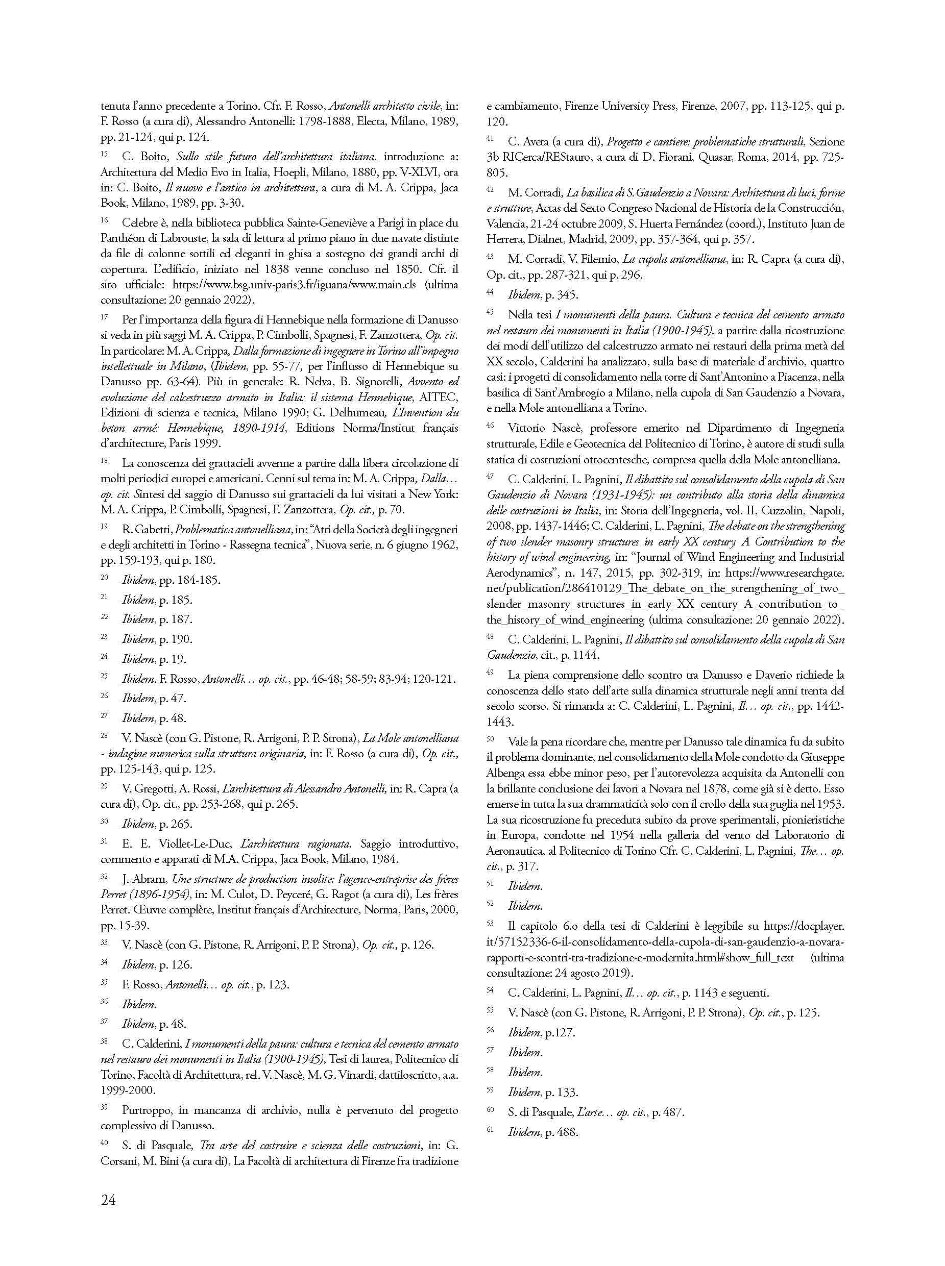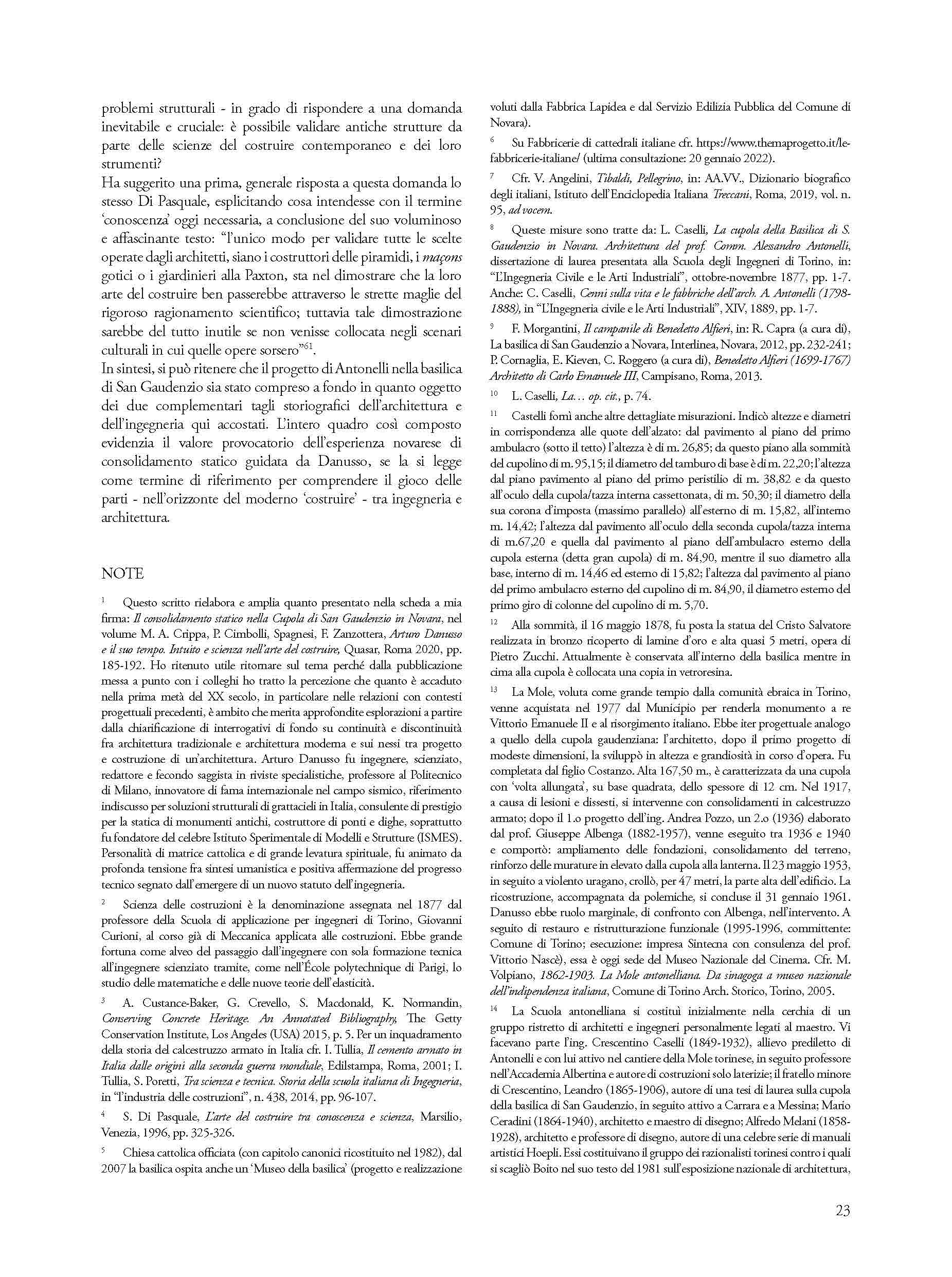 La statura eccezionale dell’ingegnere e professore Arturo Danusso (1880-1968) e l’ampiezza delle sue ricerche si sono misurate nel consolidamento strutturale della cupola dell’architetto Alessandro Antonelli (1796-1888) nella basilica di San Gaudenzio di Novara. Gli storici, soprattutto dopo la seconda guerra mondiale, hanno esplorato la genialità costruttiva di Antonelli. Alla cupola di San Gaudenzio, in particolare, hanno riconosciuto il valore di progetto realizzato secondo tecniche tradizionali ma, al tempo stesso, innovativo. Per queste ragioni l’intervento, condotto da Danusso ---, è divenuto di recente oggetto di esplorazioni scientifiche volte a dar ragione delle sue complesse contraddizioni. Gli interrogativi di allora, sulla efficacia di collaborazione tra murature tradizionali e calcestruzzo armato, sono oggi cresciuti, mentre ci si è resi conto di quanto il nuovo materiale sia deperibile, quindi bisognoso di cure e di prudenti interventi conservativi. L’argomento di questo saggio mette in luce i problemi più difficili del consolidamento strutturale in edifici realizzati con tecniche costruttive precedenti all’uso del calcestruzzo armato.