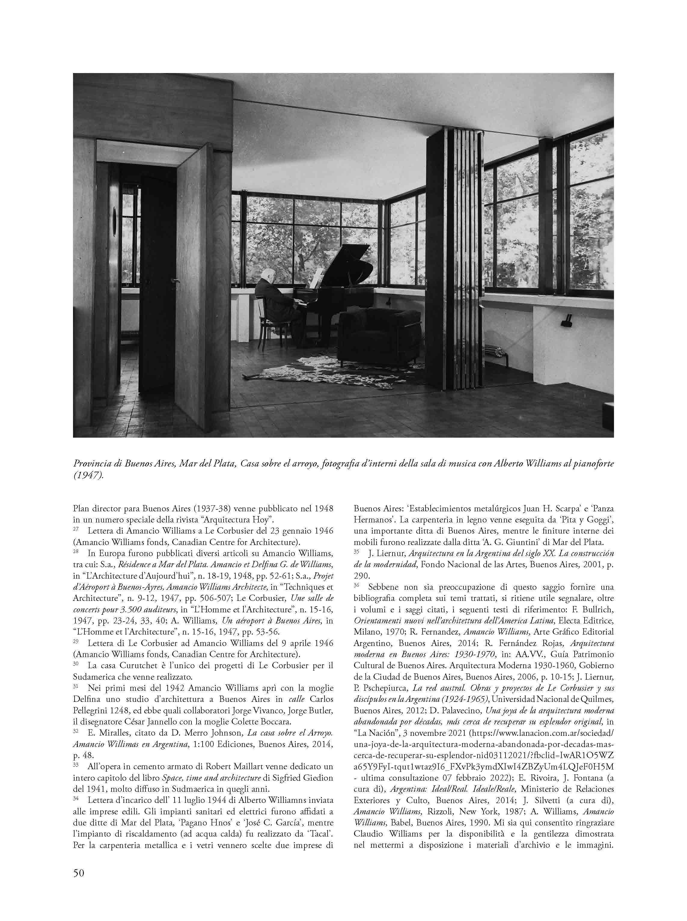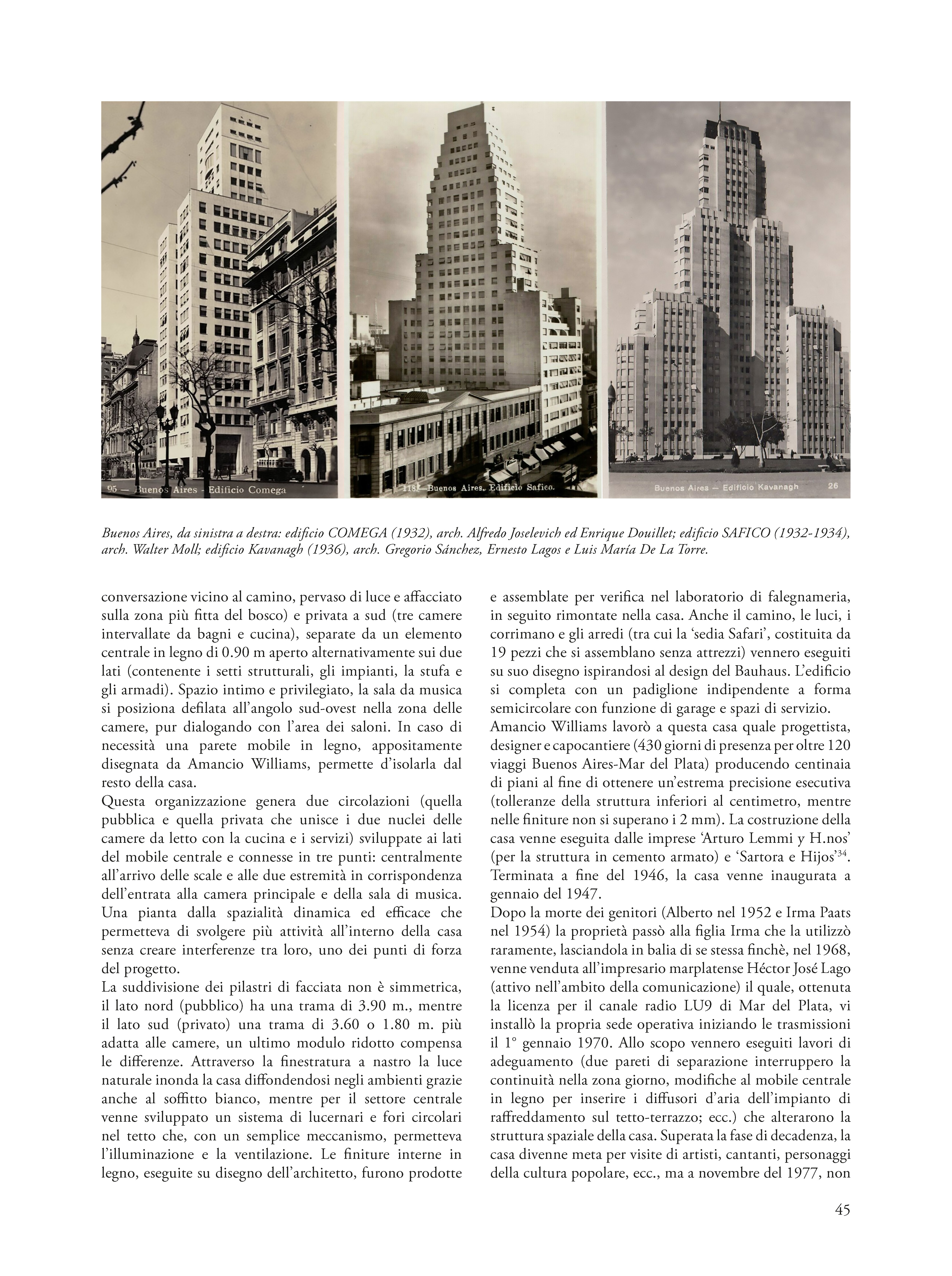 Nella Repubblica Argentina la crescita economica, le trasformazioni produttive e tecnologiche unite alla vertiginosa espansione demografica posero le basi per un processo di trasformazione sociale e culturale che portò a inizio degli anni trenta a un cambio della produzione architettonica locale, generando condizioni propizie allo sviluppo dell’idea di modernità abbracciata con assoluta convinzione. Questo saggio ripercorre le vicende che hanno portato alla diffusione dell’Architettura Moderna in Argentina, dispiegatasi in fenomeno di quantità e qualità altrove ignote, soffermandosi ad inizio anni quaranta quando il giovane architetto Amancio Williams insieme alla moglie Delfina progettò e costruì, tra il 1943 e il 1946, la ‘Casa sobre el arroyo’ nella località balneare di Mar del Plata, uno dei progetti più emblematici dell’Architettura Moderna non solo in Argentina ma anche a livello internazionale.