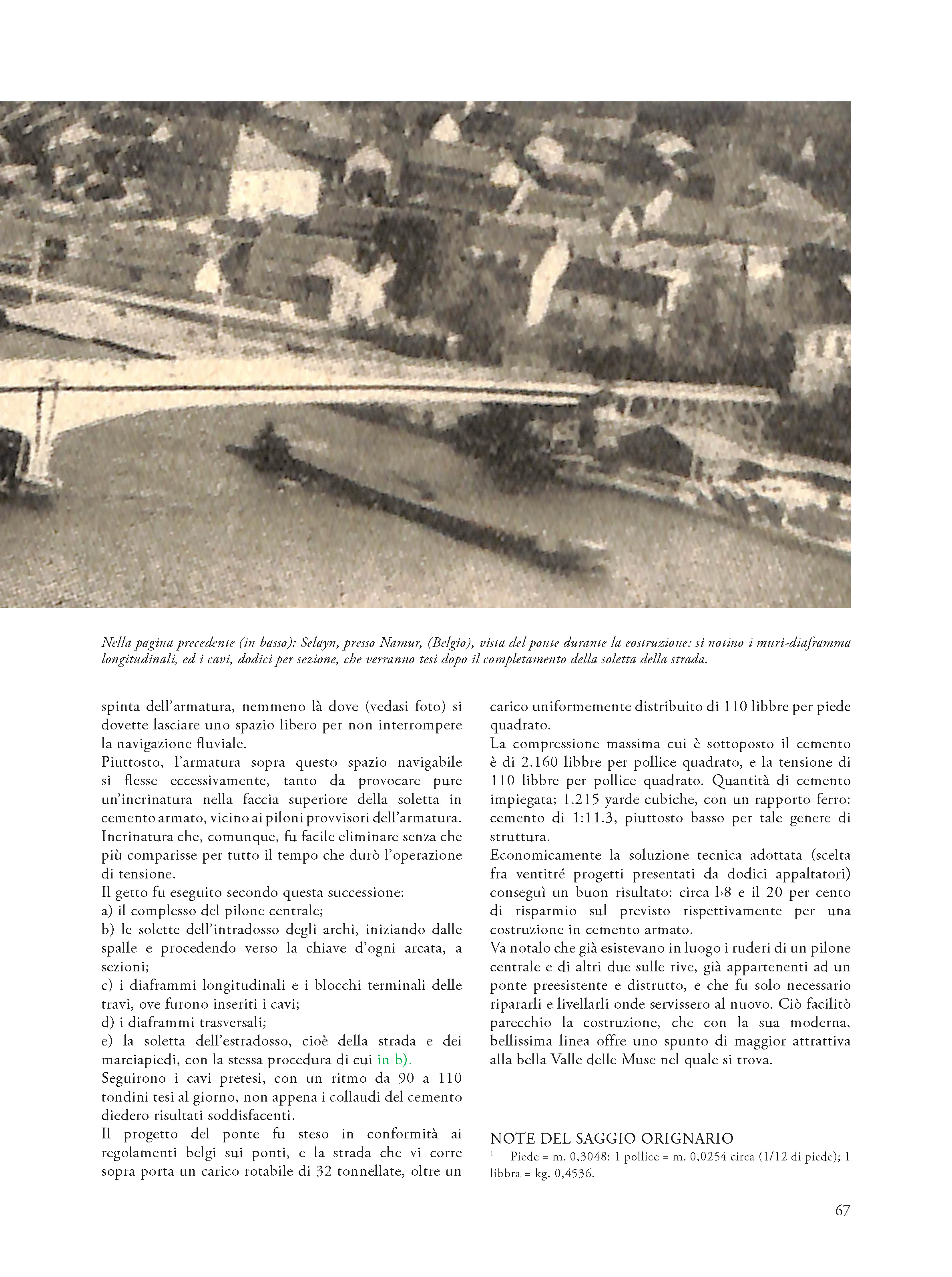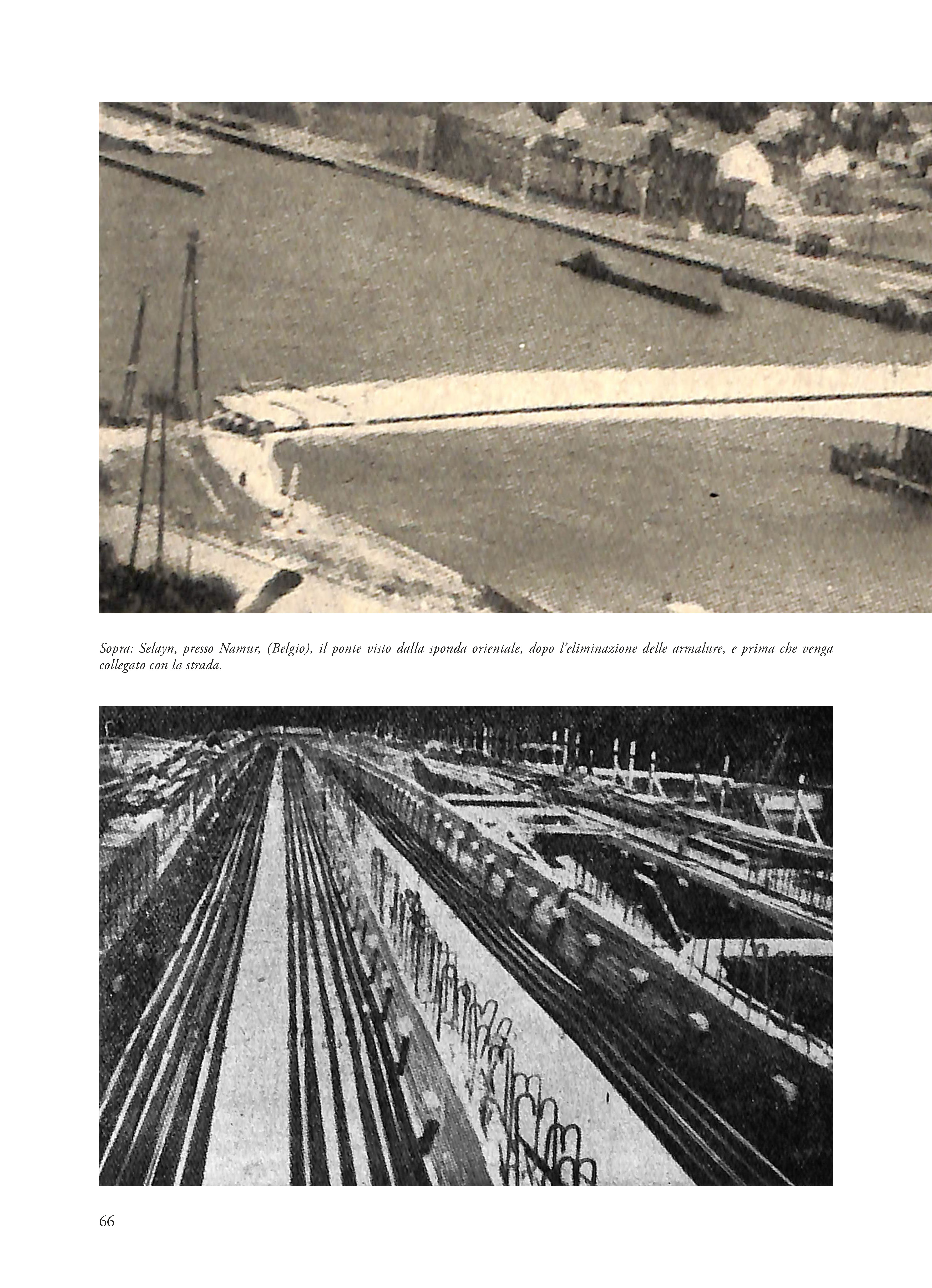Recognizing it as a significant construction in reinforced concrete, also known for being one of the first continuous bridges in pretended reinforced concrete, the author describes in great detail the large viaduct designed following the construction principles of prof. Magnel Blaston in Selayn (Belgium). After dwelling on some qualities of the materials and certain purely technical issues, such as the maximum compression value and the different phases of the castings, Perogalli recalls how some pre-existing pylons were recovered for the construction of this bridge, making it possible to build a modern work. capable of adding attraction to the beautiful Valley of the Muses.