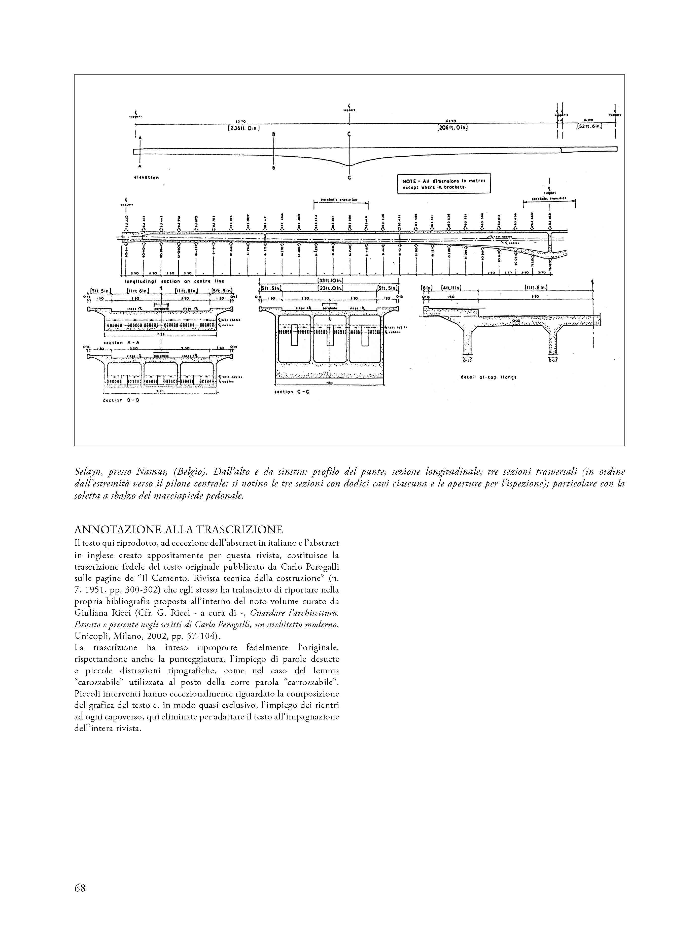 Riconoscendola come significativa costruzione in conglomerato cementizio armato, nota anche per costituire uno de primi ponti continui in cemento armato preteso, l’autore descrive con dovizia di particolari il viadotto di grandi dimensioni progettato seguendo i principi costruttivi del prof. Magnel Blaston a Selayn (Belgio). Dopo aver indugiato su alcune qualità dei materiali e certune questioni prettamente tecniche, come il valore a compressione massima e le differenti fasi dei getti, Perogalli ricorda come per la realizzazione di questo ponte si siano recuperati alcuni piloni preesistenti, rendendo possibile la costruzione di opera moderna capace di aggiungere attrattiva alla bella Valle delle Muse.