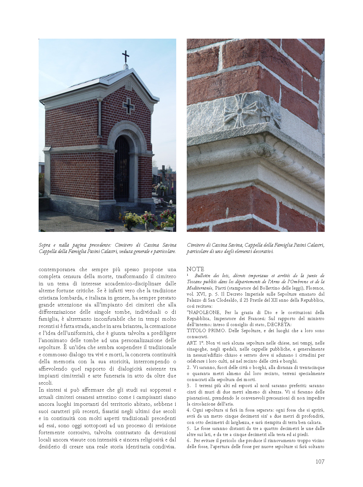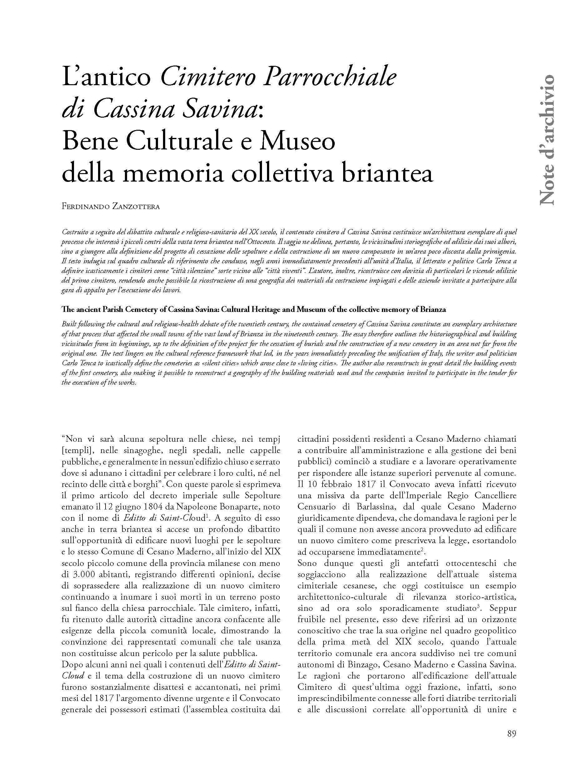 Costruito a seguito del dibattito culturale e religioso-sanitario del XX secolo, il contenuto cimitero d Cassina Savina costituisce un’architettura esemplare di quel processo che interessò i piccoli centri della vasta terra briantea nell’Ottocento. Il saggio ne delinea, pertanto, le vicissitudini storiografiche ed edilizie dai suoi albori, sino a giungere alla definizione del progetto di cessazione delle sepolture e della costruzione di un nuovo camposanto in un’area poco discosta dalla primigenia. Il testo indugia sul quadro culturale di riferimento che condusse, negli anni immediatamente precedenti all’unità d’Italia, il letterato e politico Carlo Tenca a definire icasticamente i cimiteri come “città silenziose” sorte vicino alle “città viventi”. L’autore, inoltre, ricostruisce con dovizia di particolari le vicende edilizie del primo cimitero, rendendo anche possibile la ricostruzione di una geografia dei materiali da costruzione impiegati e delle aziende invitate a partecipare alla gara di appalto per l’esecuzione dei lavori.