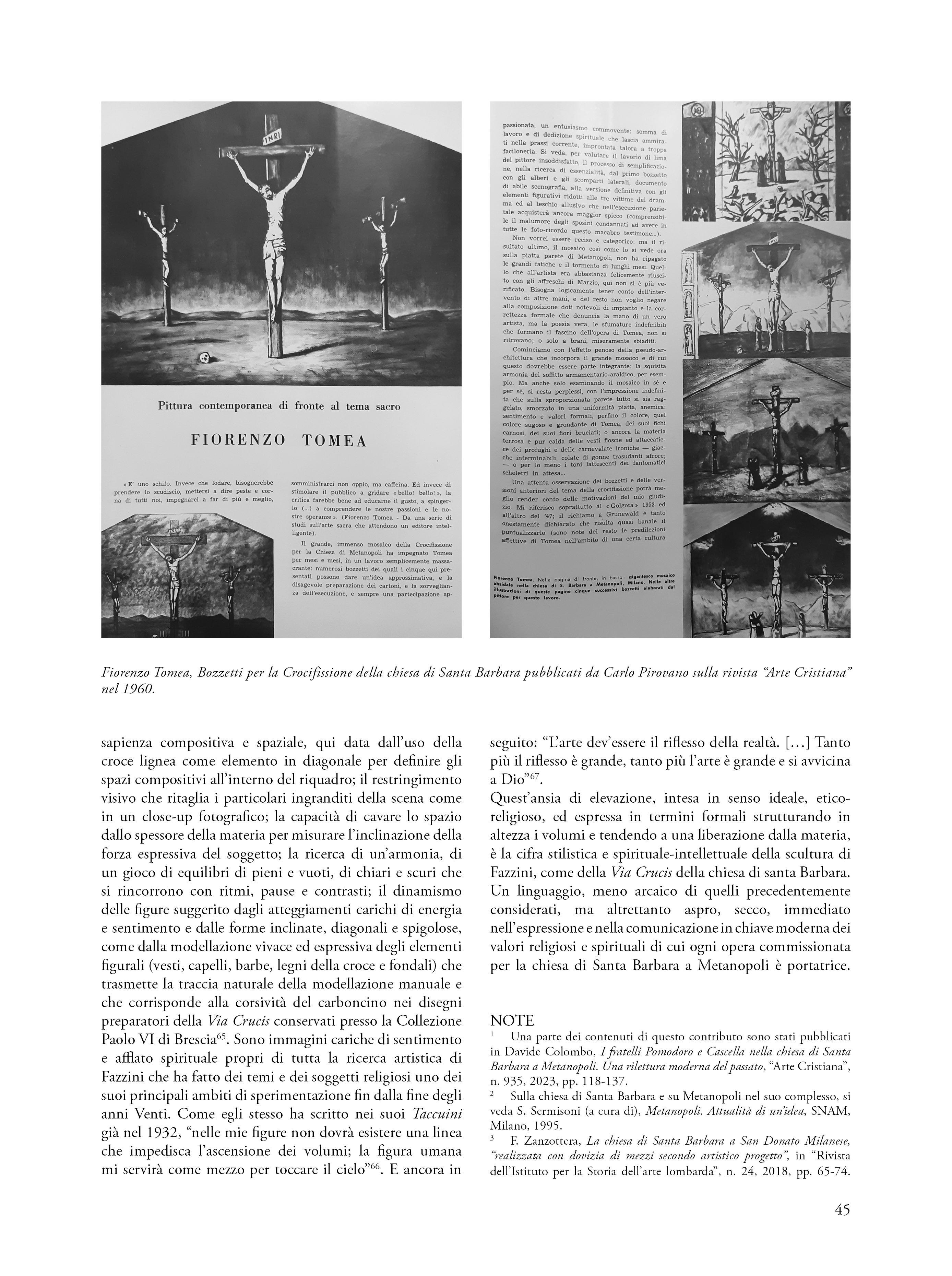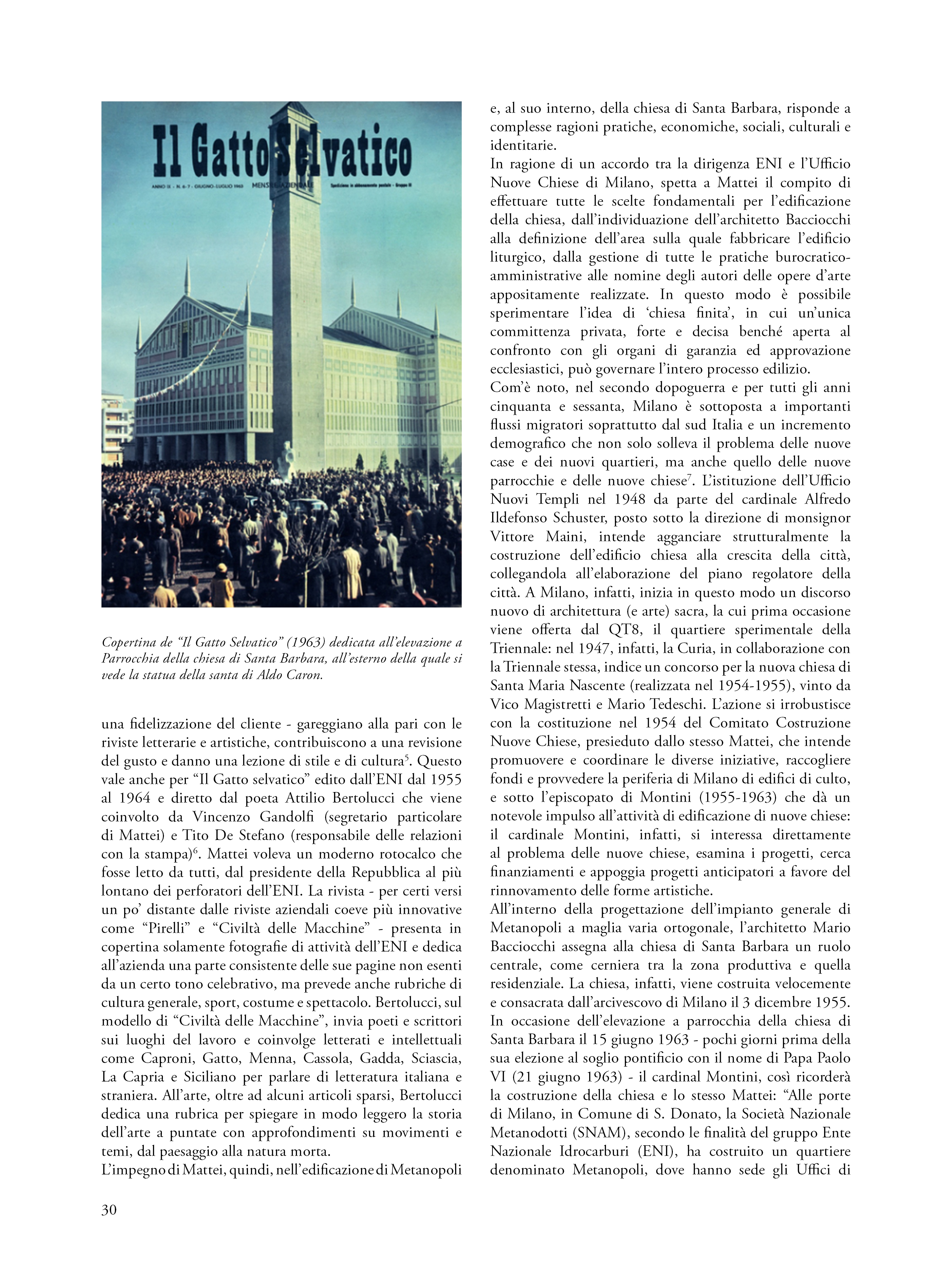 Partendo dal caso specifico dell’edificio di Santa Barbara, il saggio approfondisce il rapporto esistente tra tradizione e modernità all’interno della Chiesa e la sua apertura a professionisti, pittori e scultori contemporanei per le scelte architettoniche ed artistiche. Dopo aver indagato le principali vicende storiche della chiesa di Metanopoli, l’autore individua due momenti cronologici di affidamento dei lavori all’interno della chiesa milanese: una prima fase, coincidente agli anni di costruzione del nuovo edifico liturgico, nel quale saranno chiamati ad operare Andrea e Pietro Cascella e Giò e Arnaldo Pomodoro, e un secondo momento (1958-1962), quando, ad eccezione del più giovane Perez, verranno commissionate le opere a pittori e scultori della generazione degli anni dieci, le cui carriere consolidate erano segnate anche dalla partecipazione alla Biennale di Venezia, alla Triennale di Milano e alla Quadriennale di Roma.