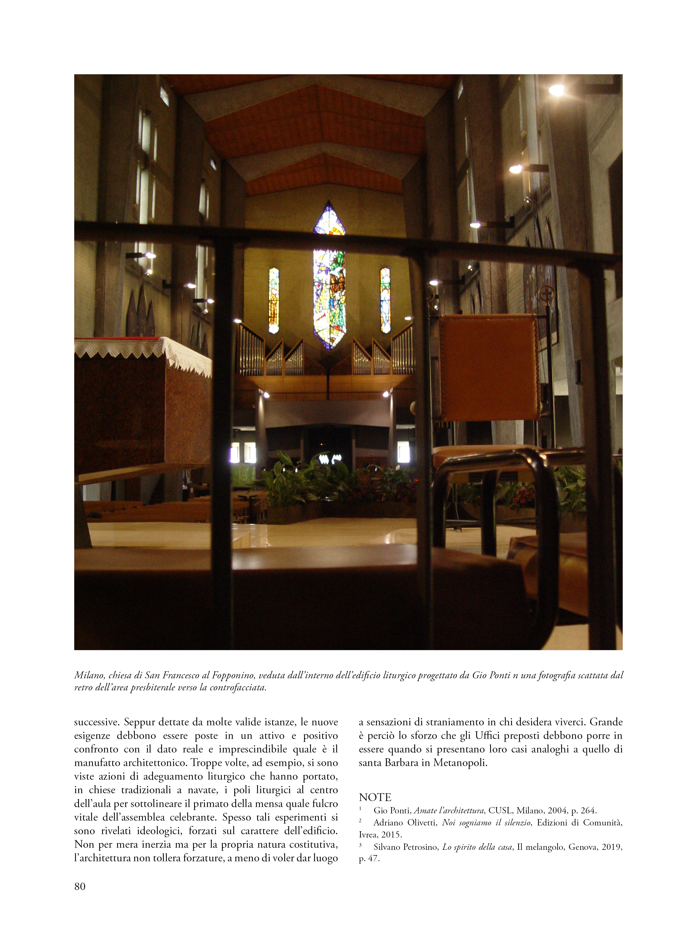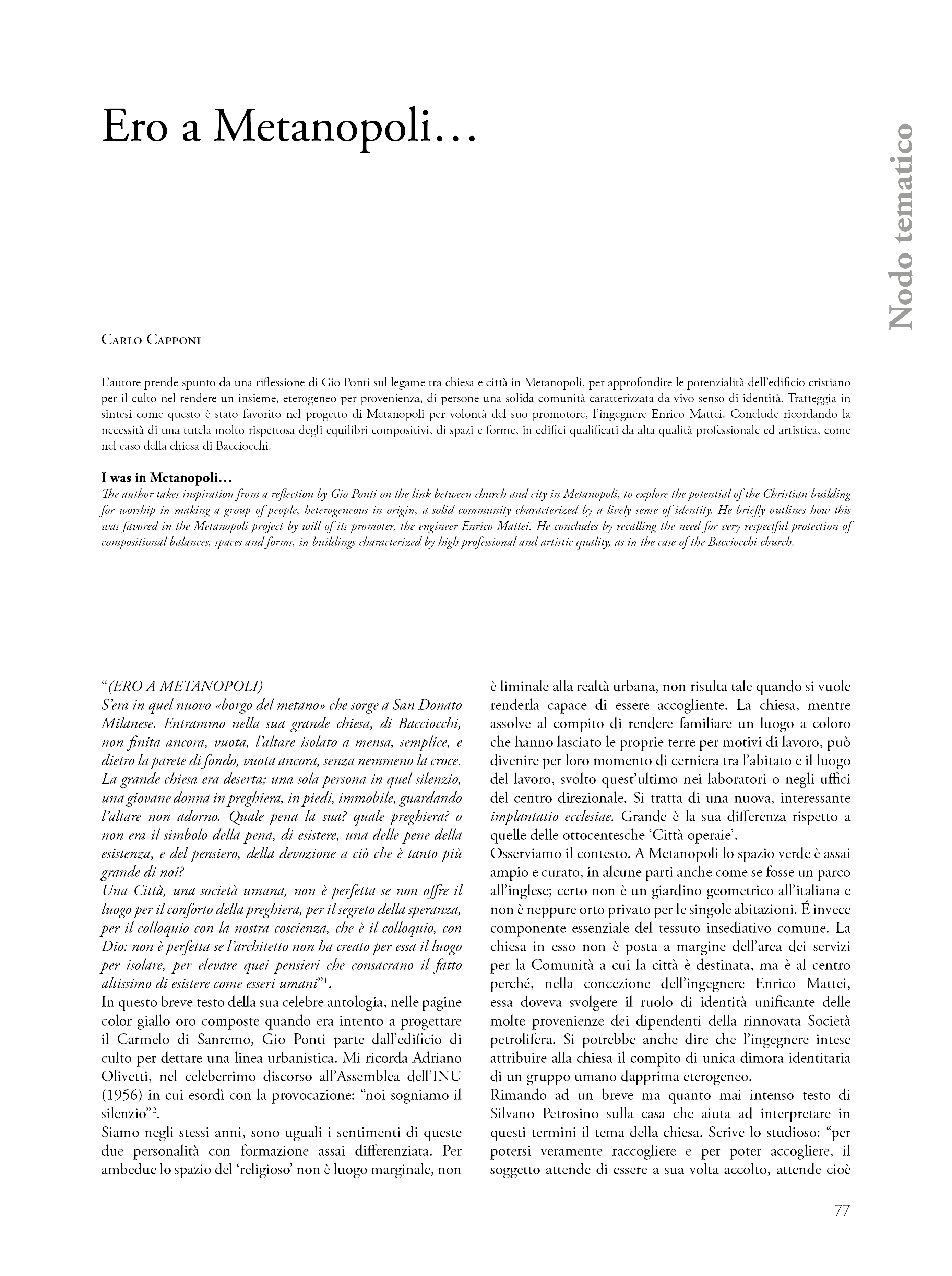 L’autore prende spunto da una riflessione di Gio Ponti sul legame tra chiesa e città in Metanopoli, per approfondire le potenzialità dell’edificio cristiano per il culto nel rendere un insieme, eterogeneo per provenienza, di persone una solida comunità caratterizzata da vivo senso di identità. Tratteggia in sintesi come questo è stato favorito nel progetto di Metanopoli per volontà del suo promotore, l’ingegnere Enrico Mattei. Conclude ricordando la necessità di una tutela molto rispettosa degli equilibri compositivi, di spazi e forme, in edifici qualificati da alta qualità professionale ed artistica, come nel caso della chiesa di Bacciocchi.