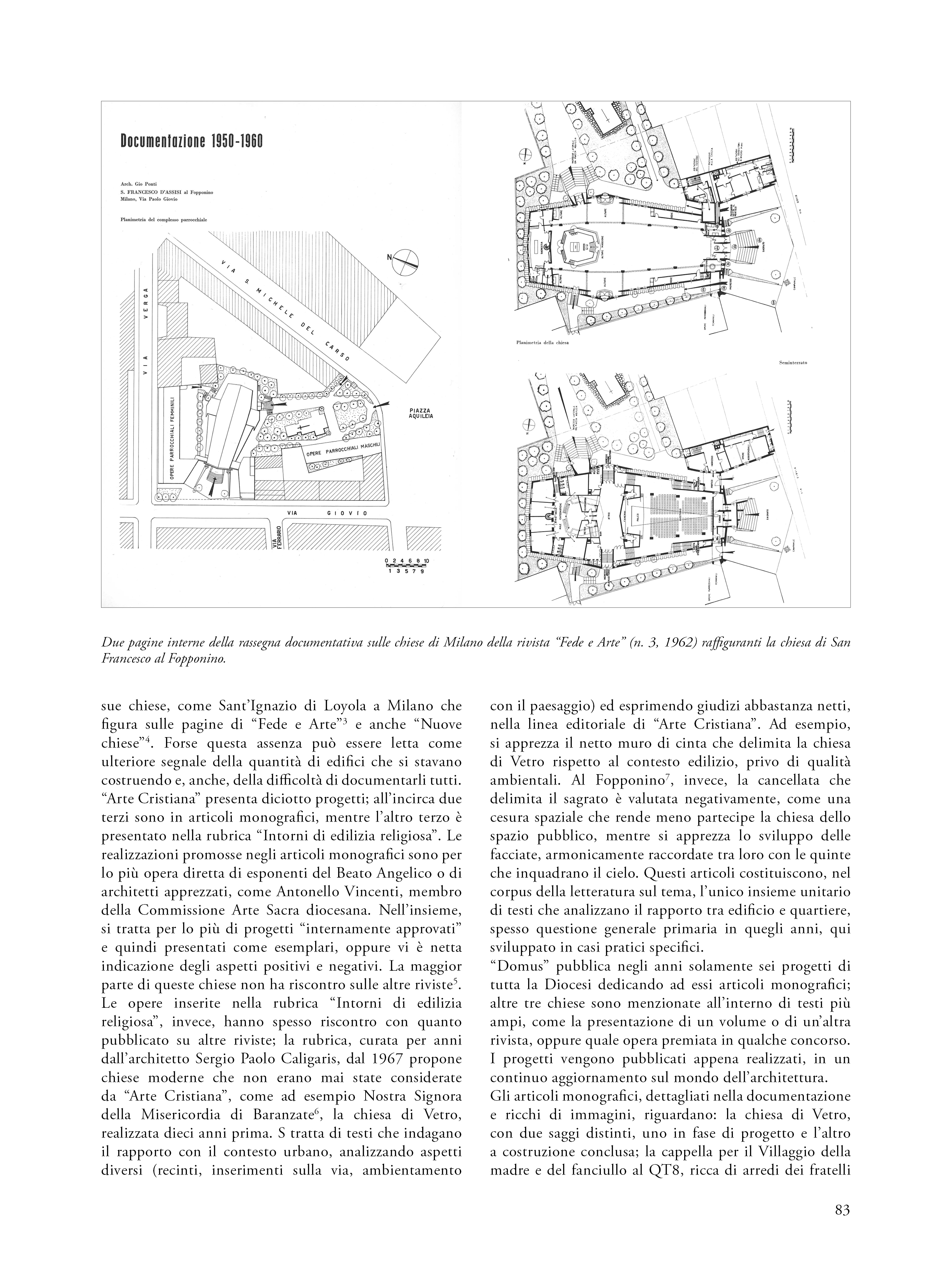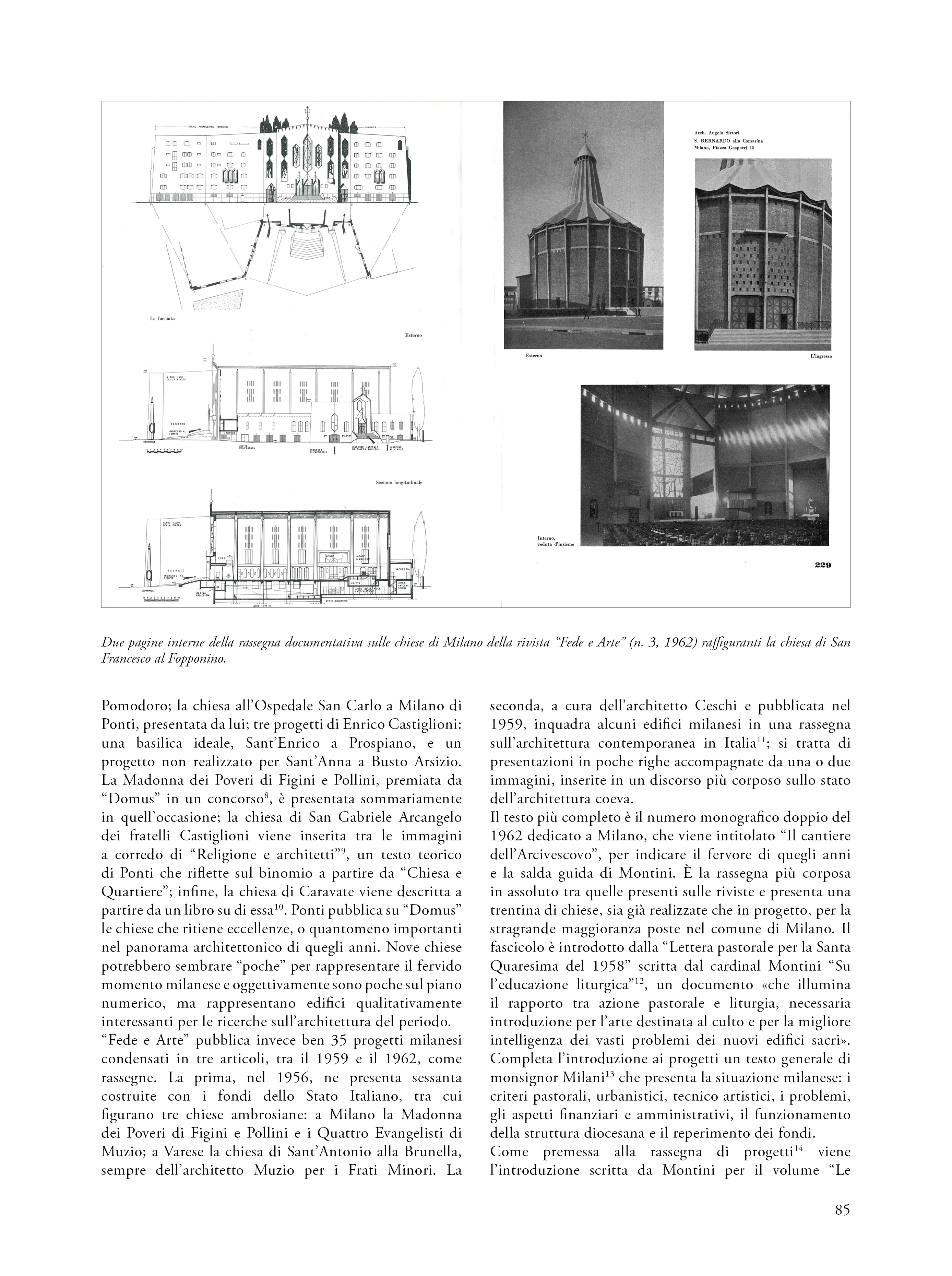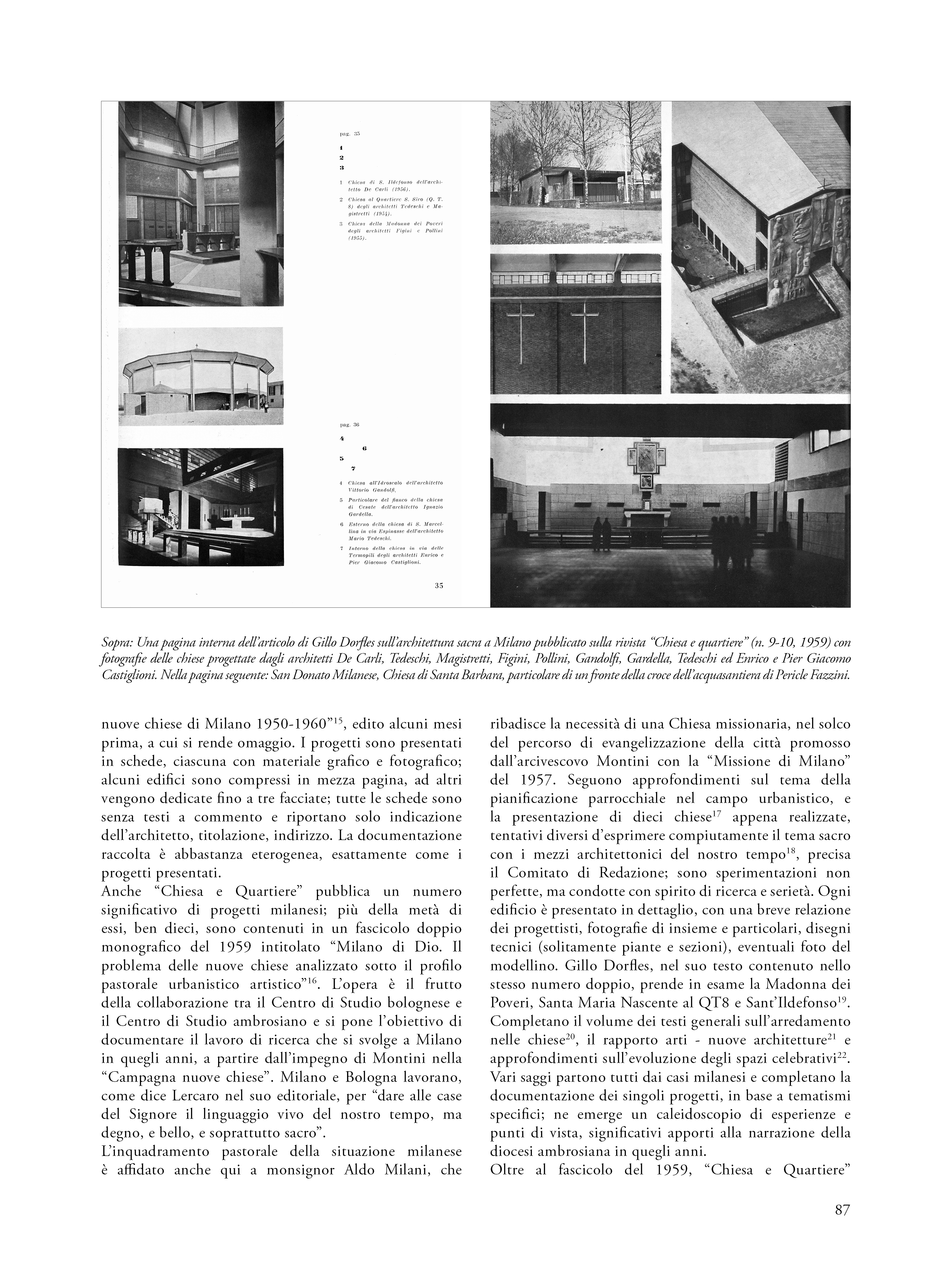 The author, starting from the examination of five specialist magazines analyzed over the course of twenty-five years (1945-1970), intends to highlight the nature and reasons for the interest in the new parish churches, numerous in those years in the Ambrosian diocese. To this end, she investigates “Domus” and “Arte cristiana” throughout the period; for more limited time periods “Fede e Arte”, “Chiesa e Quartiere” and “Nuove chiese”. The investigation allows her to collect and compare descriptive information and critical notes for approximately eighty cases. You draw a very rich documentary picture from it, with insights into the construction of the modern city and the pastoral, social and architectural vitality of Milan. In it, the period of Cardinal Montini’s episcopate emerges above all. Finally, she probes the reasons for the predilection and ways of illustrating the churches in the various magazines, identifying for ideas, worthy of further investigation, both editorial reasons and options strictly connected to the historical moment.