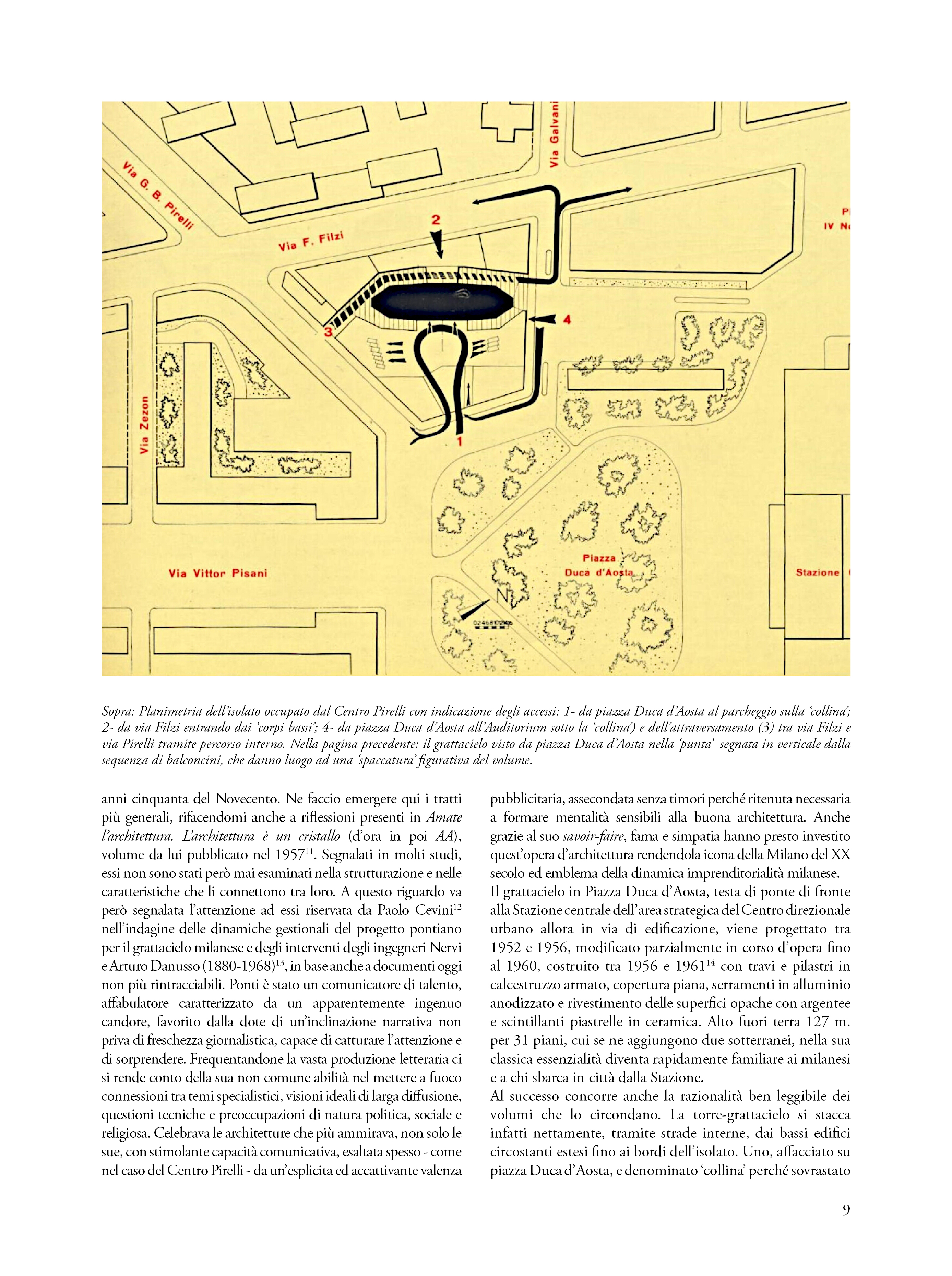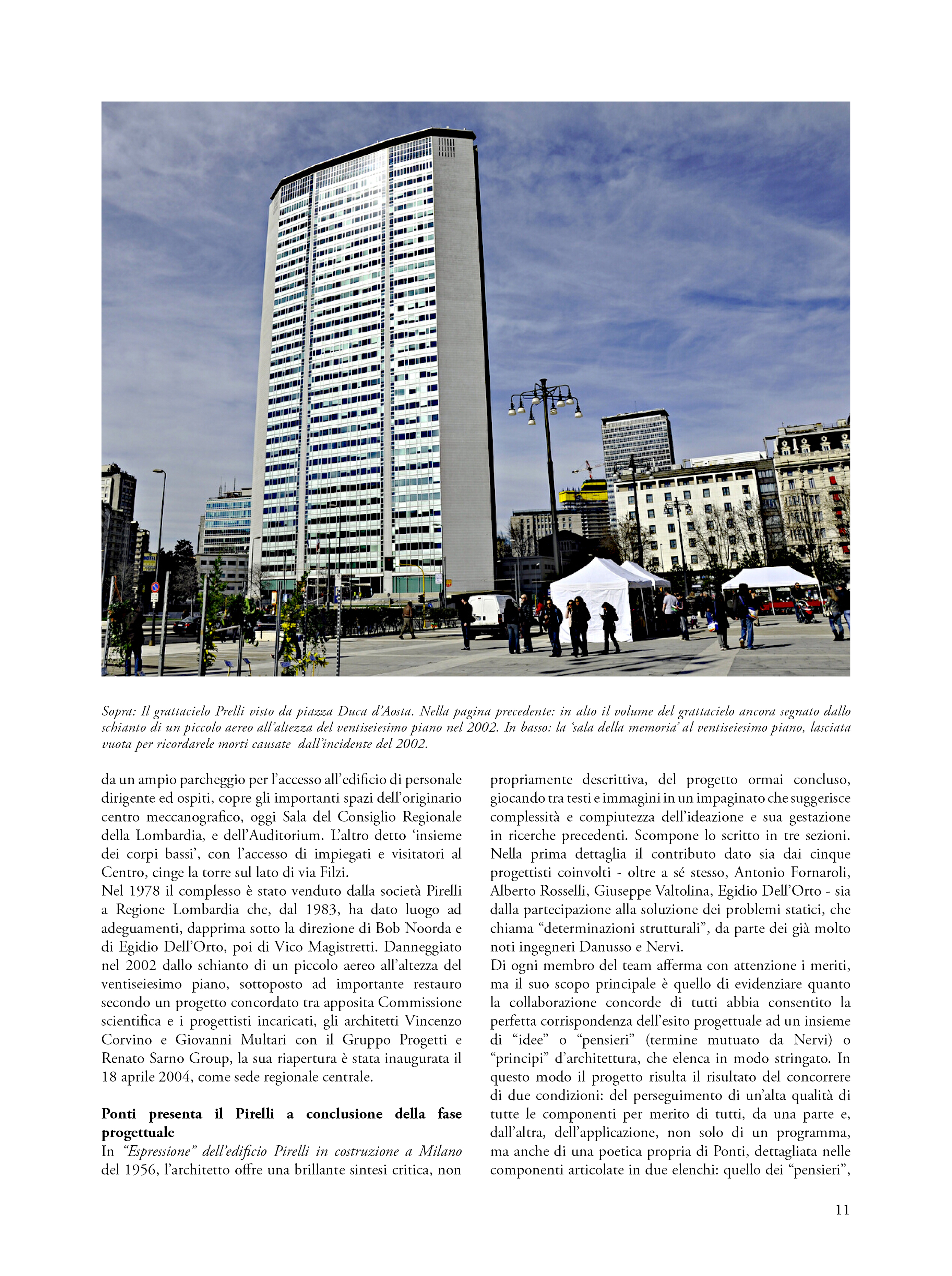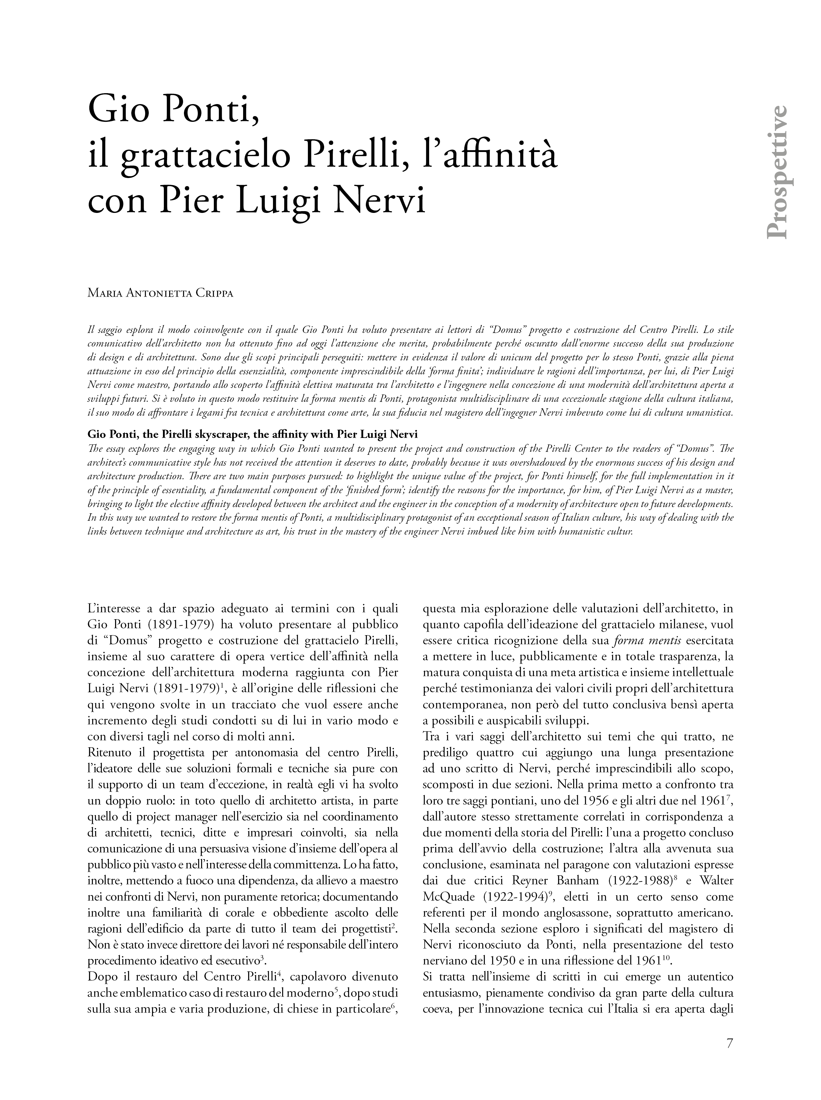 Il saggio esplora il modo coinvolgente con il quale Gio Ponti ha voluto presentare ai lettori di “Domus” progetto e costruzione del Centro Pirelli. Lo stile comunicativo dell’architetto non ha ottenuto fino ad oggi l’attenzione che merita, probabilmente perché oscurato dall’enorme successo della sua produzione di design e di architettura. Sono due gli scopi principali perseguiti: mettere in evidenza il valore di unicum del progetto per lo stesso Ponti, grazie alla piena attuazione in esso del principio della essenzialità, componente imprescindibile della ‘forma finita’; individuare le ragioni dell’importanza, per lui, di Pier Luigi Nervi come maestro, portando allo scoperto l’affinità elettiva maturata tra l’architetto e l’ingegnere nella concezione di una modernità dell’architettura aperta a sviluppi futuri. Si è voluto in questo modo restituire la forma mentis di Ponti, protagonista multidisciplinare di una eccezionale stagione della cultura italiana, il suo modo di affrontare i legami fra tecnica e architettura come arte, la sua fiducia nel magistero dell’ingegner Nervi imbevuto come lui di cultura umanistica.