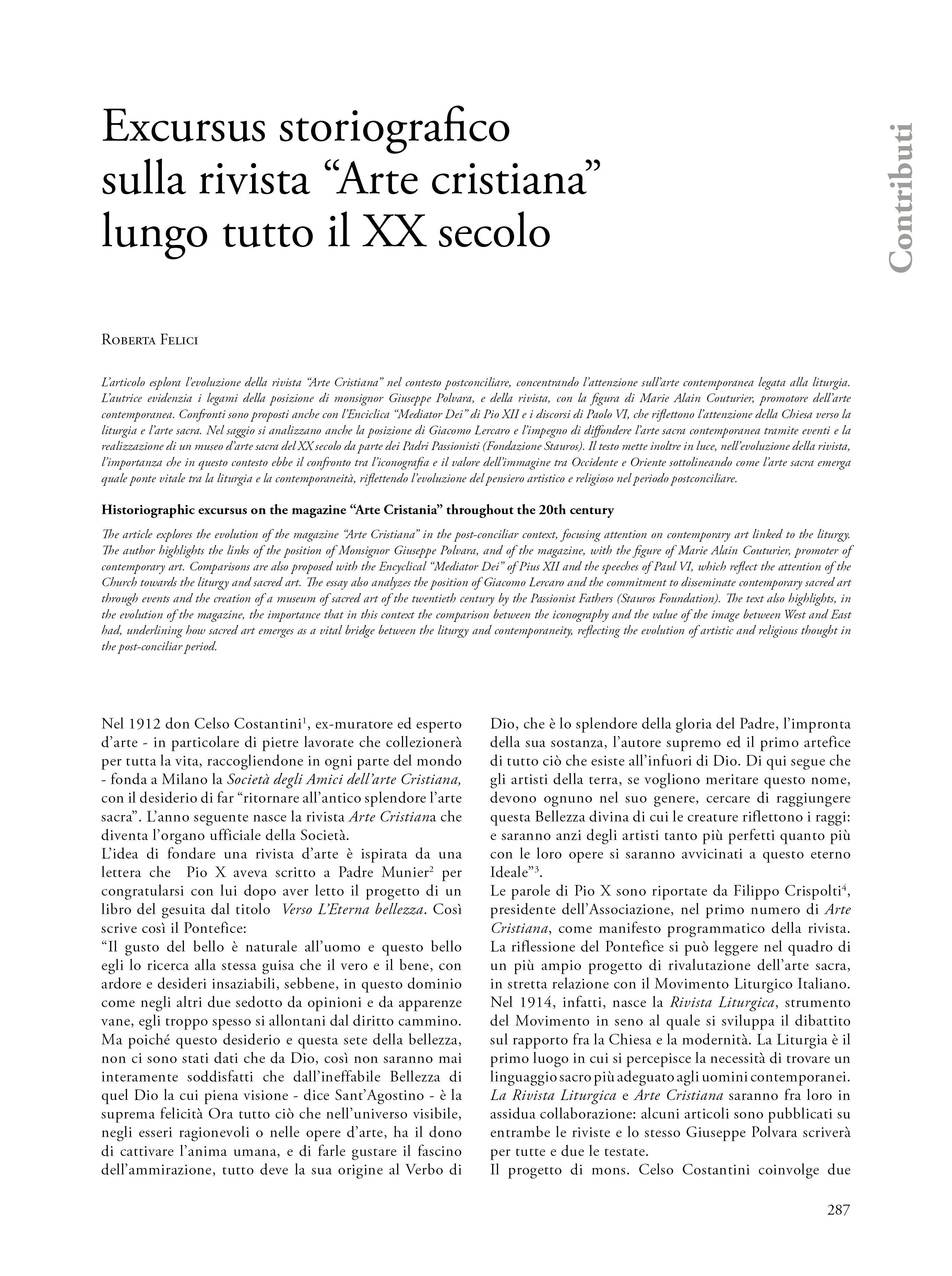 L’articolo esplora l’evoluzione della rivista “Arte Cristiana” nel contesto postconciliare, concentrando l’attenzione sull’arte contemporanea legata alla liturgia. L’autrice evidenzia i legami della posizione di monsignor Giuseppe Polvara, e della rivista, con la figura di Marie Alain Couturier, promotore dell’arte contemporanea. Confronti sono proposti anche con l’Enciclica “Mediator Dei” di Pio XII e i discorsi di Paolo VI, che riflettono l’attenzione della Chiesa verso la liturgia e l’arte sacra. Nel saggio si analizzano anche la posizione di Giacomo Lercaro e l’impegno di diffondere l’arte sacra contemporanea tramite eventi e la realizzazione di un museo d’arte sacra del XX secolo da parte dei Padri Passionisti (Fondazione Stauros). Il testo mette inoltre in luce, nell’evoluzione della rivista, l’importanza che in questo contesto ebbe il confronto tra l’iconografia e il valore dell’immagine tra Occidente e Oriente sottolineando come l’arte sacra emerga quale ponte vitale tra la liturgia e la contemporaneità, riflettendo l’evoluzione del pensiero artistico e religioso nel periodo postconciliare.