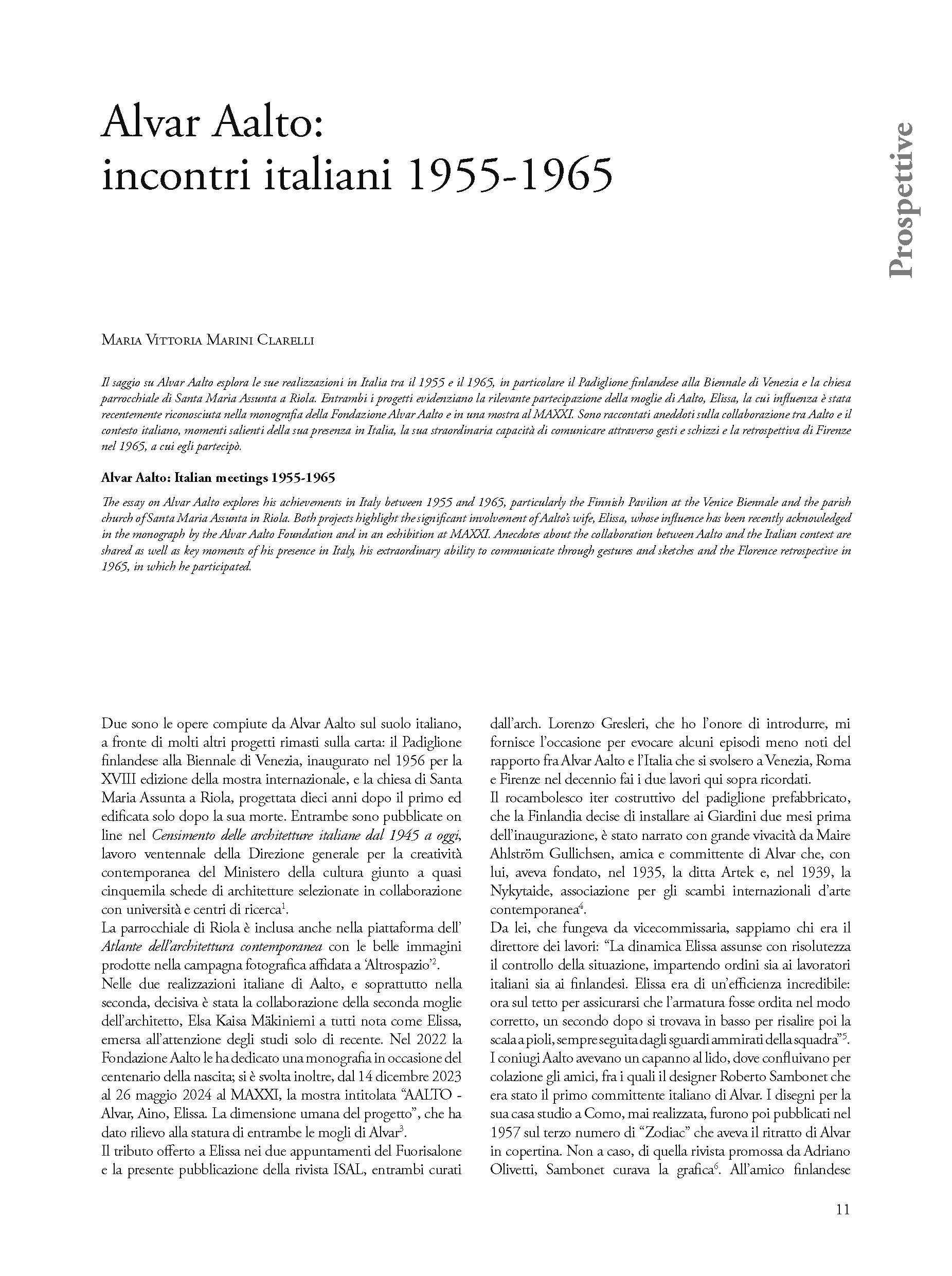 Il saggio su Alvar Aalto esplora le sue realizzazioni in Italia tra il 1955 e il 1965, in particolare il Padiglione finlandese alla Biennale di Venezia e la chiesa parrocchiale di Santa Maria Assunta a Riola. Entrambi i progetti evidenziano la rilevante partecipazione della moglie di Aalto, Elissa, la cui influenza è stata recentemente riconosciuta nella monografia della Fondazione Alvar Aalto e in una mostra al MAXXI. Sono raccontati aneddoti sulla collaborazione tra Aalto e il contesto italiano, momenti salienti della sua presenza in Italia, la sua straordinaria capacità di comunicare attraverso gesti e schizzi e la retrospettiva di Firenze nel 1965, a cui egli partecipò.