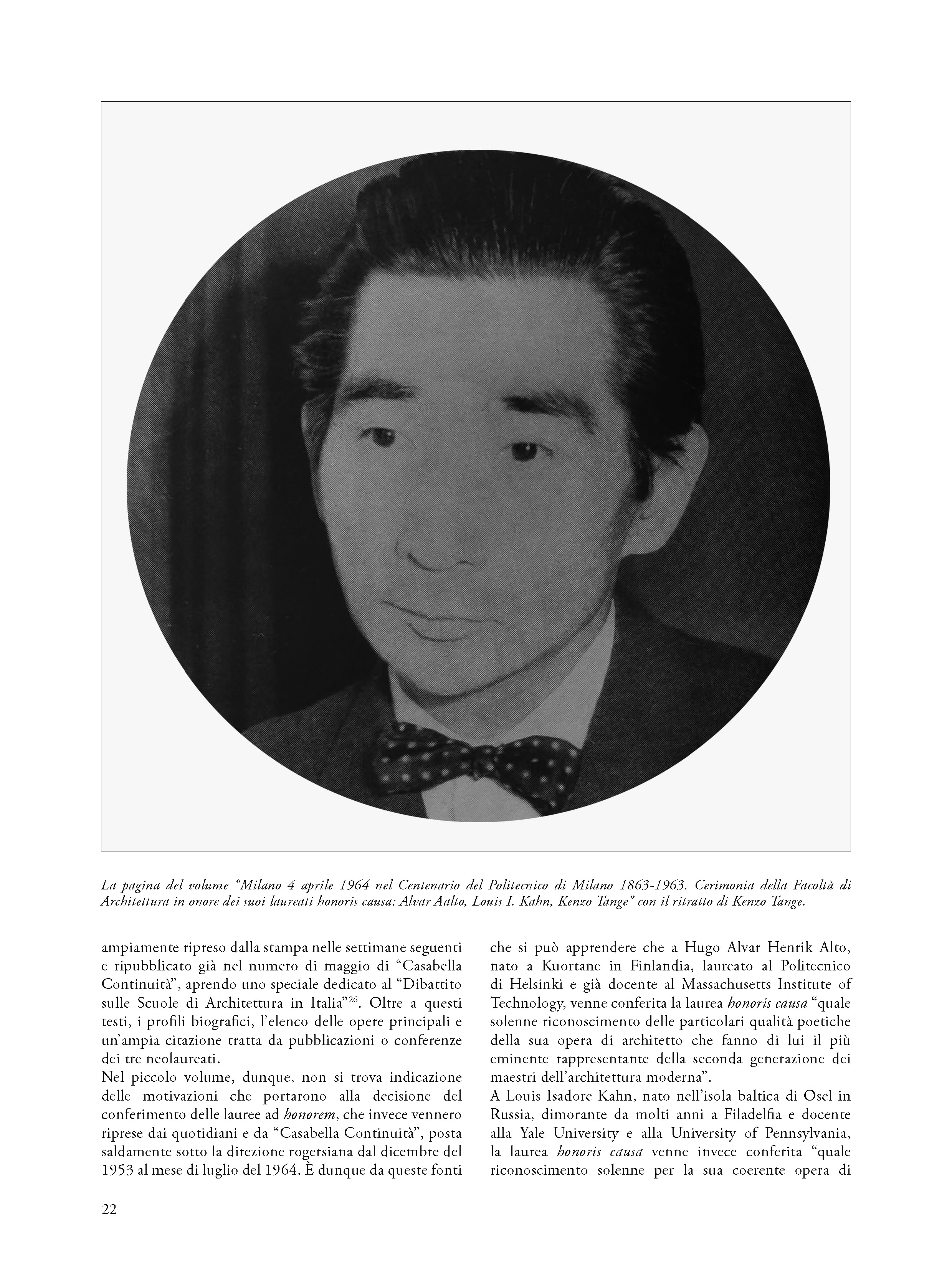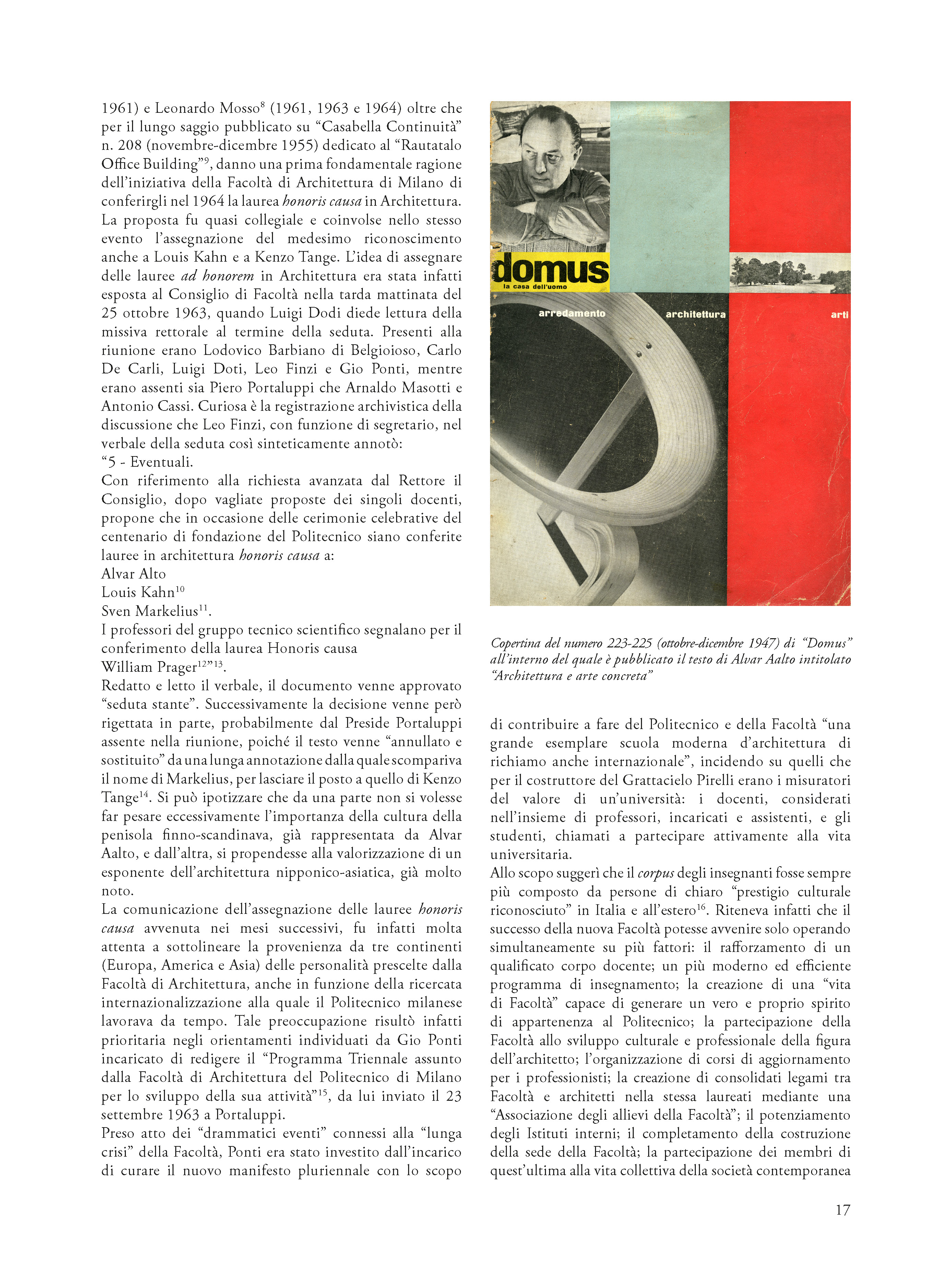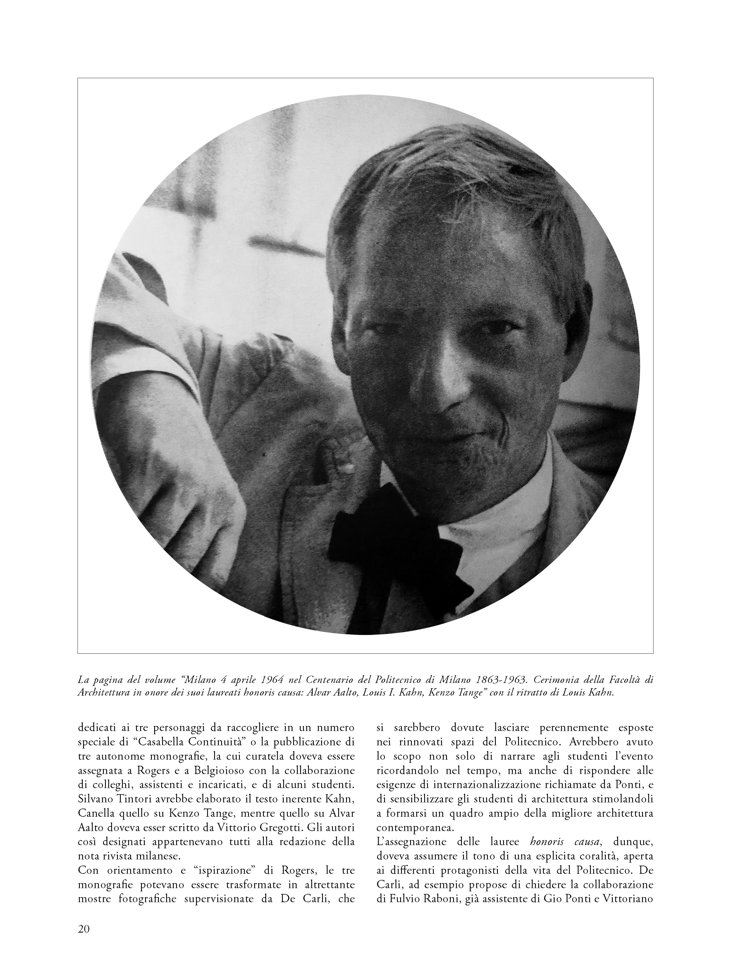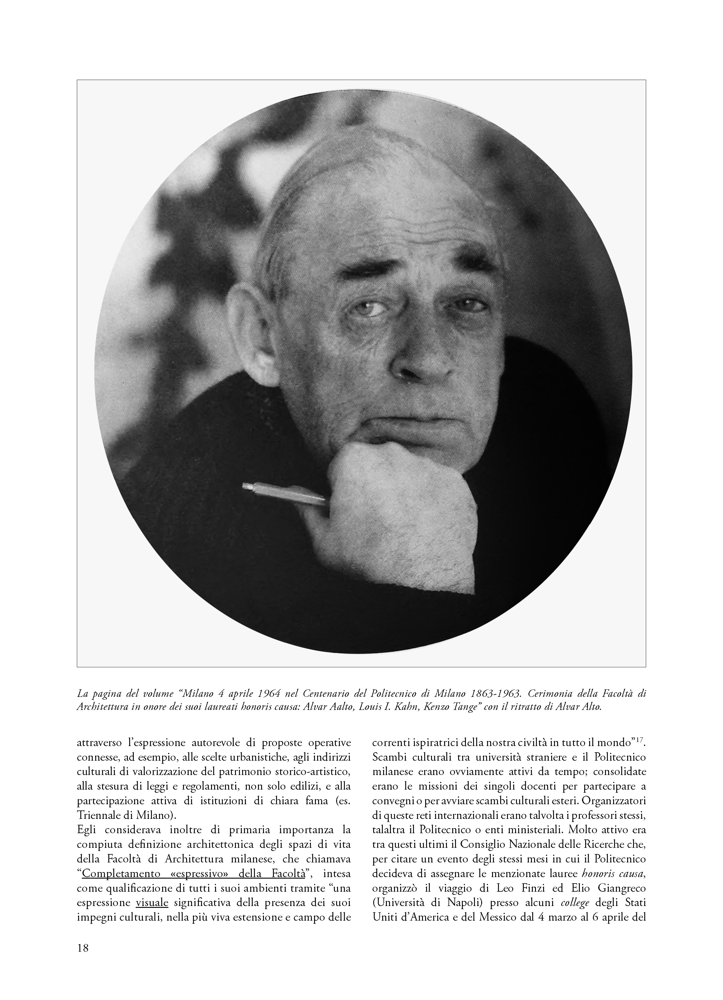 Il saggio costituisce un’analisi critica dell’assegnazione ad Alvar Aalto, Louis Kahn e Kenzo Tange di lauree honoris causa avvenuta da parte del Politecnico di Milano nel 1964. Lungi dal voler rappresentare uno sterile momento accademico riservato al solo corpo docente, questo dimenticato e quasi sconosciuto evento, assunse il valore di un’esplicita coralità, aperta ai protagonisti della vita sociale italiana. L’episodio, infatti, costituì un tassello di un ben più articolato progetto celebrativo e culturale del centenario della fondazione dell’ateneo milanese, legato anche alla definizione del significato di “Architettura” e di “Ingegneria”, oltre che all’affermazione del valore dell’Università nell’ambito del cambiamento della società nazionale. Attraverso la proposizione di documenti archivistici inediti, il testo analizza il riconoscimento ‘riservato’ ad Alvar Aalto quale testimonianza del valore transnazionale degli insegnamenti politecnici e la valorizzazione di un professionista capace di esprimere “particolari qualità poetiche della sua opera di architetto”, divenendo “il più eminente rappresentante della seconda generazione dei maestri dell’architettura moderna”.