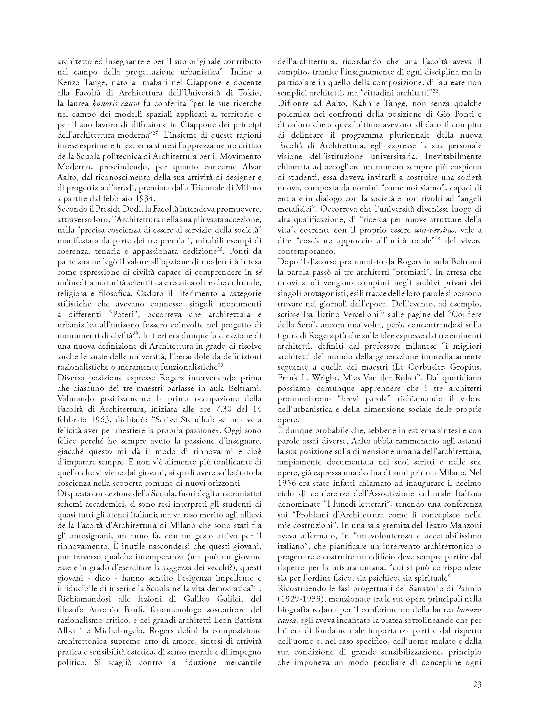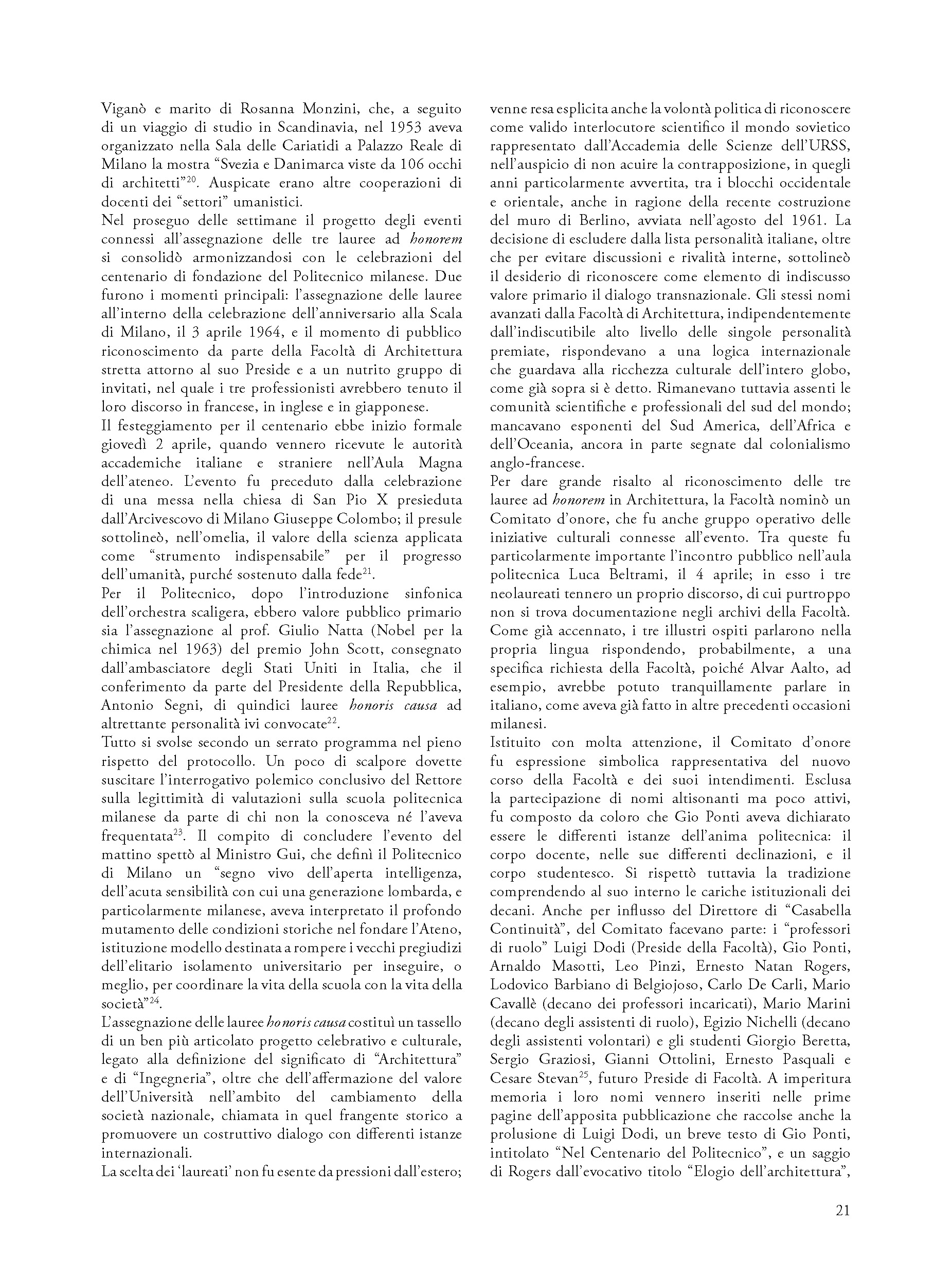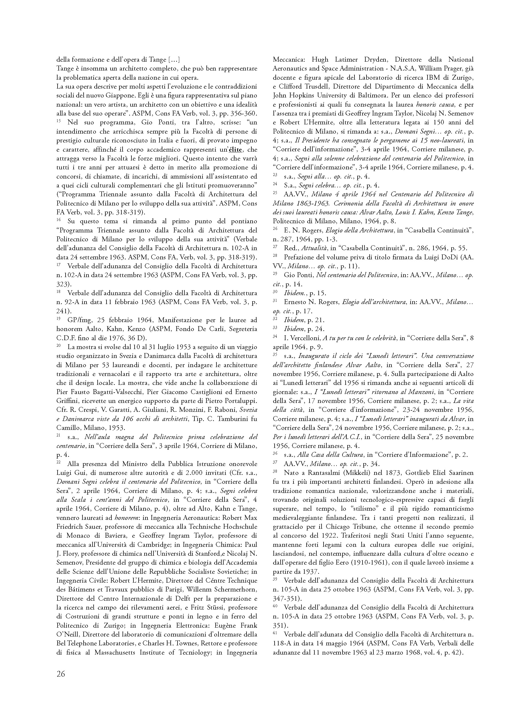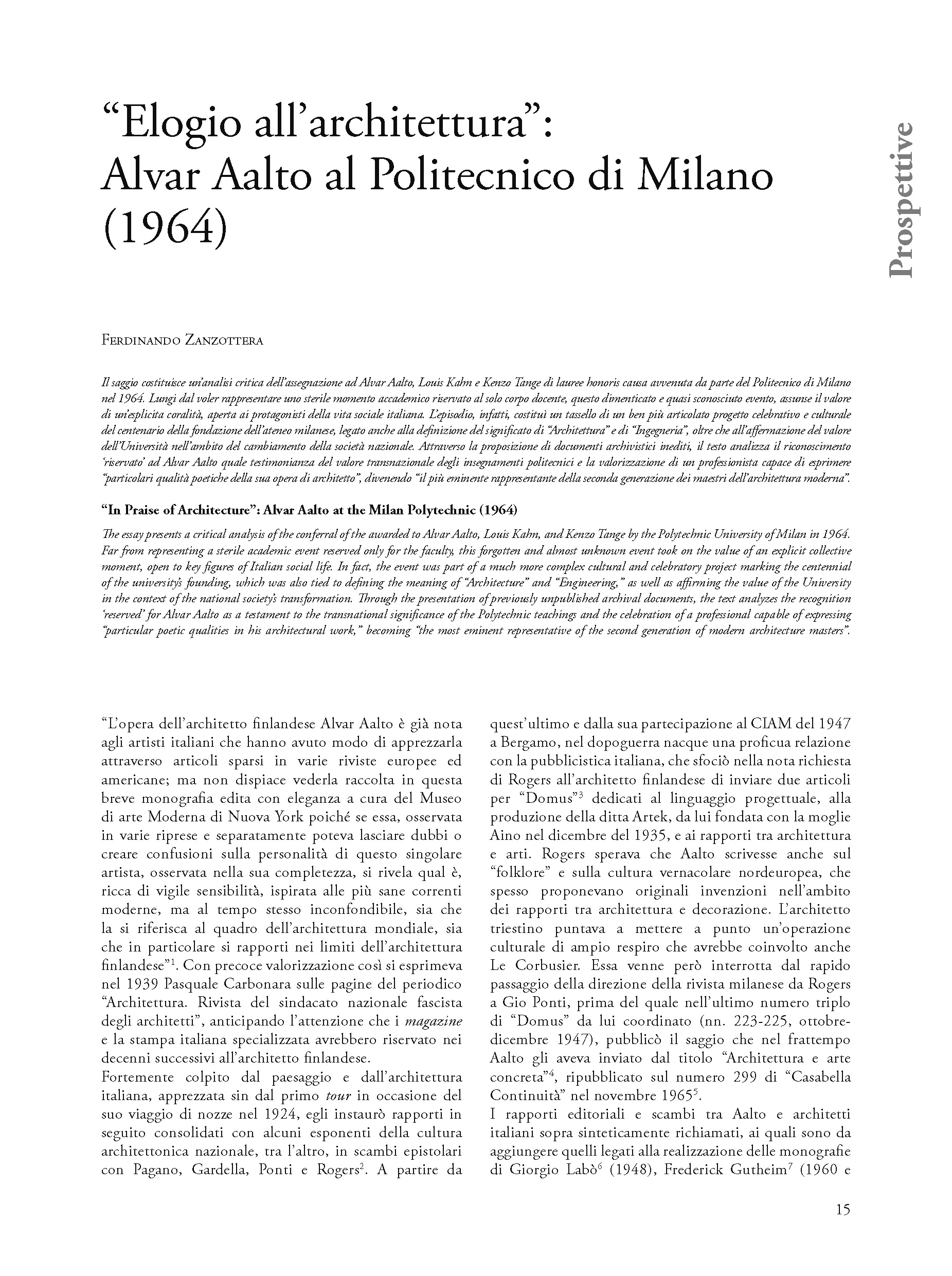 Il saggio costituisce un’analisi critica dell’assegnazione ad Alvar Aalto, Louis Kahn e Kenzo Tange di lauree honoris causa avvenuta da parte del Politecnico di Milano nel 1964. Lungi dal voler rappresentare uno sterile momento accademico riservato al solo corpo docente, questo dimenticato e quasi sconosciuto evento, assunse il valore di un’esplicita coralità, aperta ai protagonisti della vita sociale italiana. L’episodio, infatti, costituì un tassello di un ben più articolato progetto celebrativo e culturale del centenario della fondazione dell’ateneo milanese, legato anche alla definizione del significato di “Architettura” e di “Ingegneria”, oltre che all’affermazione del valore dell’Università nell’ambito del cambiamento della società nazionale. Attraverso la proposizione di documenti archivistici inediti, il testo analizza il riconoscimento ‘riservato’ ad Alvar Aalto quale testimonianza del valore transnazionale degli insegnamenti politecnici e la valorizzazione di un professionista capace di esprimere “particolari qualità poetiche della sua opera di architetto”, divenendo “il più eminente rappresentante della seconda generazione dei maestri dell’architettura moderna”.
