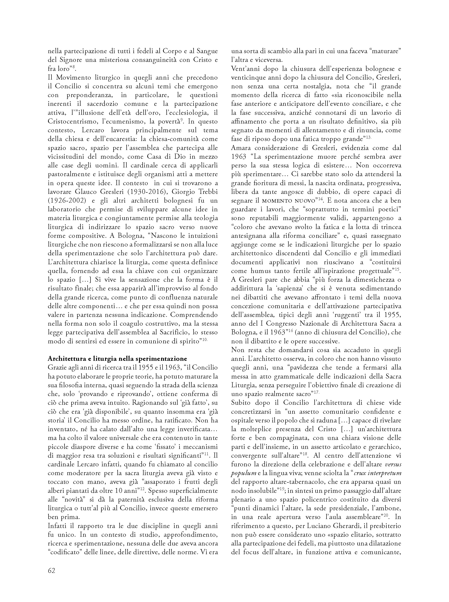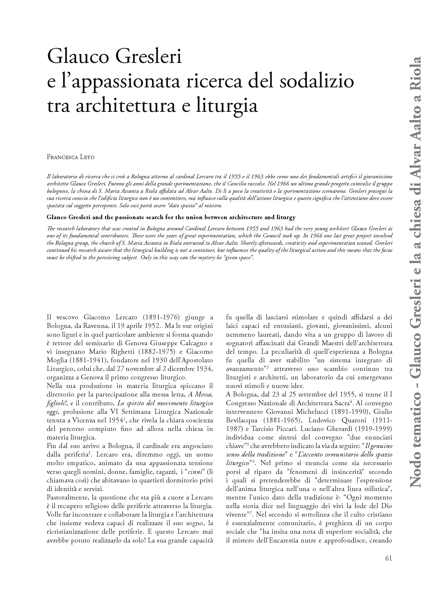 Il laboratorio di ricerca che si creò a Bologna attorno al cardinal Lercaro tra il 1955 e il 1963 ebbe come uno dei fondamentali artefici il giovanissimo architetto Glauco Gresleri. Furono gli anni della grande sperimentazione, che il Concilio raccolse. Nel 1966 un ultimo grande progetto coinvolse il gruppo bolognese, la chiesa di S. Maria Assunta a Riola affidata ad Alvar Aalto. Di lì a poco la creatività e la sperimentazione scemarono. Gresleri proseguì la sua ricerca conscio che l’edificio liturgico non è un contenitore, ma influisce sulla qualità dell’azione liturgica e questo significa che l’attenzione deve essere spostata sul soggetto percepente. Solo così potrà essere “dato spazio” al mistero.