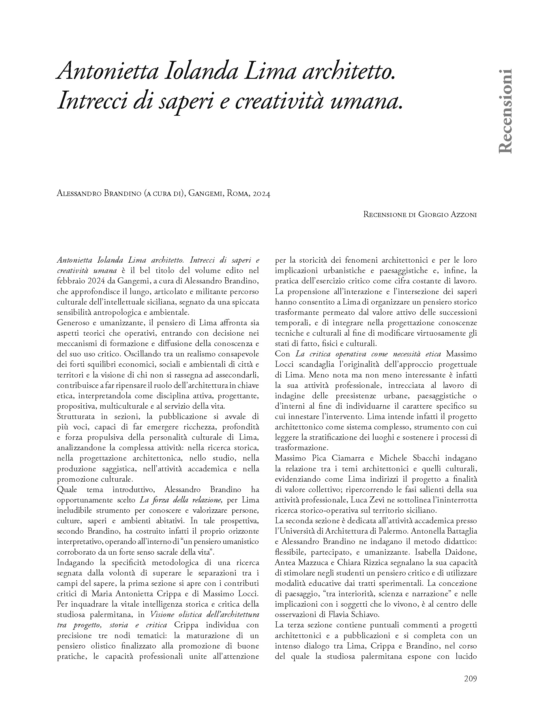 Antonietta Iolanda Lima architetto. Intrecci di saperi e creatività umana.