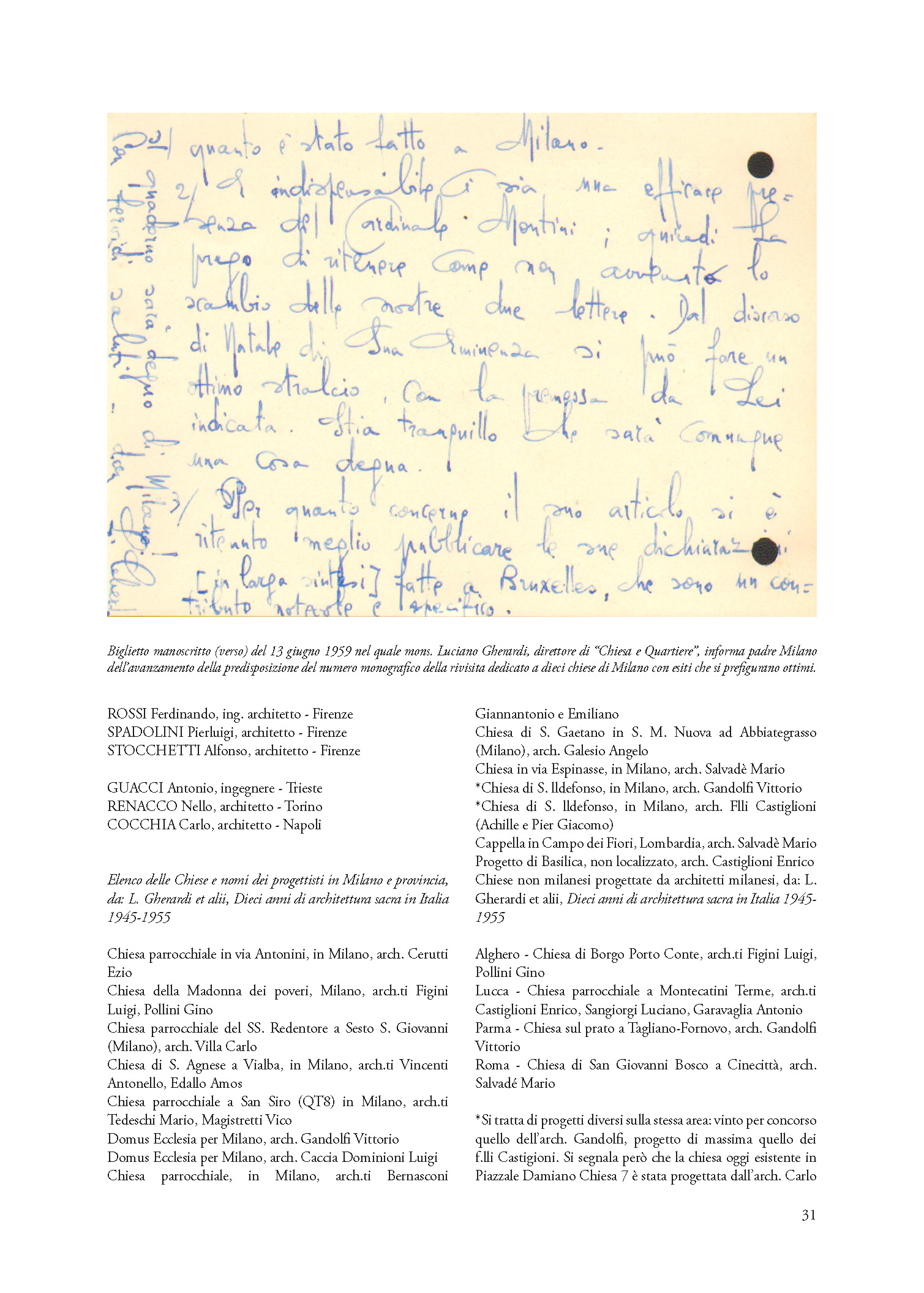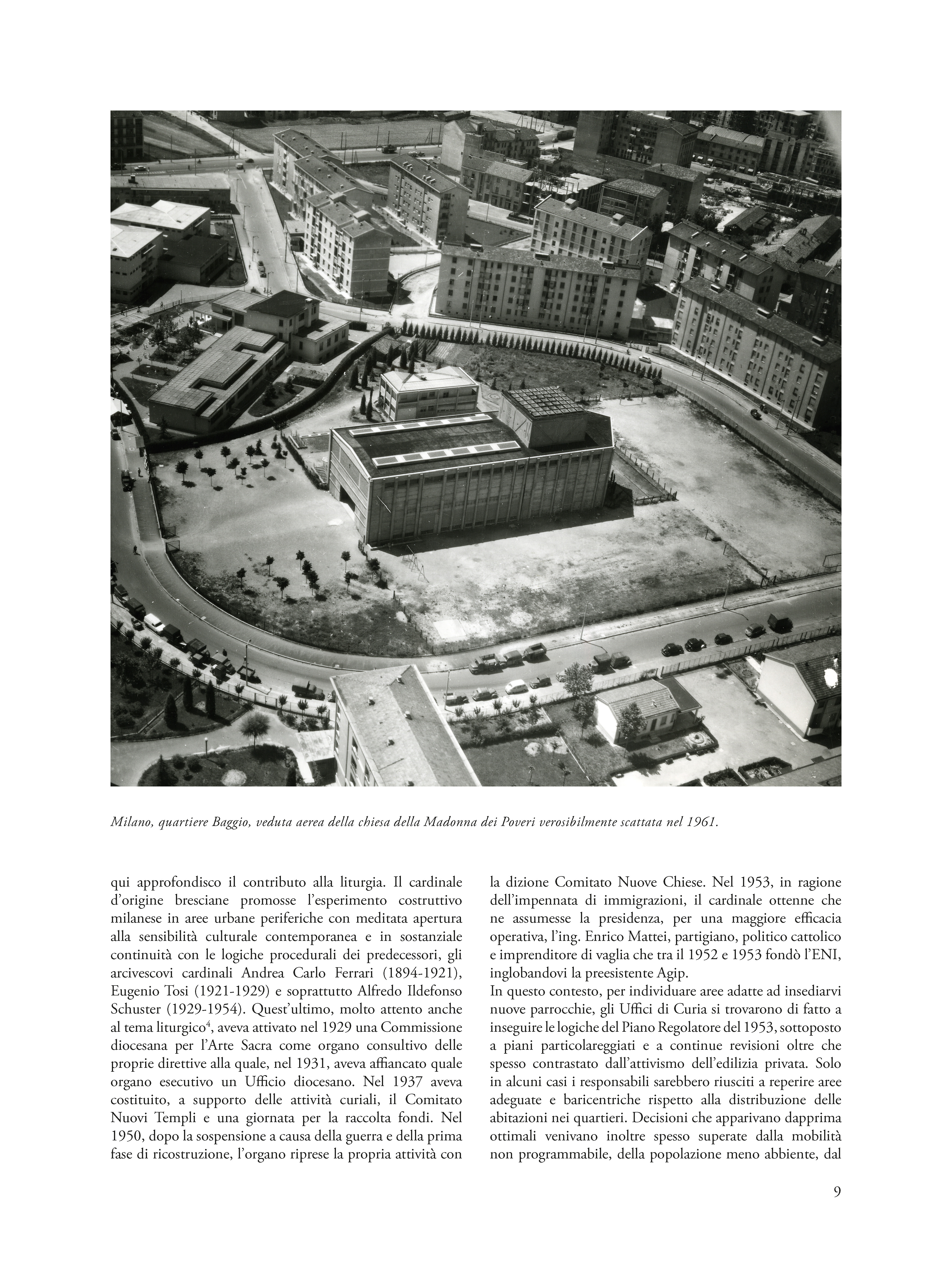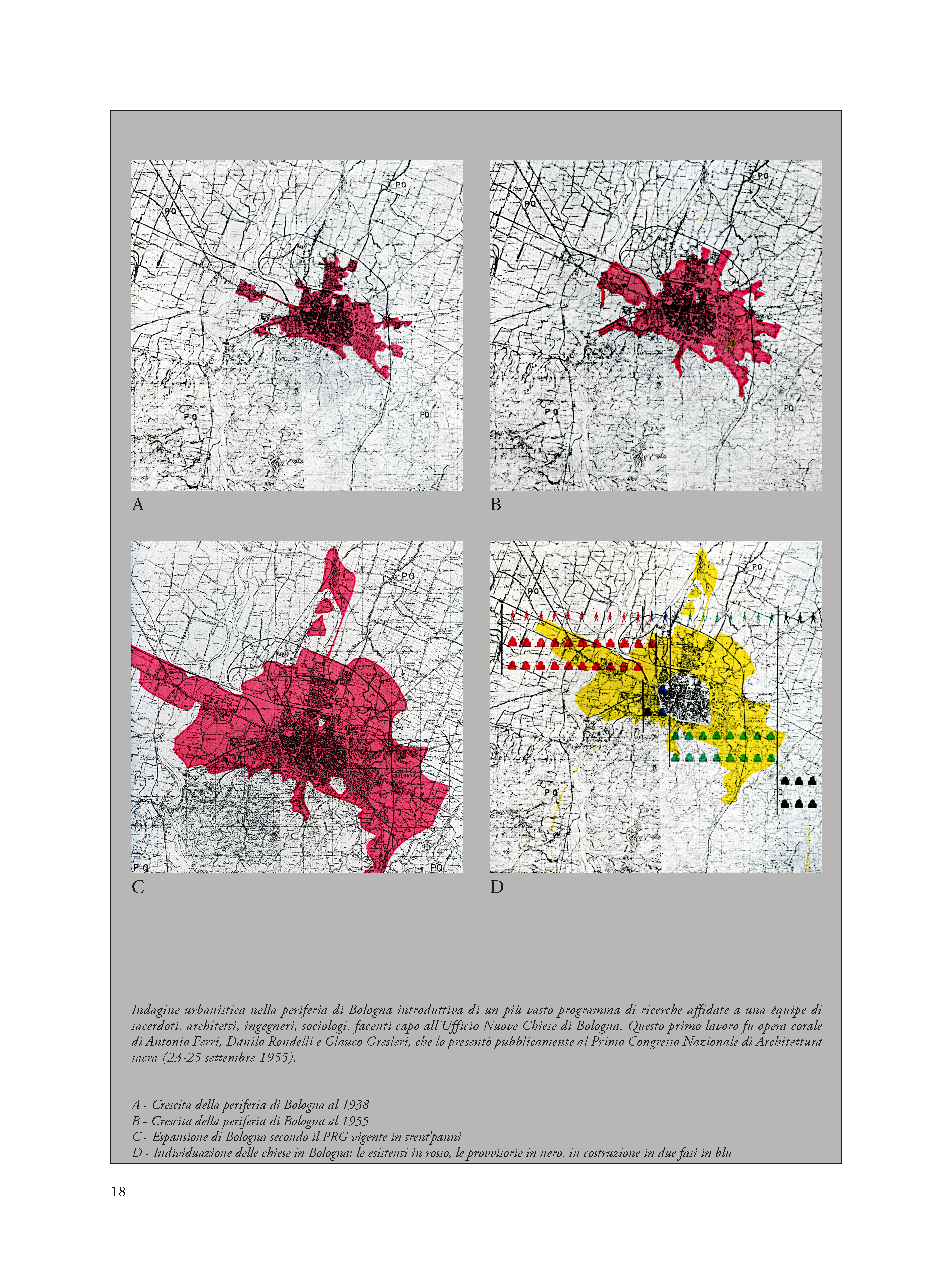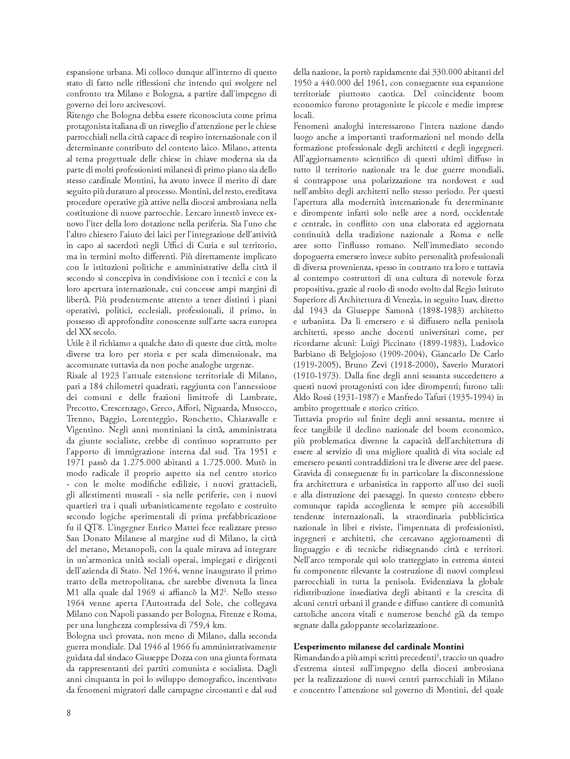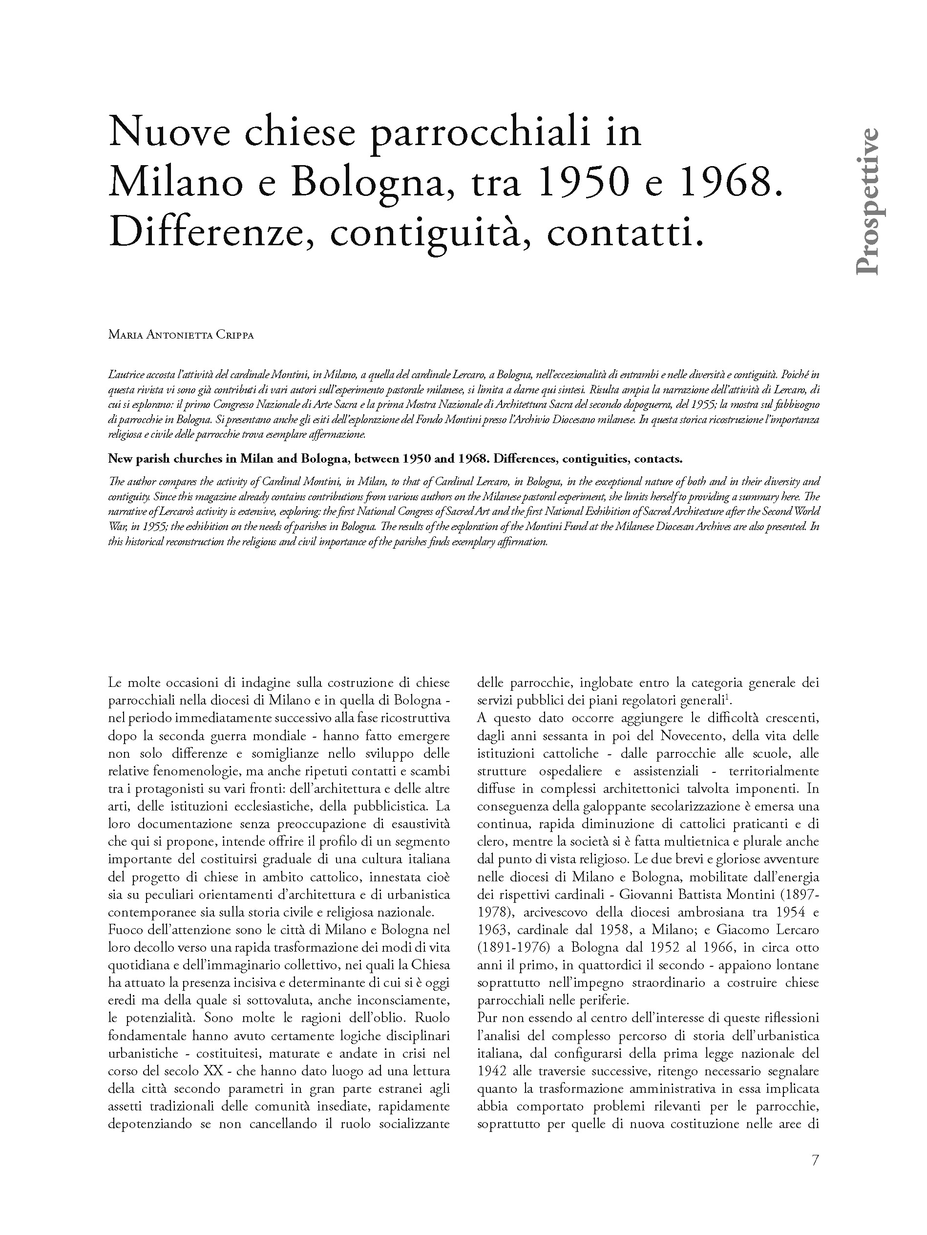 L’autrice accosta l’attività del cardinale Montini, in Milano, a quella del cardinale Lercaro, a Bologna, nell’eccezionalità di entrambi e nelle diversità e contiguità. Poiché in questa rivista vi sono già contributi di vari autori sull’esperimento pastorale milanese, si limita a darne qui sintesi. Risulta ampia la narrazione dell’attività di Lercaro, di cui si esplorano: il primo Congresso Nazionale di Arte Sacra e la prima Mostra Nazionale di Architettura Sacra del secondo dopoguerra, del 1955; la mostra sul fabbisogno di parrocchie in Bologna. Si presentano anche gli esiti dell’esplorazione del Fondo Montini presso l’Archivio Diocesano milanese. In questa storica ricostruzione l’importanza religiosa e civile delle parrocchie trova esemplare affermazione.