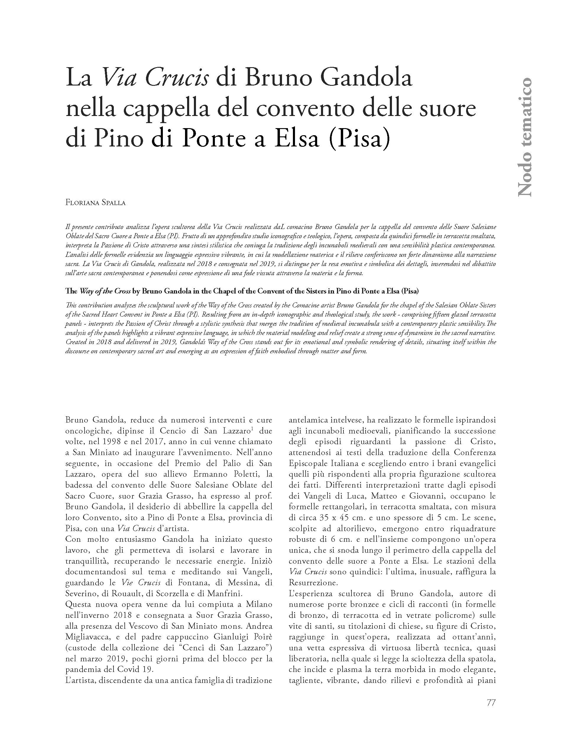 Il presente contributo analizza l’opera scultorea della Via Crucis realizzata daL comacino Bruno Gandola per la cappella del convento delle Suore Salesiane Oblate del Sacro Cuore a Ponte a Elsa (PI). Frutto di un approfondito studio iconografico e teologico, l’opera, composta da quindici formelle in terracotta smaltata, interpreta la Passione di Cristo attraverso una sintesi stilistica che coniuga la tradizione degli incunaboli medievali con una sensibilità plastica contemporanea. L’analisi delle formelle evidenzia un linguaggio espressivo vibrante, in cui la modellazione materica e il rilievo conferiscono un forte dinamismo alla narrazione sacra. La Via Crucis di Gandola, realizzata nel 2018 e consegnata nel 2019, si distingue per la resa emotiva e simbolica dei dettagli, inserendosi nel dibattito sull’arte sacra contemporanea e ponendosi come espressione di una fede vissuta attraverso la materia e la forma.