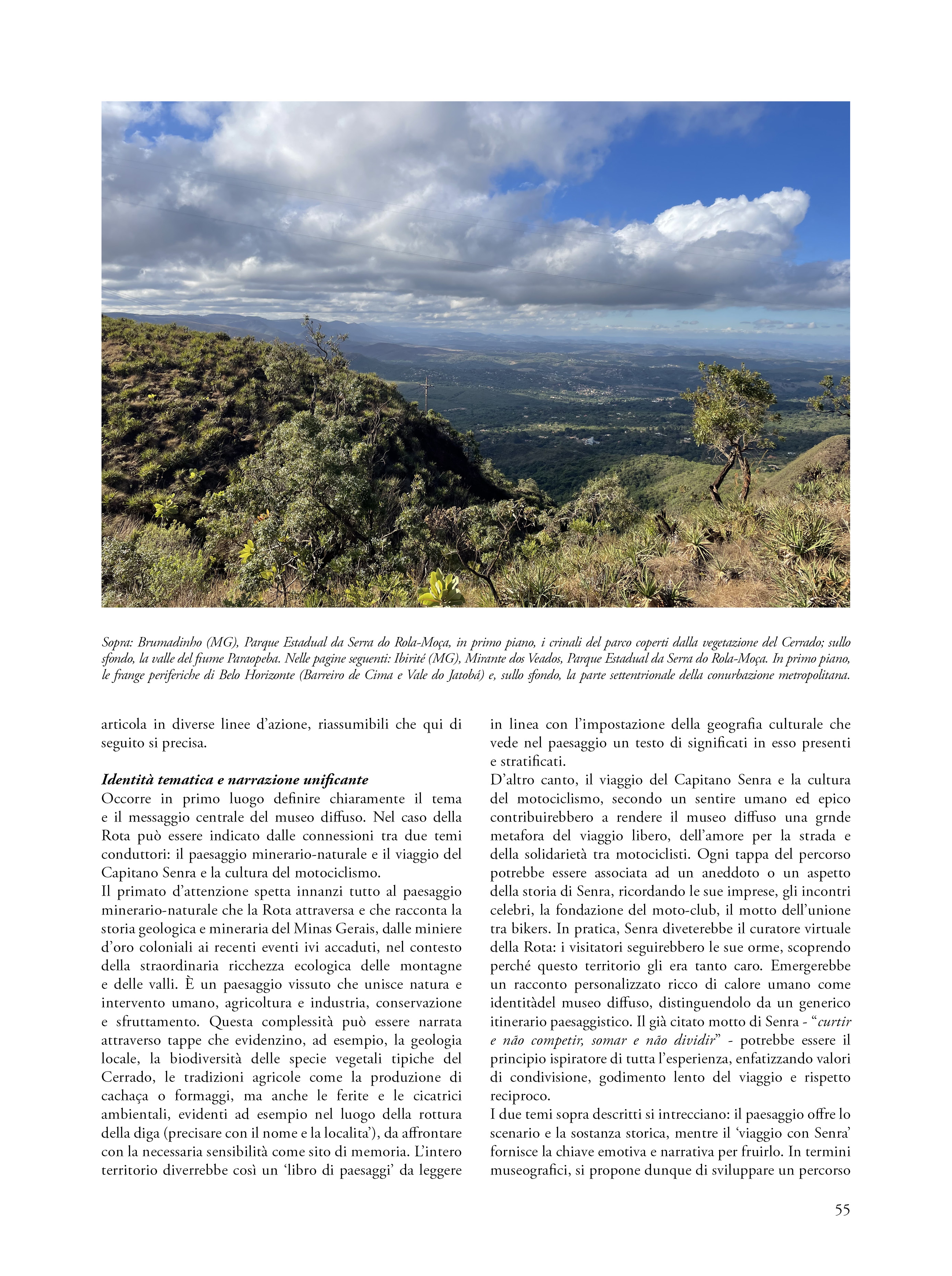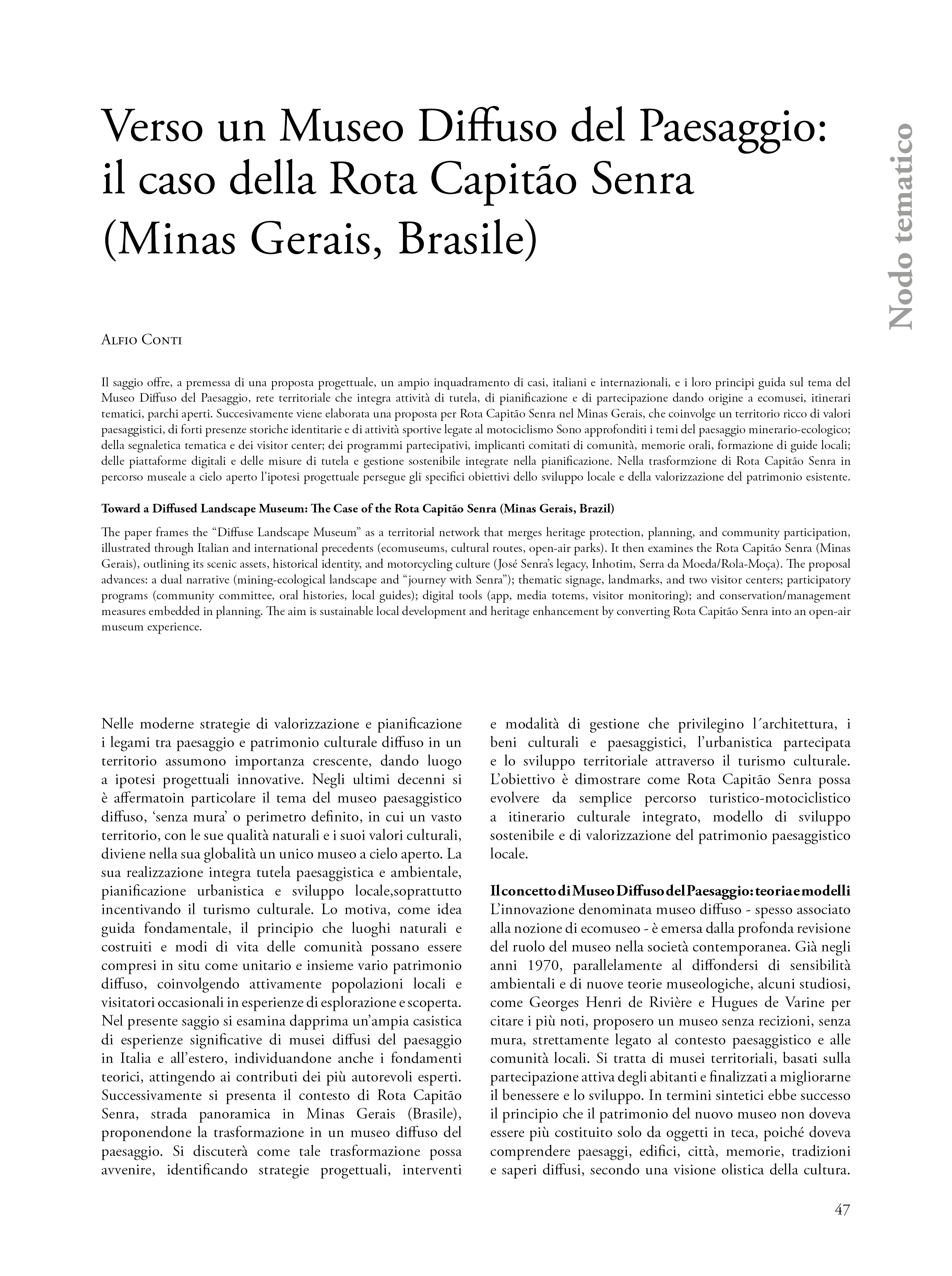 Il saggio offre, a premessa di una proposta progettuale, un ampio inquadramento di casi, italiani e internazionali, e i loro principi guida sul tema del Museo Diffuso del Paesaggio, rete territoriale che integra attività di tutela, di pianificazione e di partecipazione dando origine a ecomusei, itinerari tematici, parchi aperti. Succesivamente viene elaborata una proposta per Rota Capitão Senra nel Minas Gerais, che coinvolge un territorio ricco di valori paesaggistici, di forti presenze storiche identitarie e di attività sportive legate al motociclismo Sono approfonditi i temi del paesaggio minerario-ecologico; della segnaletica tematica e dei visitor center; dei programmi partecipativi, implicanti comitati di comunità, memorie orali, formazione di guide locali; delle piattaforme digitali e delle misure di tutela e gestione sostenibile integrate nella pianificazione. Nella trasformzione di Rota Capitão Senra in percorso museale a cielo aperto l’ipotesi progettuale persegue gli specifici obiettivi dello sviluppo locale e della valorizzazione del patrimonio esistente.