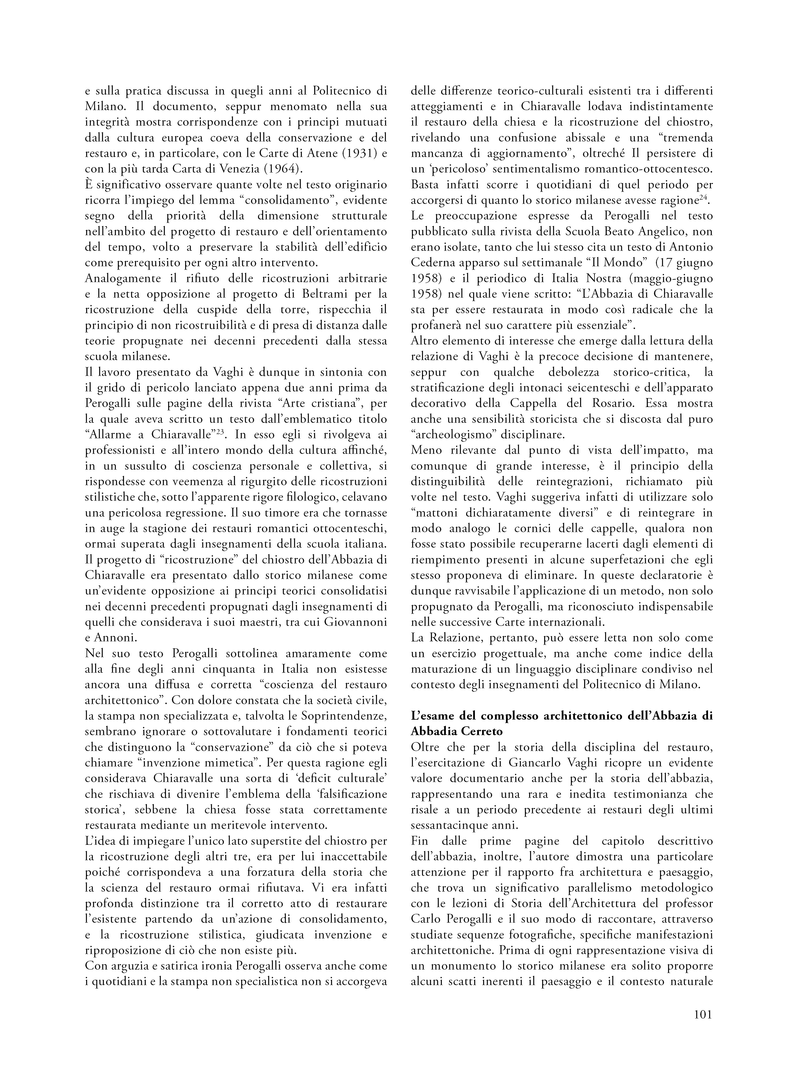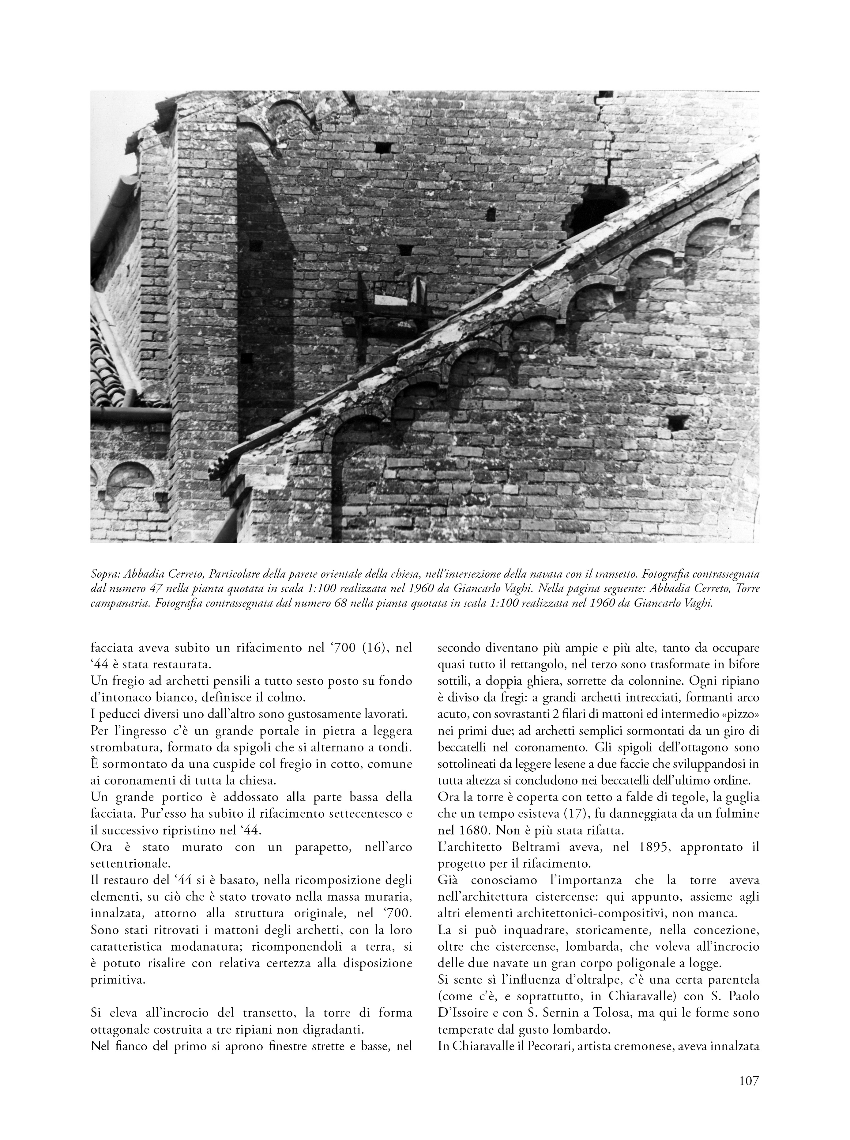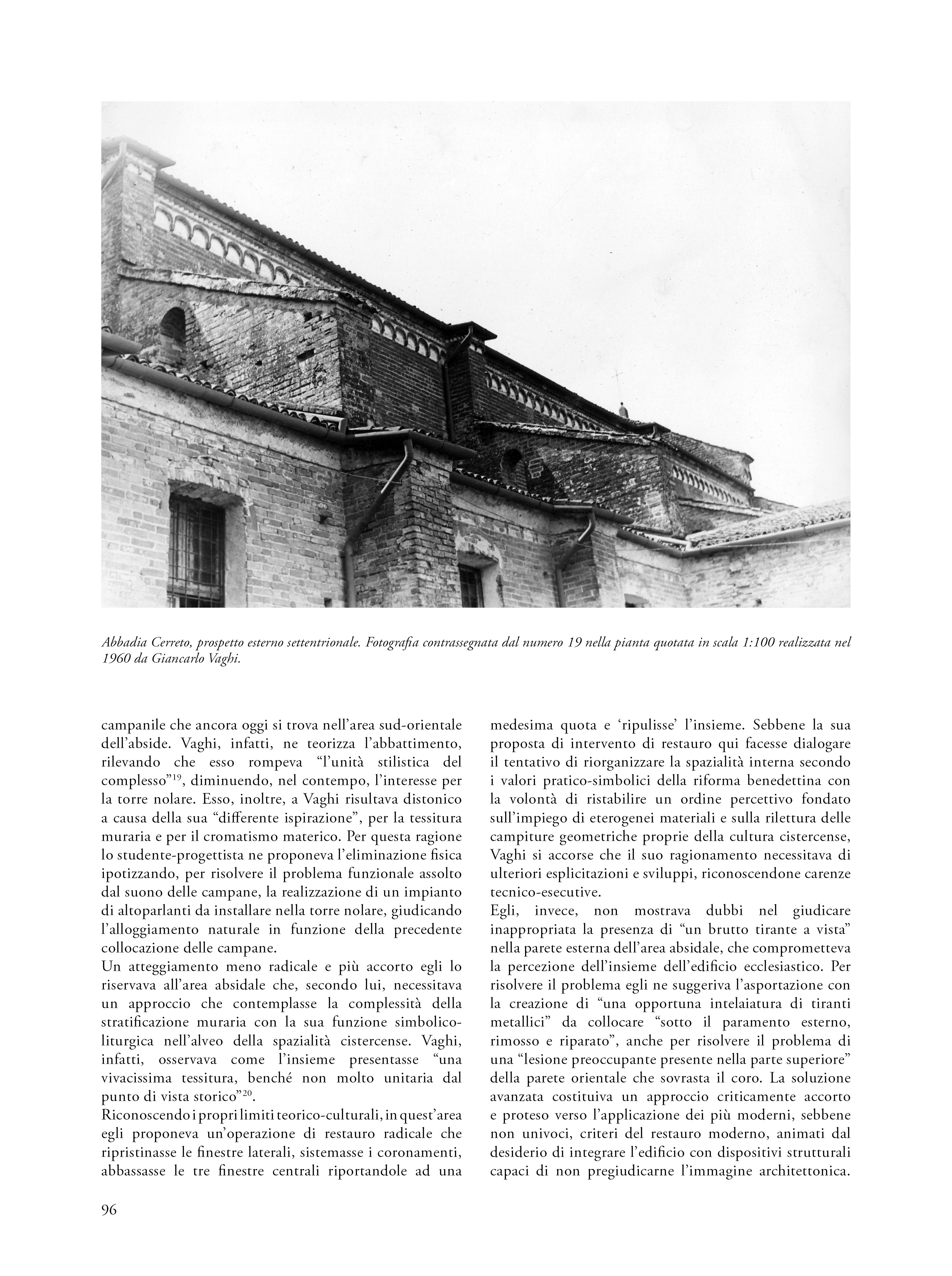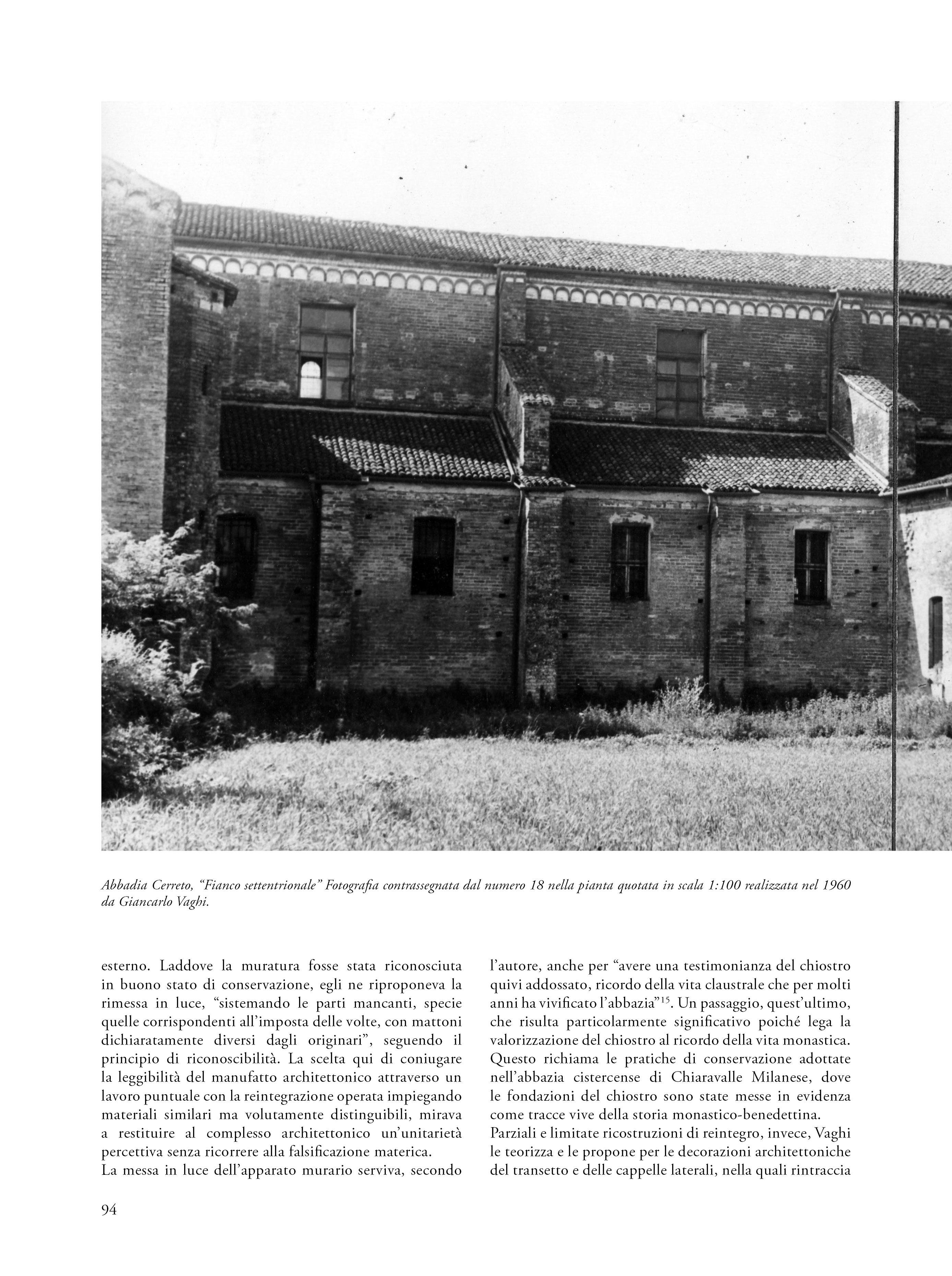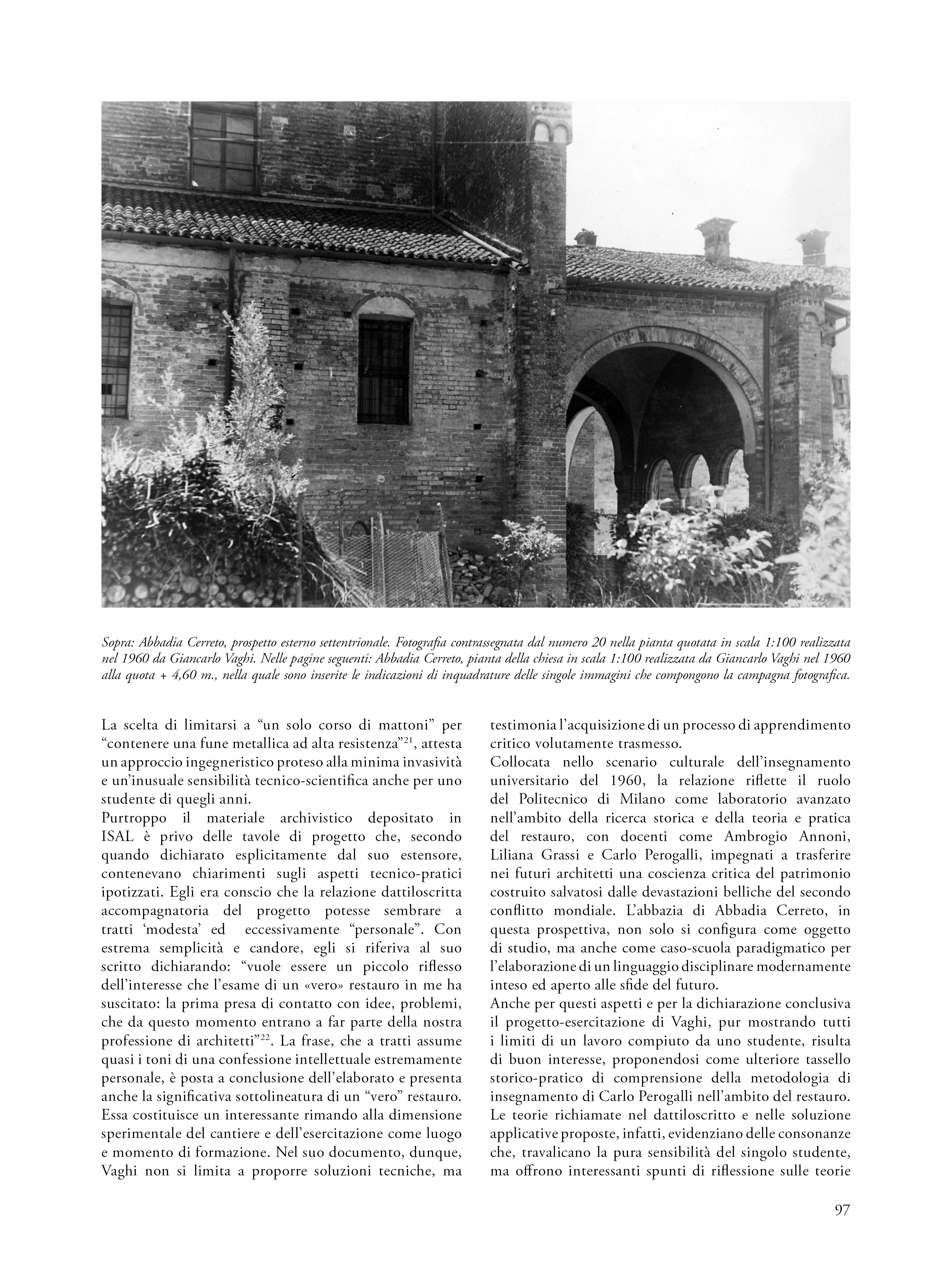 Il saggio propone una riflessione su un’esercitazione svoltasi nel 1960 nell’ambito del corso di Restauro tenuto al Politecnico di Milano dal prof. Carlo Perogalli. Il testo analizza l’elaborato che propone un intervento di restauro critico e conservativo sull’abbazia cistercense di Abbadia Cerreto (Lodi), fondato sulla conoscenza storica e sulla lettura architettonica del complesso come appariva sessantacinque anni fa. L’autore del progetto rifiuta le ricostruzioni arbitrarie e privilegia interventi reversibili e riconoscibili, in linea con il dibattito interno al polo universitario milanese e in adesione alla Carta di Atene (1933), anticipando parzialmente i contenuti della Carta di Venezia del 1964. L’abbazia è descritta come esempio significativo di architettura cistercense lombarda, con particolare attenzione alla verticalità, all’uso del mattone e alla torre nolare ottagonale, in parziale adesione al metodo narrativo proposta dal docente e storico milanese. Il progetto evidenzia una sensibilità storicista e una precoce coscienza critica del patrimonio, rendendo l’esercitazione non solo un’interessante testimonianza dello stato conservativo del complesso architettonico lodigiano, ma anche una testimonianza metodologica dell’insegnamento del restauro negli anni sessanta.