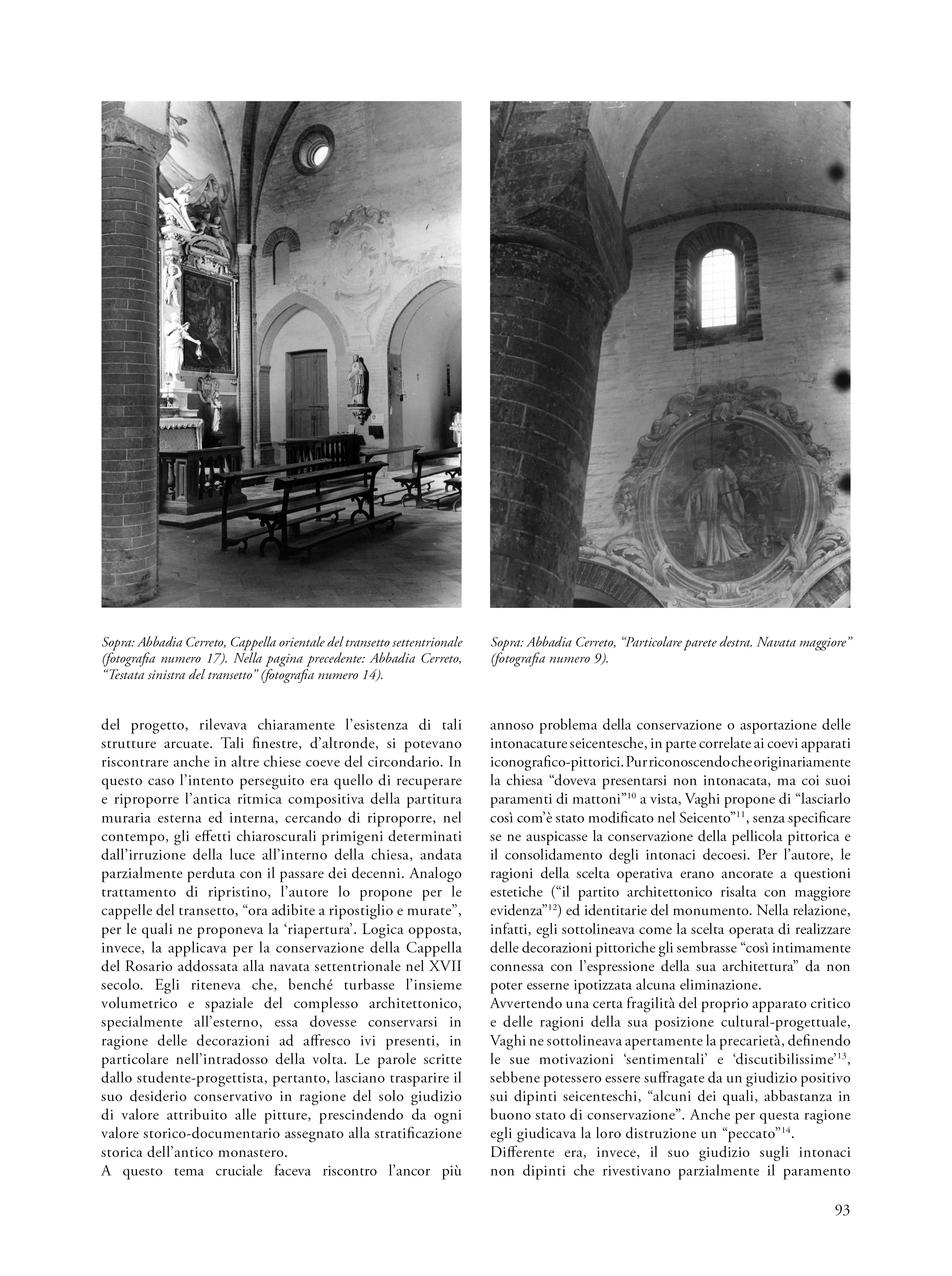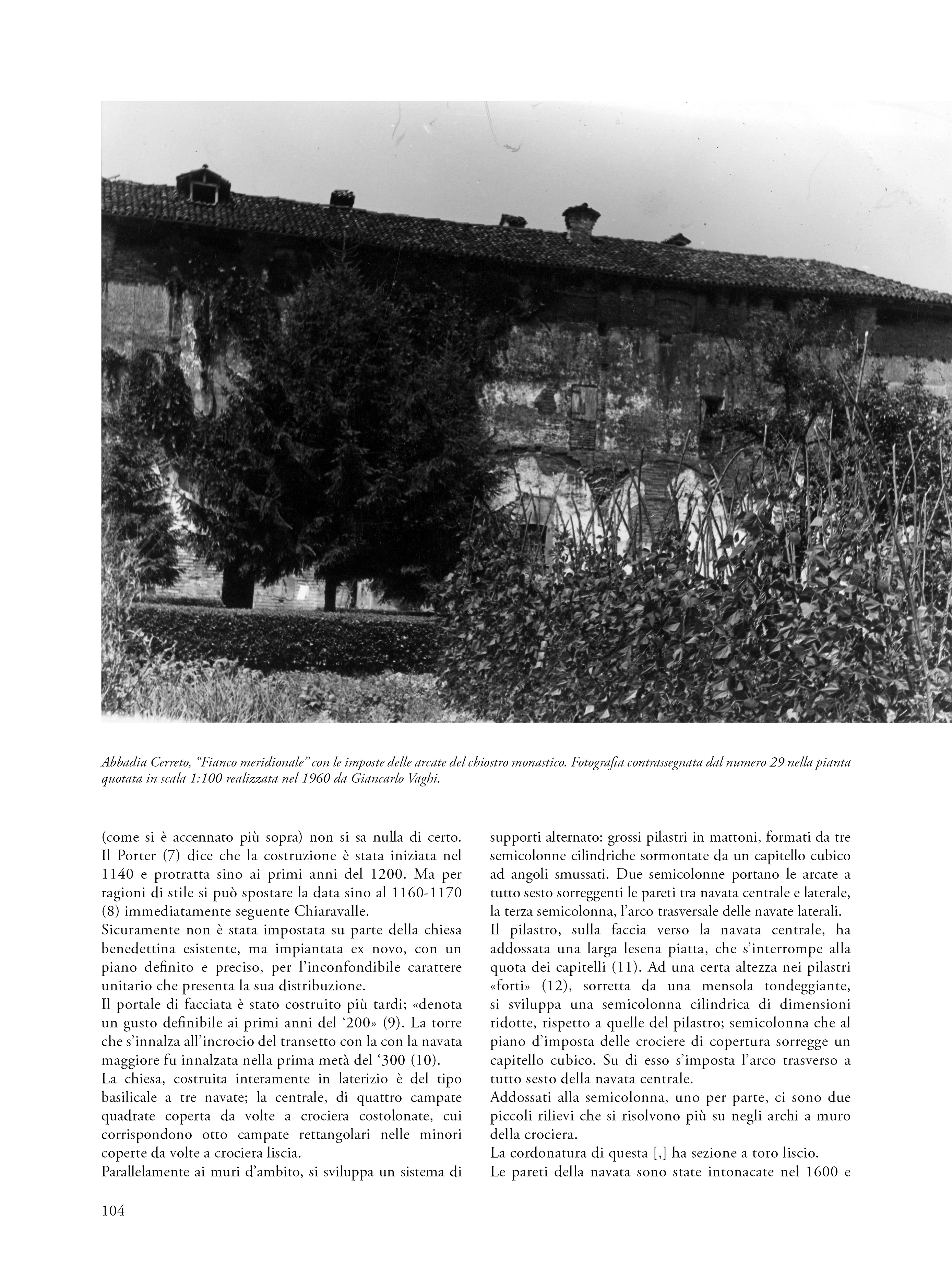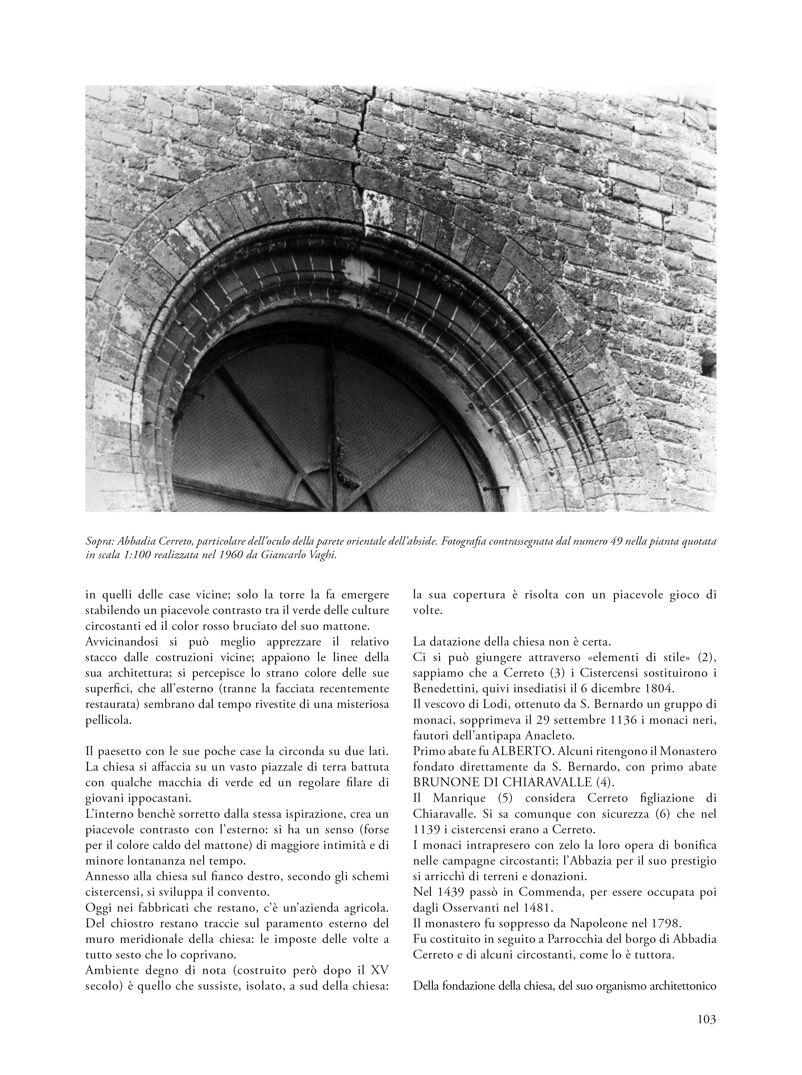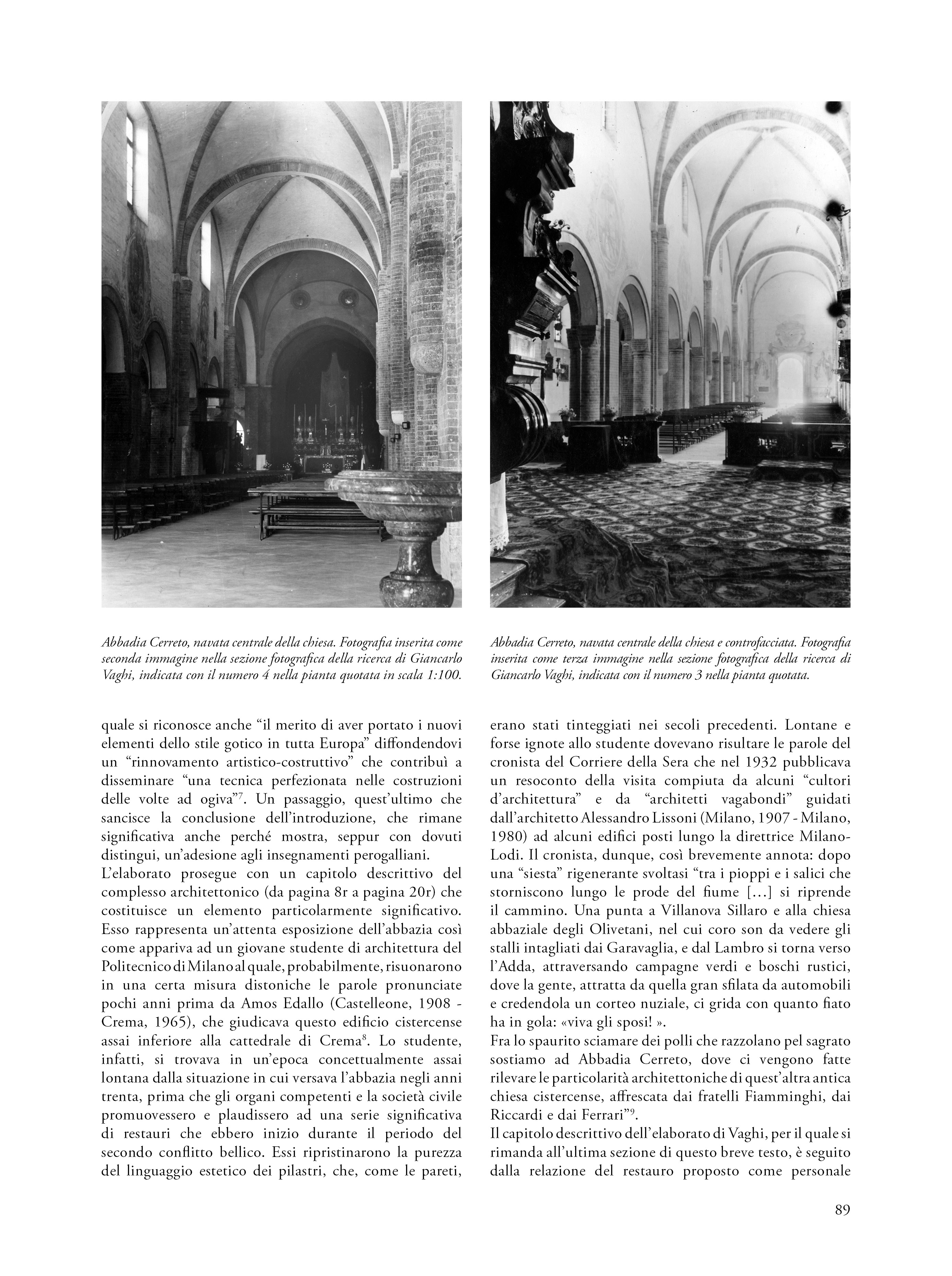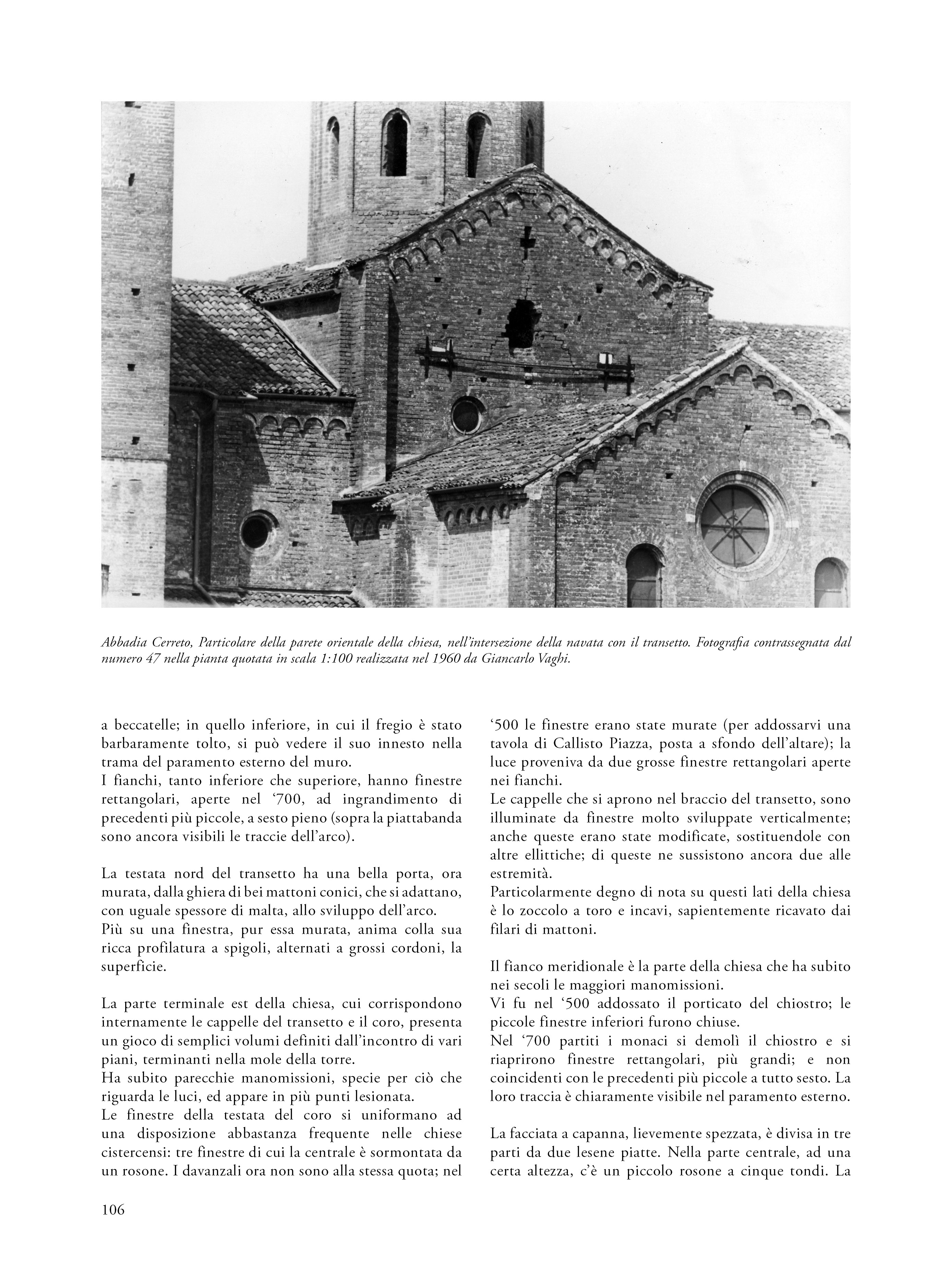 Il saggio propone una riflessione su un’esercitazione svoltasi nel 1960 nell’ambito del corso di Restauro tenuto al Politecnico di Milano dal prof. Carlo Perogalli. Il testo analizza l’elaborato che propone un intervento di restauro critico e conservativo sull’abbazia cistercense di Abbadia Cerreto (Lodi), fondato sulla conoscenza storica e sulla lettura architettonica del complesso come appariva sessantacinque anni fa. L’autore del progetto rifiuta le ricostruzioni arbitrarie e privilegia interventi reversibili e riconoscibili, in linea con il dibattito interno al polo universitario milanese e in adesione alla Carta di Atene (1933), anticipando parzialmente i contenuti della Carta di Venezia del 1964. L’abbazia è descritta come esempio significativo di architettura cistercense lombarda, con particolare attenzione alla verticalità, all’uso del mattone e alla torre nolare ottagonale, in parziale adesione al metodo narrativo proposta dal docente e storico milanese. Il progetto evidenzia una sensibilità storicista e una precoce coscienza critica del patrimonio, rendendo l’esercitazione non solo un’interessante testimonianza dello stato conservativo del complesso architettonico lodigiano, ma anche una testimonianza metodologica dell’insegnamento del restauro negli anni sessanta.
