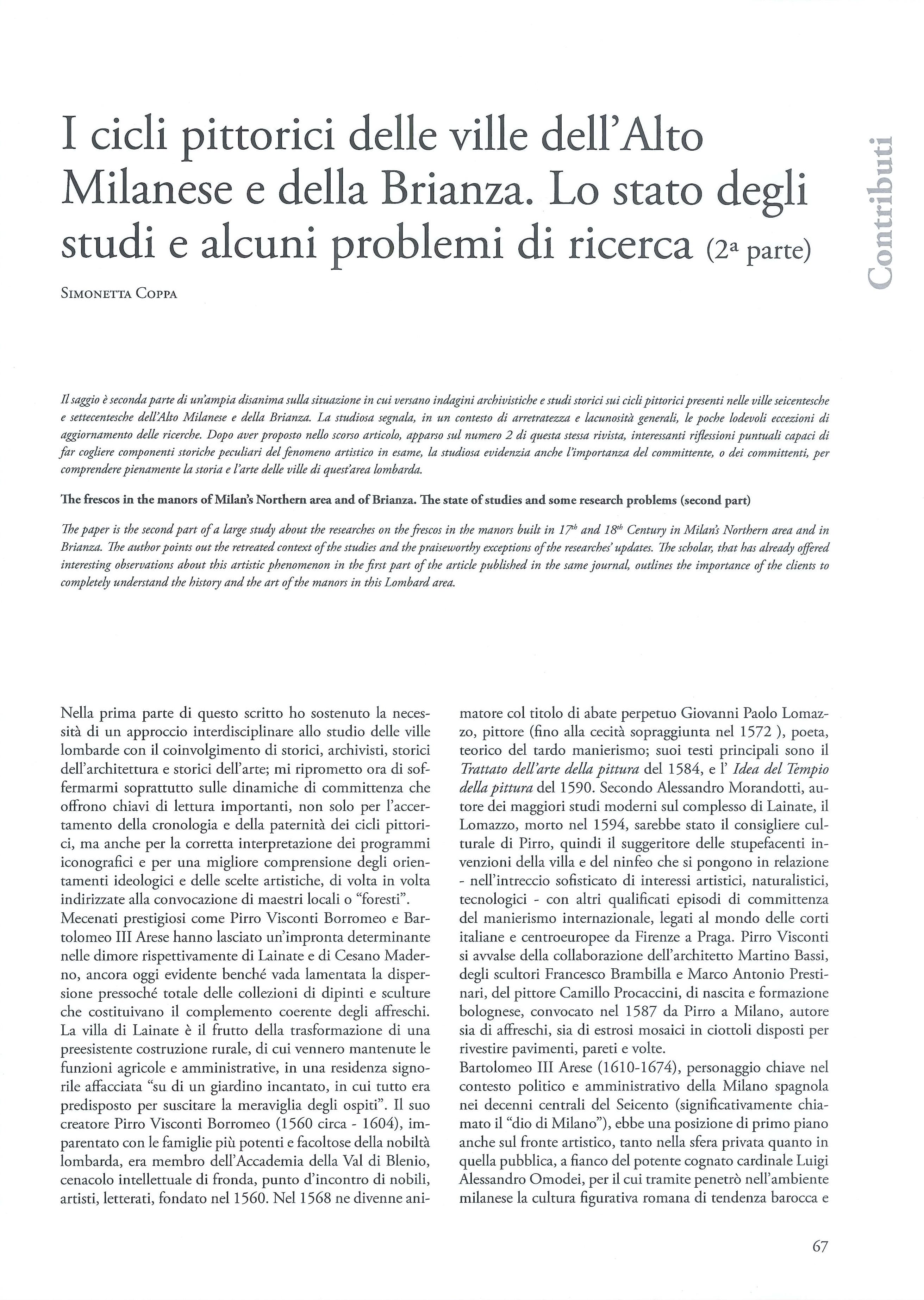 The paper is the second part of a large study about the researches on the frescos in the manors built in 17th and 18th Century in Milan’s Northern area and in Brianza. The author points out the retreated context of the studies and the praiseworthy exceptions of the researches’ updates. The scholar, that has already offered interesting observations about this artistic phenomenon in the first part of the article published in the same journal, outlines the importance of the clients to completely understand the history and the art of the manors in this Lombard area.